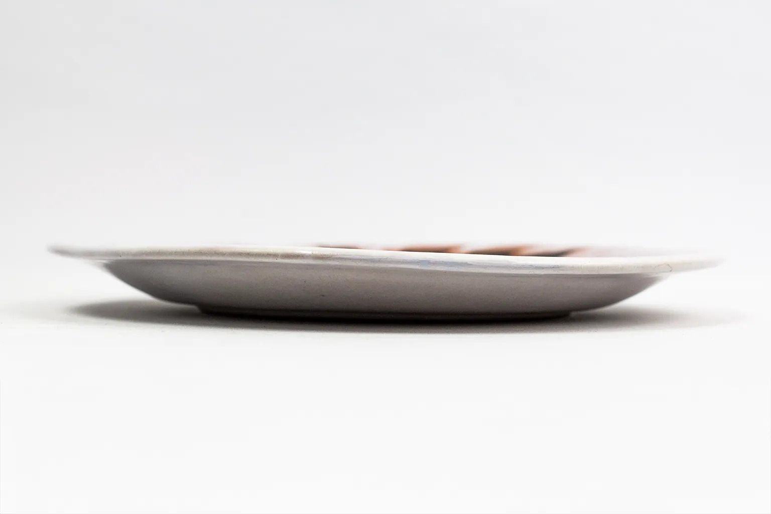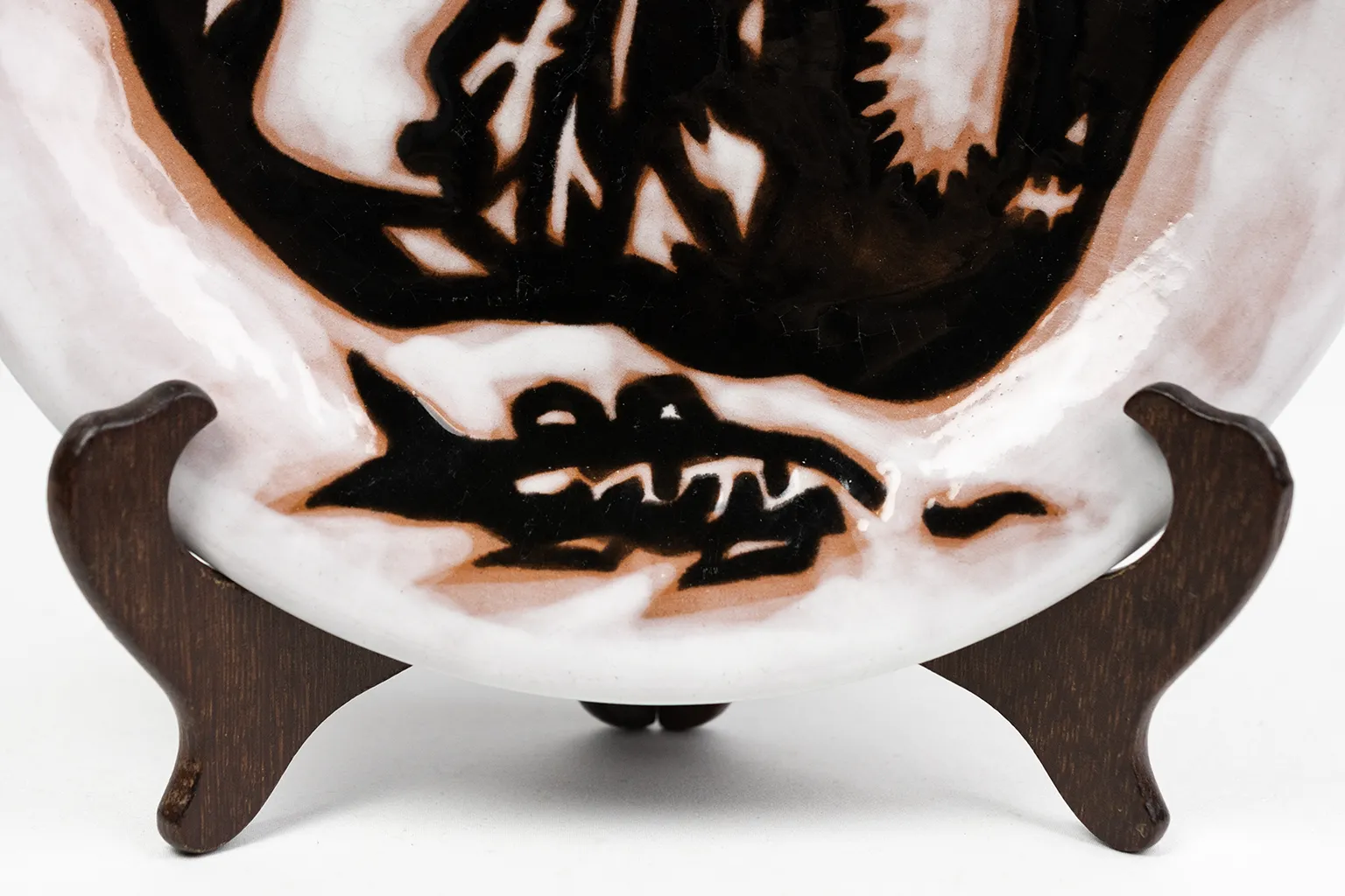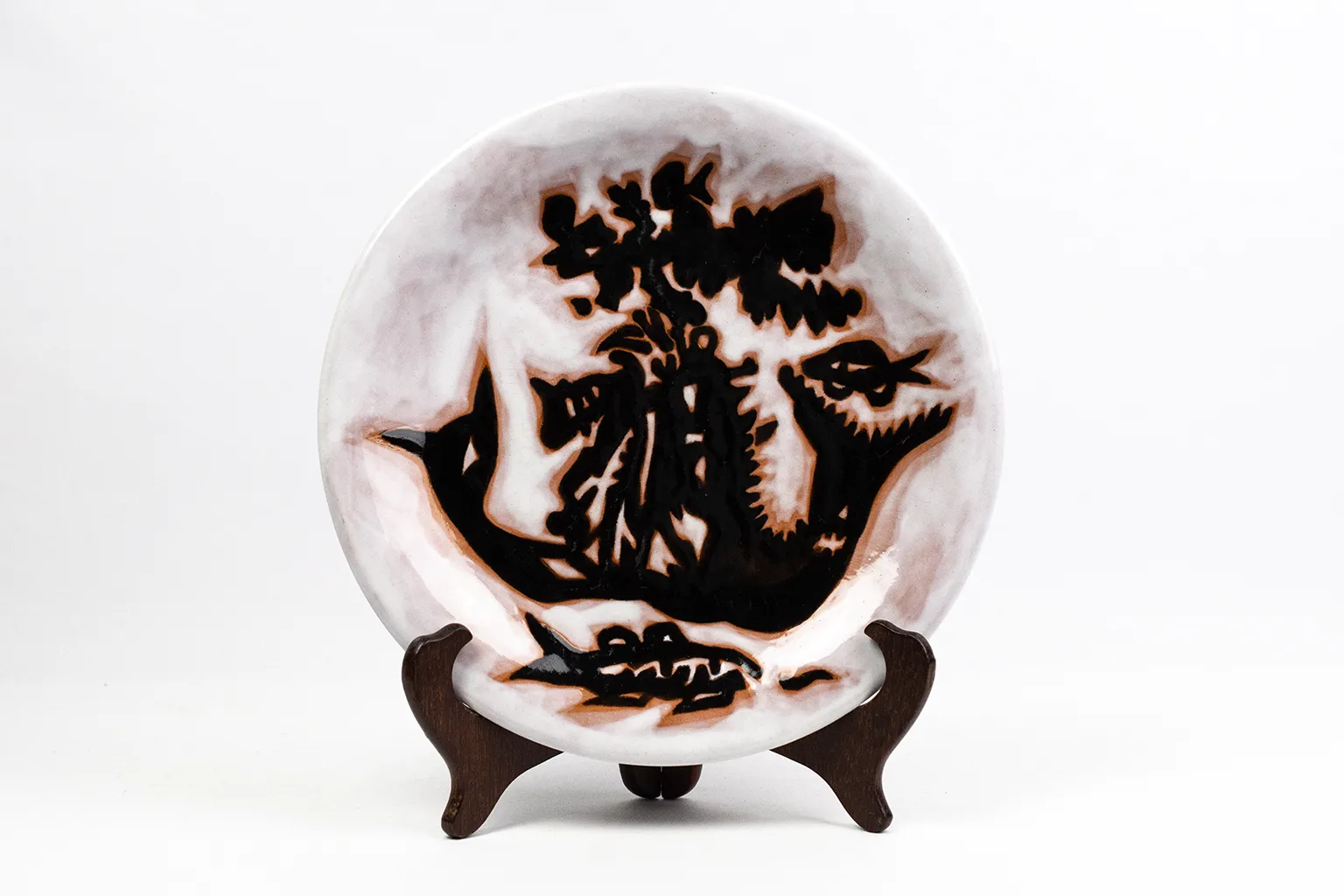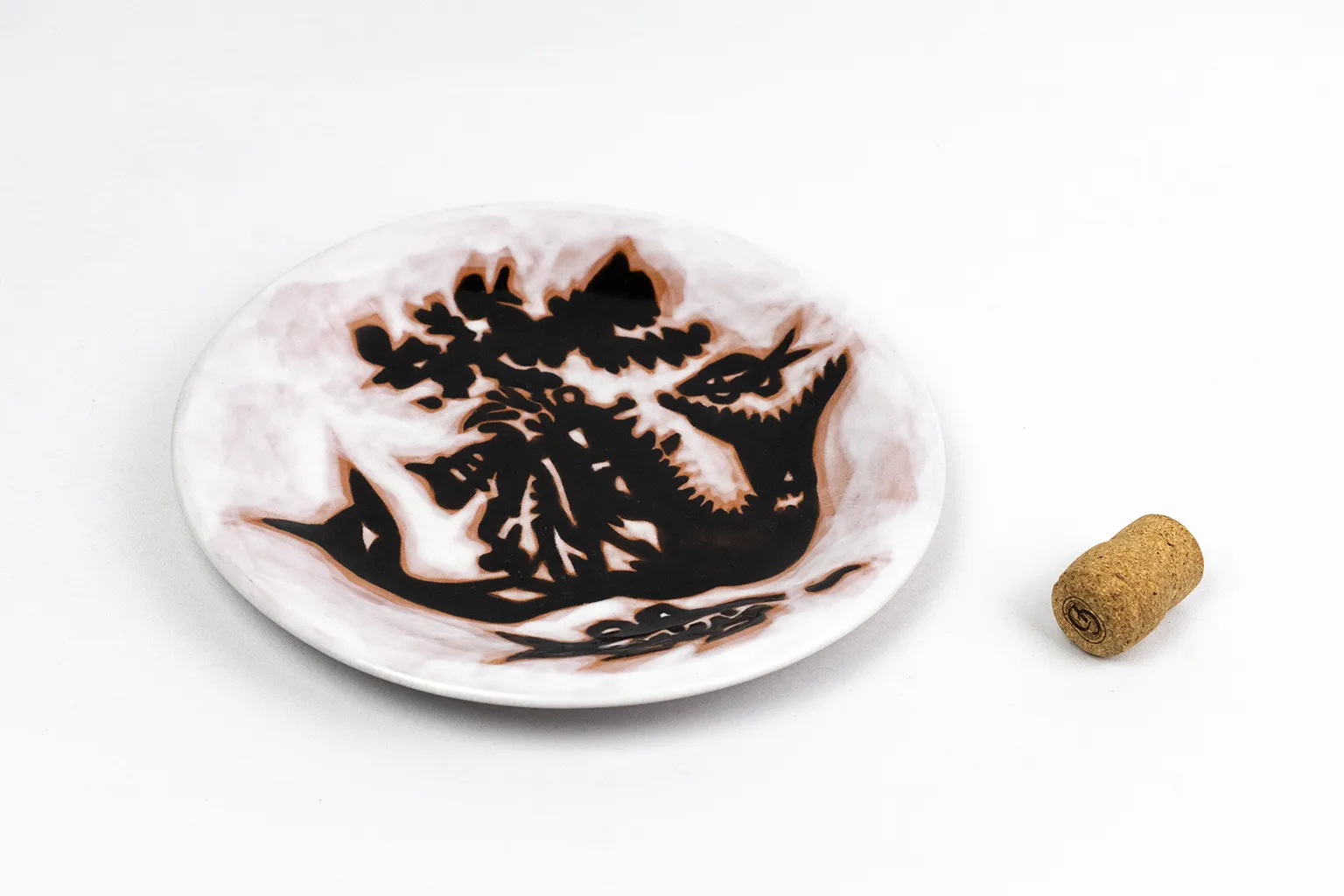 Cette assiette en illustre directement le propos. Le corps céramique, à profil légèrement creux, est couvert d’une couverte blanche marbrée de traînées brun rosé irrégulières, obtenues par l’écoulement de l’émail en cuisson — effet délibéré, caractéristique de la production Sant Vicens. Sur ce fond instable et organique, un décor en émail noir très brillant déploie une composition dense de formes hybrides : feuillages découpés en silhouette, corps de sirènes entrelacés, tiges ramifiées, poissons stylisés… Ce répertoire de formes correspond au modèle communément désigné sous le titre « Les Sirènes » dans les ventes spécialisées en céramique Lurçat — appellation du marché secondaire, non confirmée à ce jour par une source d’archives primaires. La ligne noire, large et tranchante, joue à la fois comme contour et comme masse, laissant le fond blanc en réserve dans les interstices. L’effet produit est proche d’un découpé sur papier directement transposé en émail.