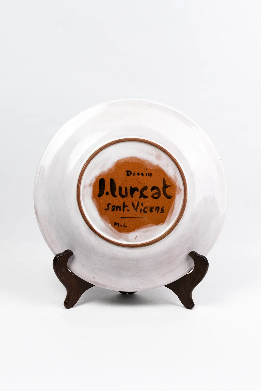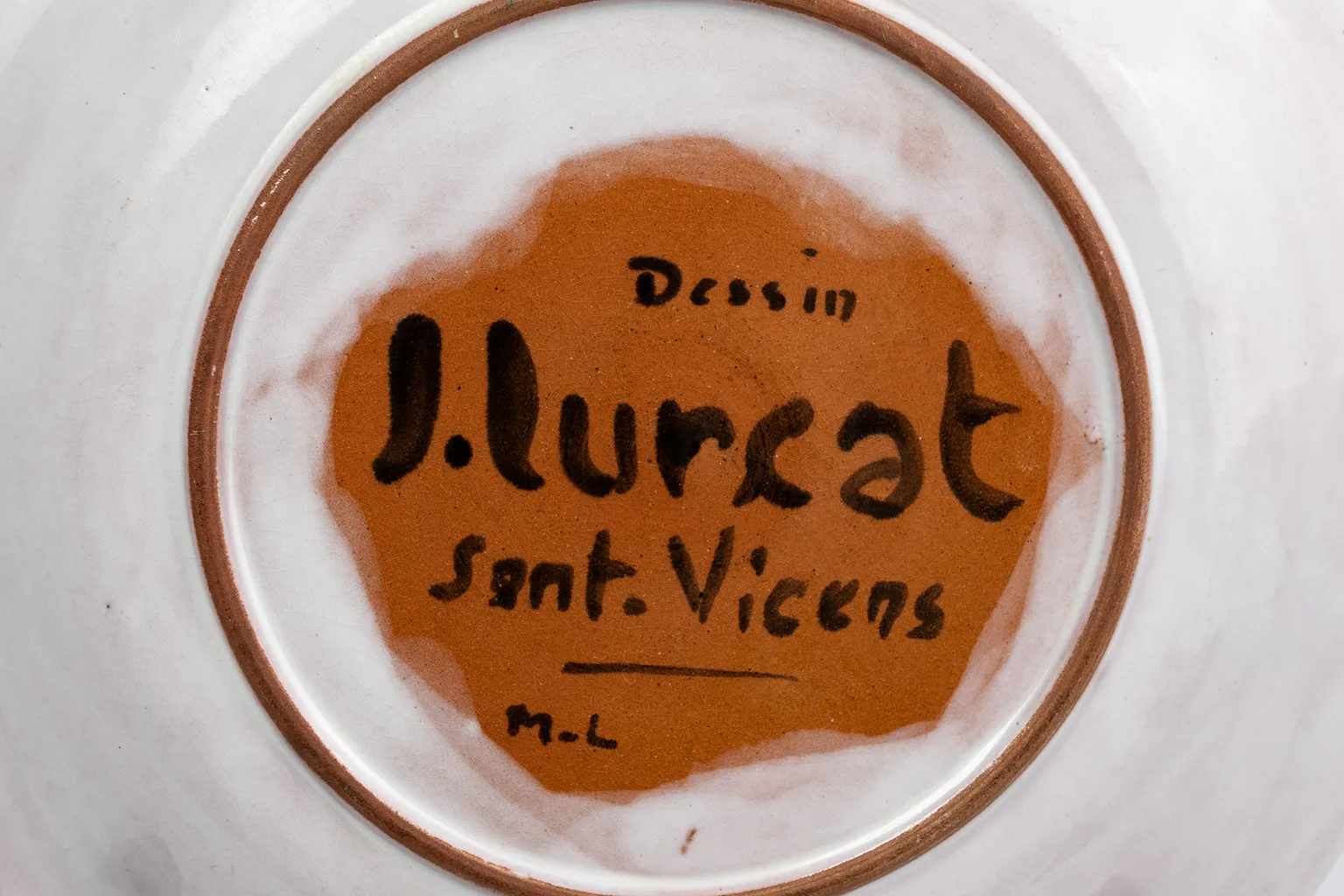 Au revers, sur un fond de couverte brun ocre laissant le corps céramique visible, la marque peinte à la main indique : Dessin / J. Lurçat / Sant. Vicens / M.L. La mention Dessin J. Lurçat est la formulation caractéristique des pièces éditées par Sant Vicens d’après les dessins de l’artiste, qui distingue les éditions en série limitée des pièces originales uniques. Les initiales M.L correspondent vraisemblablement à une référence de tirage interne à l’atelier.