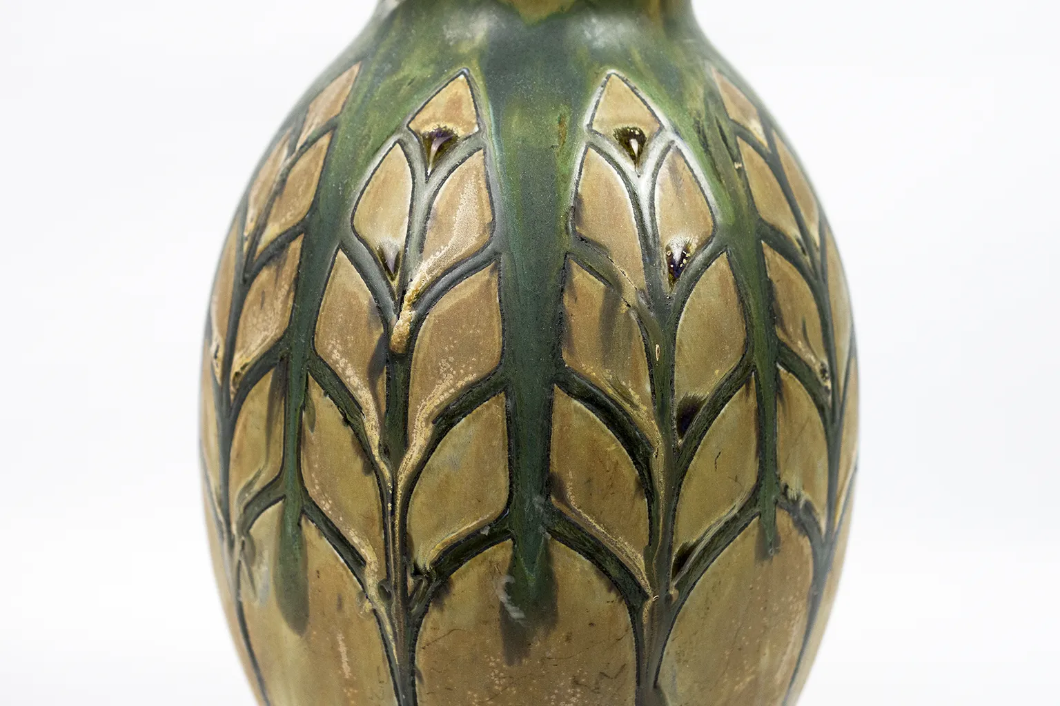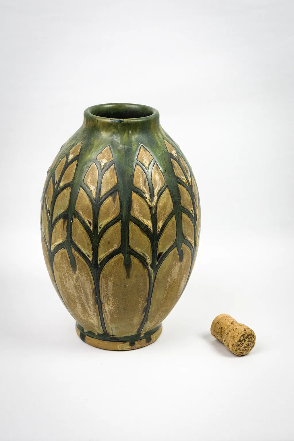 La forme 899, aux volumes équilibrés et au col resserré, met en valeur le décor 638, composé de motifs végétaux stylisés traités en coulures d’émail. Cette technique, où la matière s’écoule librement sur la panse, témoigne de la maîtrise du feu et de la recherche d’effets de texture et de brillance chère à Catteau.
