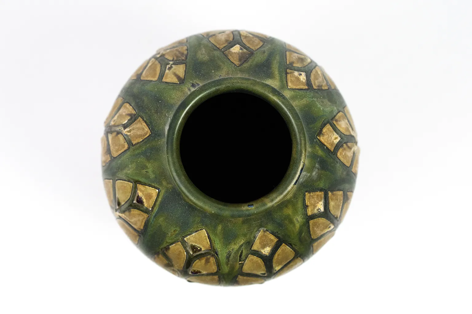 Réalisé vers 1930, il illustre la période la plus inventive du créateur, lorsque l’atelier de fantaisie qu’il dirigeait pour Boch explorait les possibilités décoratives des grès émaillés polychromes, un matériau noble, dense et expressif, emblématique de l’Art Déco belge.