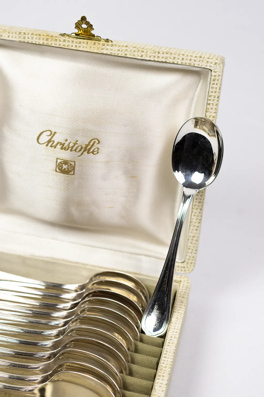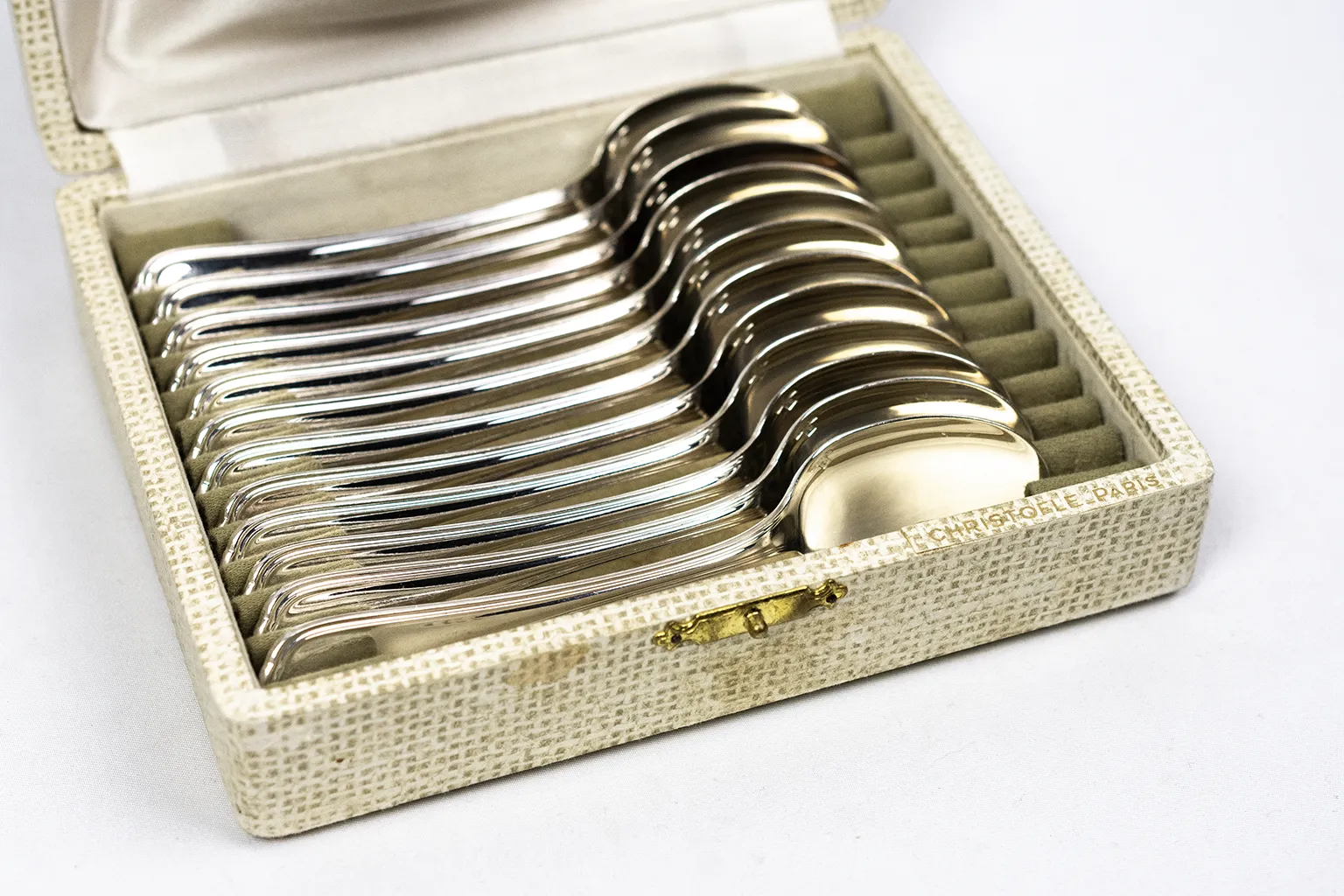 L’ensemble est conservé dans son écrin d’origine, gainé d’un textile clair et marqué au nom de Christofle à l’intérieur du couvercle. La présence du coffret participe de la cohérence du service et de sa présentation.