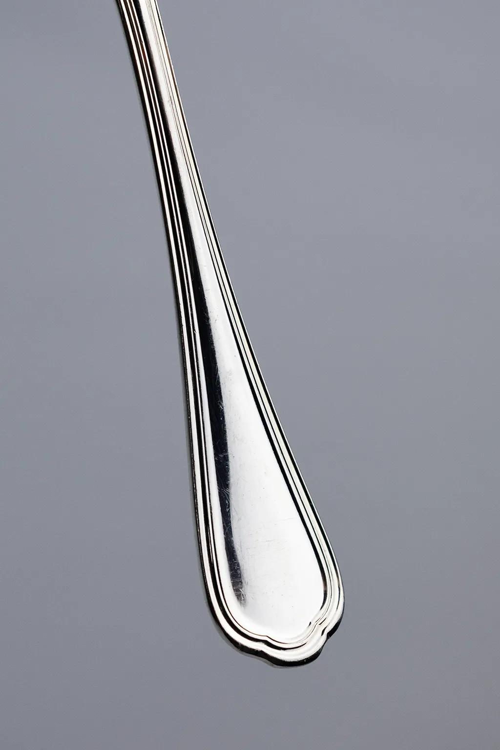 Le manche adopte une spatule allongée, légèrement élargie à son extrémité, ourlée d’un double filet qui accompagne la courbe sans surcharge décorative. L’équilibre du galbe et la netteté du contour traduisent une esthétique héritée du XVIIIᵉ siècle, réinterprétée au XIXᵉ par l’orfèvrerie industrielle naissante.