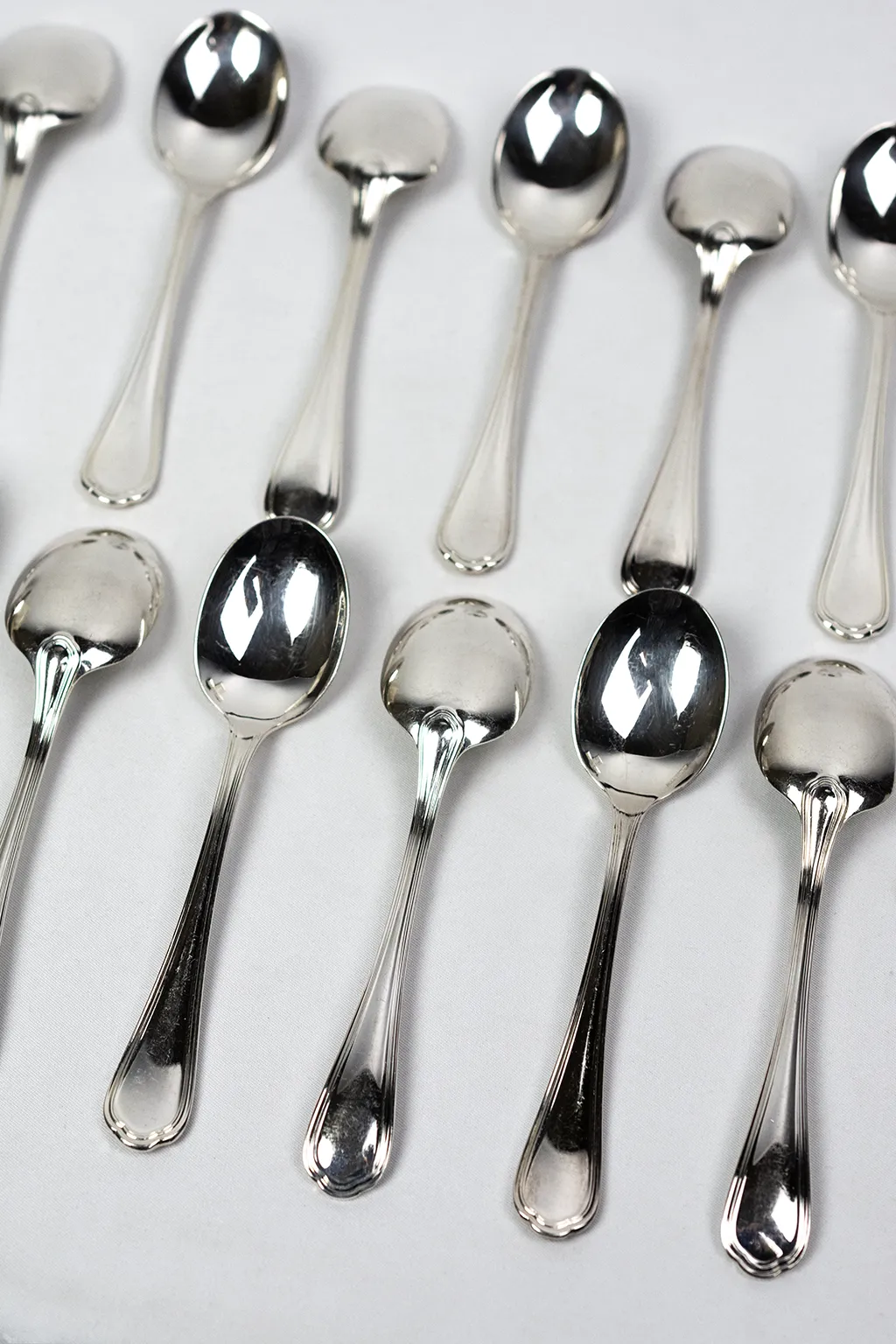 Les cuillères mesurent 13 cm de longueur (la version actuellement commercialisée est donnée pour 14 cm sur le site Christofle, ce qui peut correspondre à une évolution ou à une variation de production). L’état présente de légères traces d’oxydation et des marques d’usage conformes à leur destination.