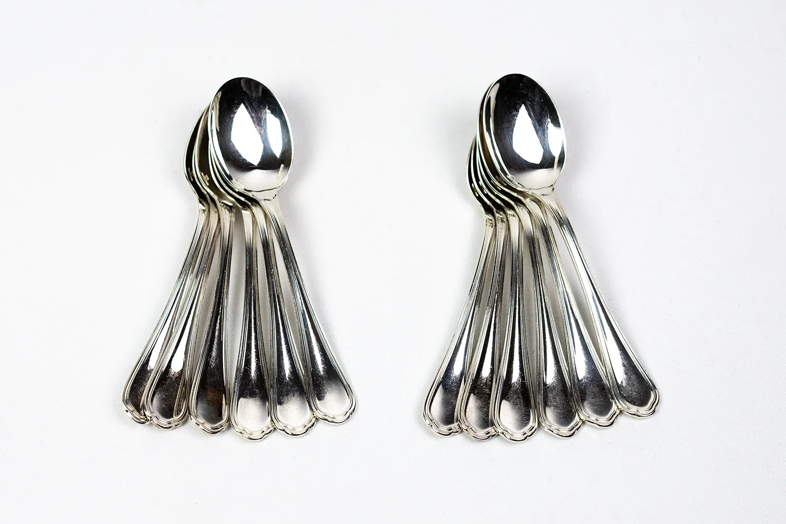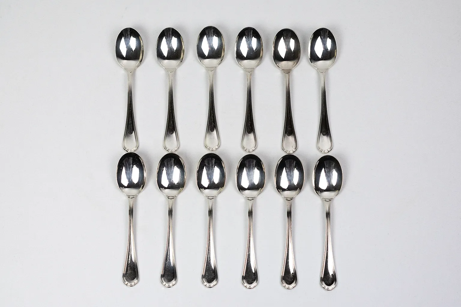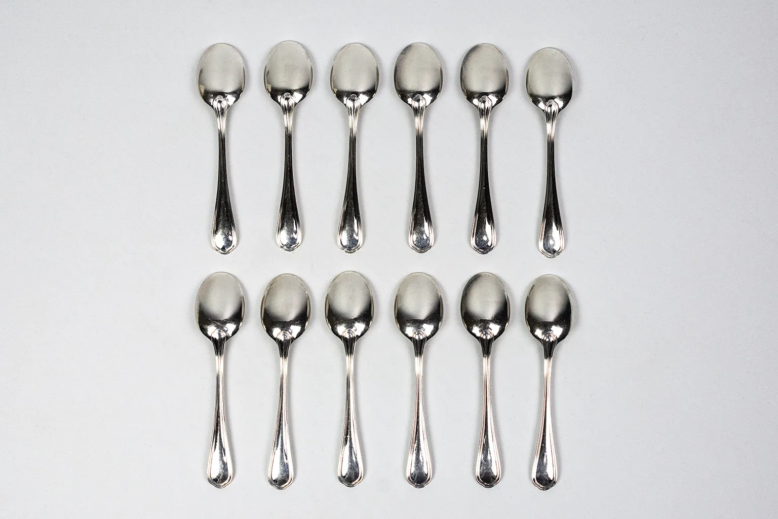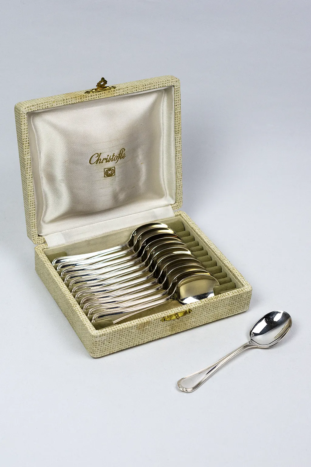 Ce service de douze cuillères à café en métal argenté appartient au modèle Spatours de la maison Christofle.
