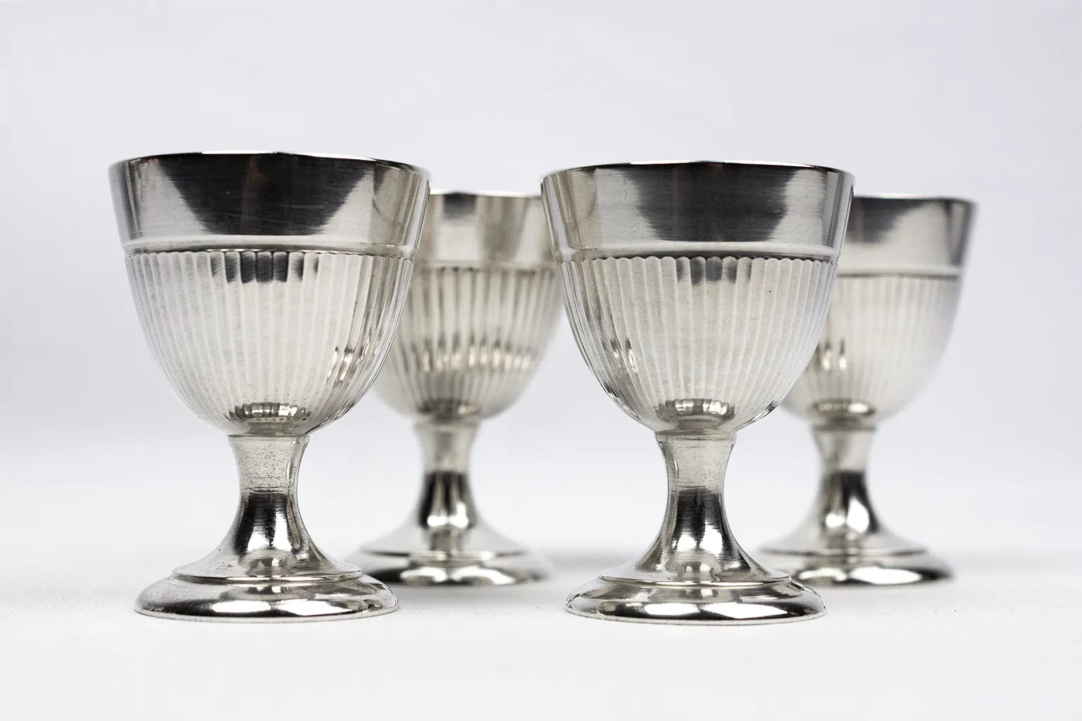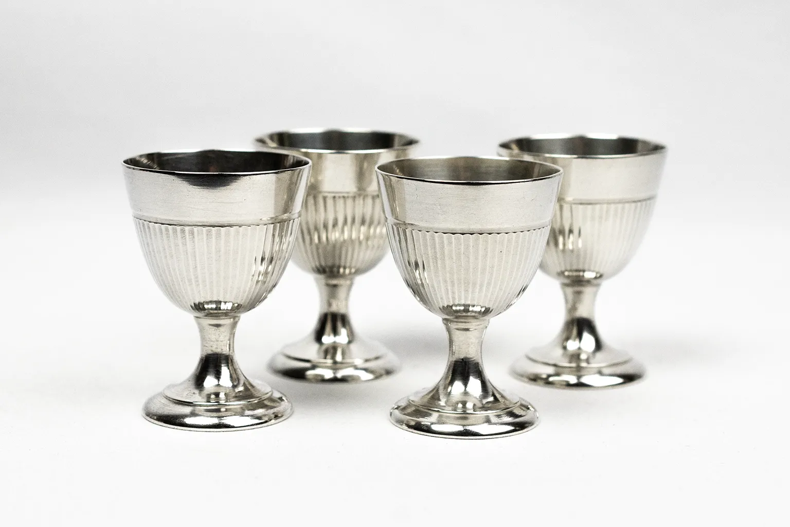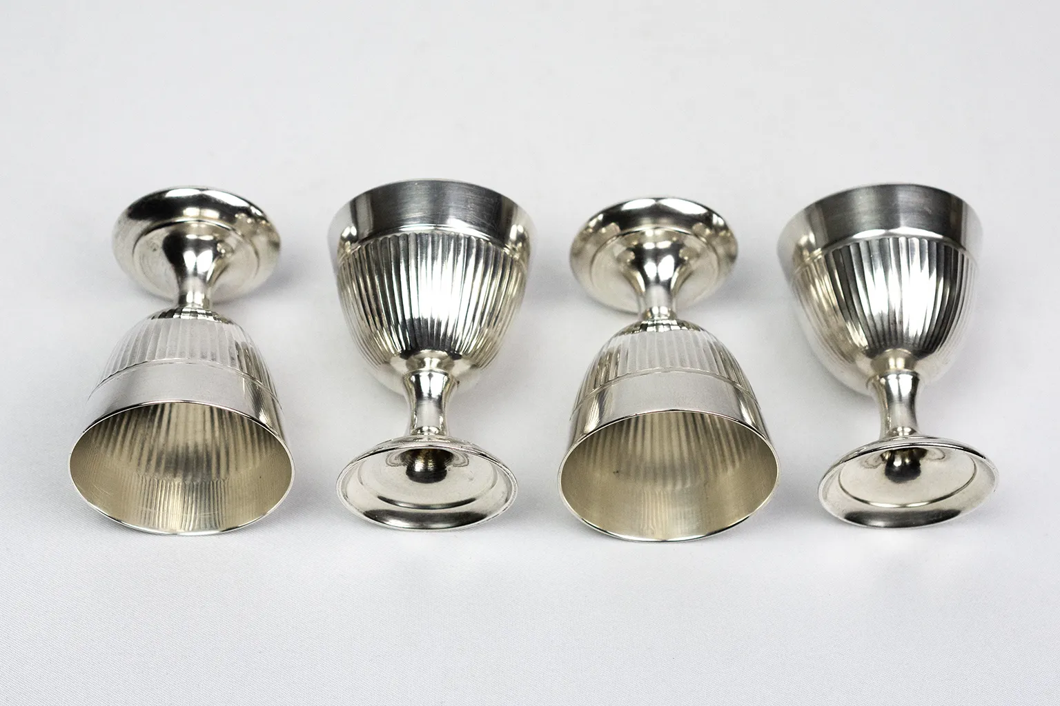 Chaque coquetier adopte une forme de petit gobelet sur piédouche, assurant une bonne stabilité à table. La panse est animée d’un décor de cannelures verticales, régulier et discret, qui capte la lumière sans ostentation. Ce motif, fréquent dans les arts de la table du XXᵉ siècle, permet de rythmer la surface tout en soulignant la justesse des proportions. Le col lisse, légèrement évasé, crée une transition nette avec la partie cannelée et facilite la prise en main.