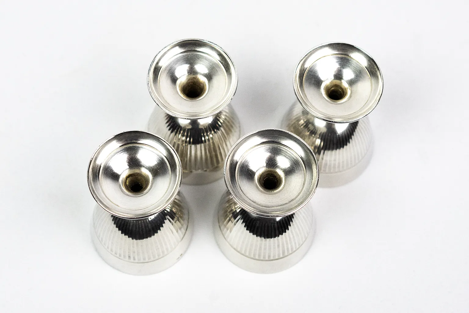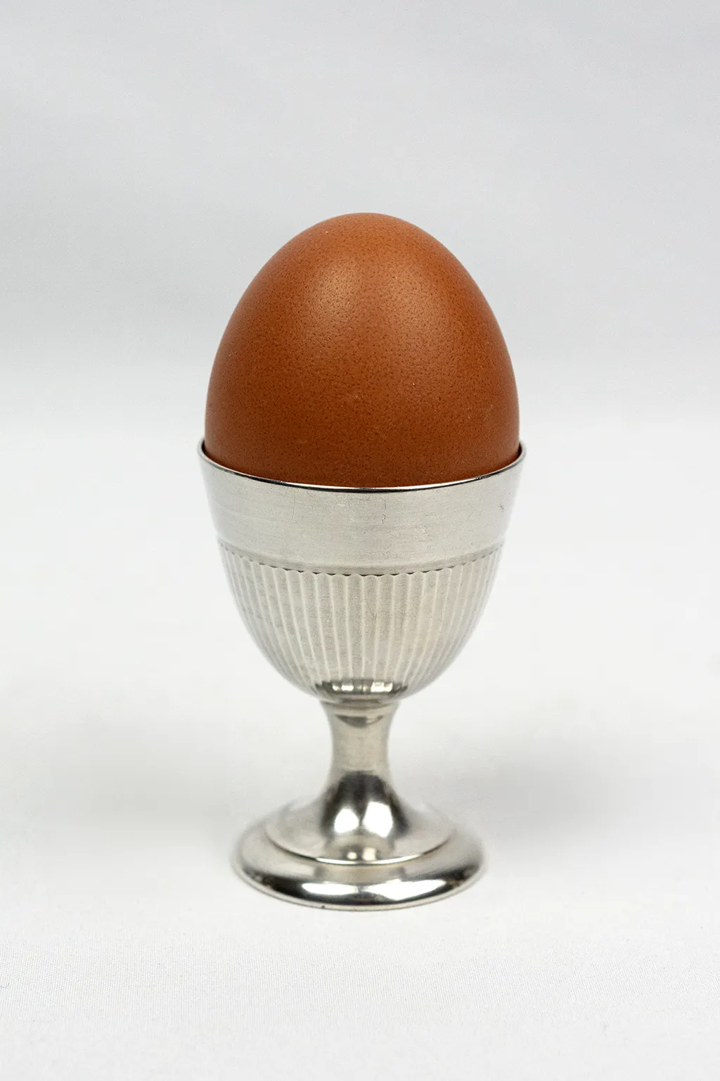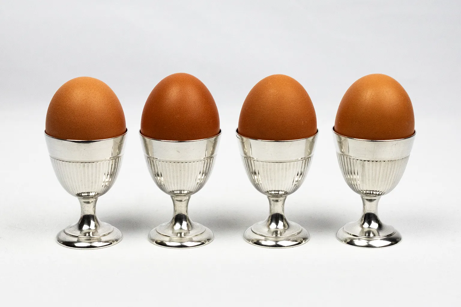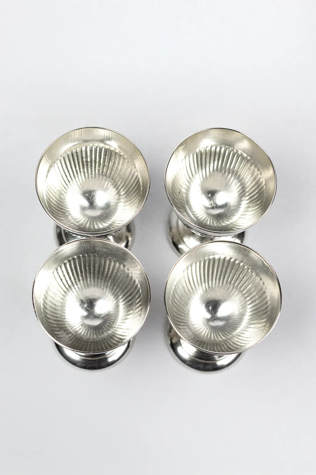 Chaque coquetier adopte une forme de petit gobelet sur piédouche, assurant une bonne stabilité à table. La panse est animée d’un décor de cannelures verticales, régulier et discret, qui capte la lumière sans ostentation. Ce motif, fréquent dans les arts de la table du XXᵉ siècle, permet de rythmer la surface tout en soulignant la justesse des proportions. Le col lisse, légèrement évasé, crée une transition nette avec la partie cannelée et facilite la prise en main.