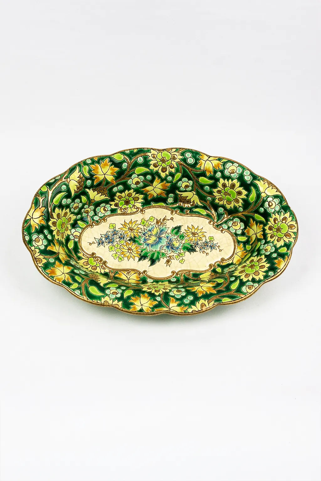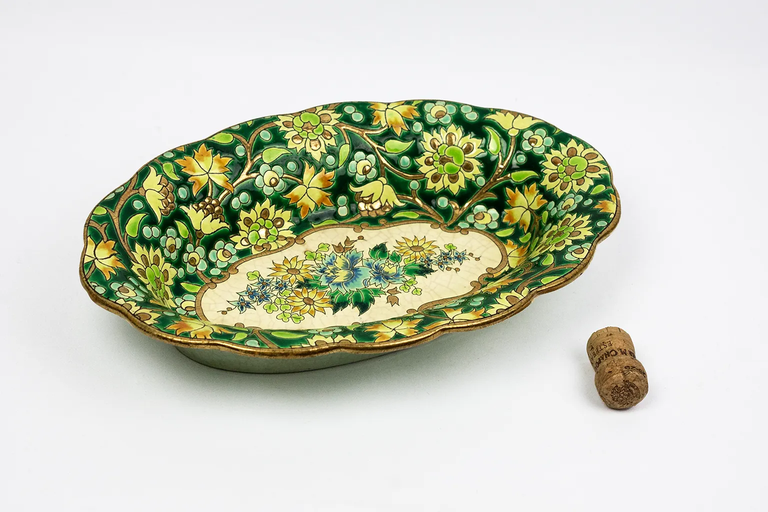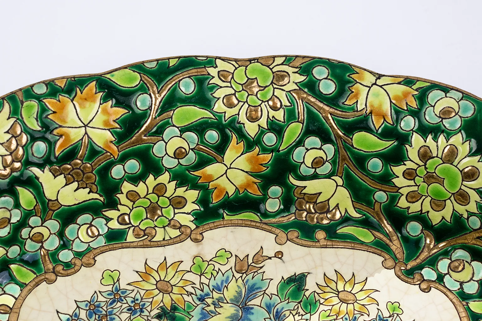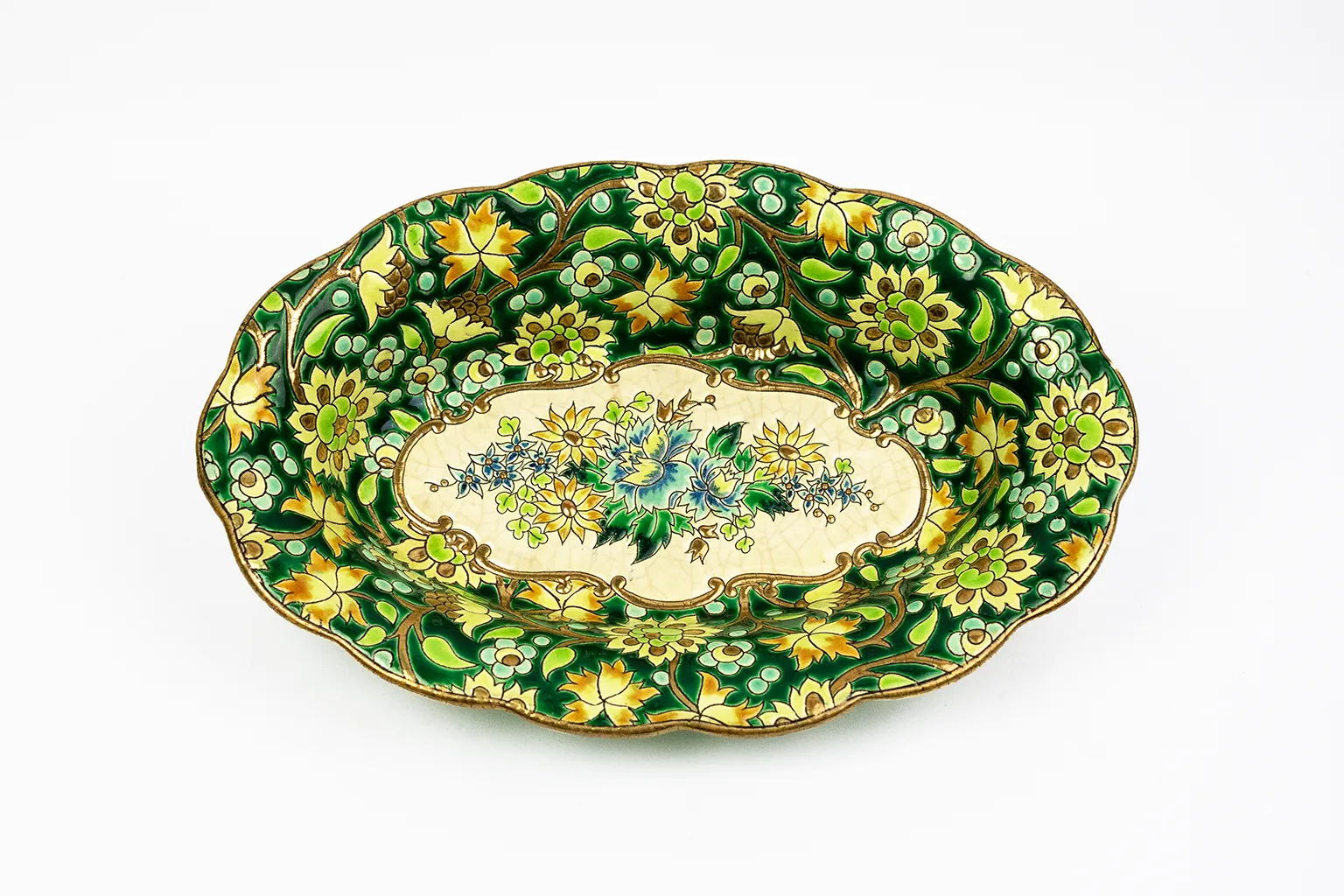 Coupe ovale en faïence de Longwy, décorée à la main en émaux cloisonnés polychromes et rehaussée d’or. Motifs floraux sur fond vert, forme mouvementée. 34 cm.