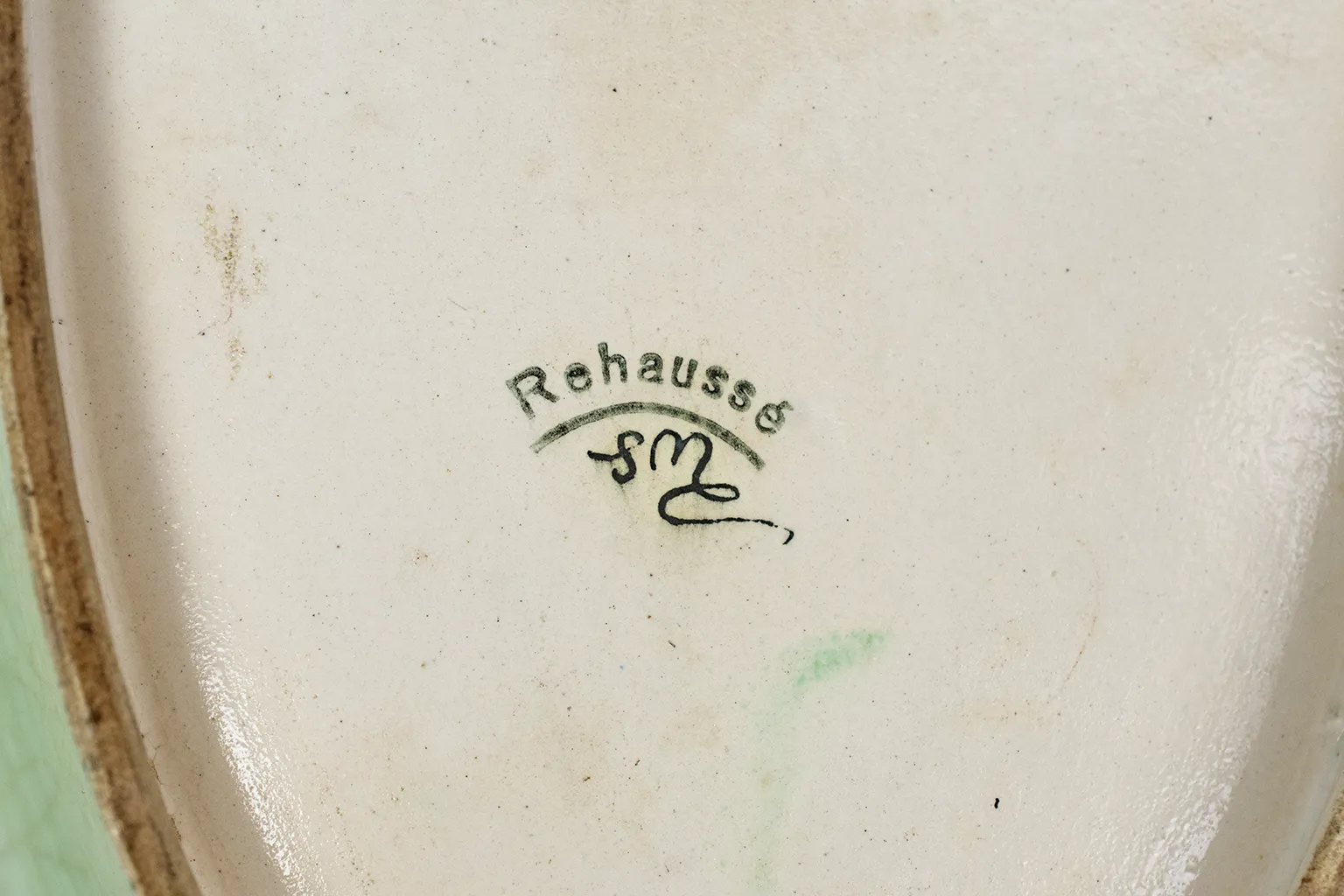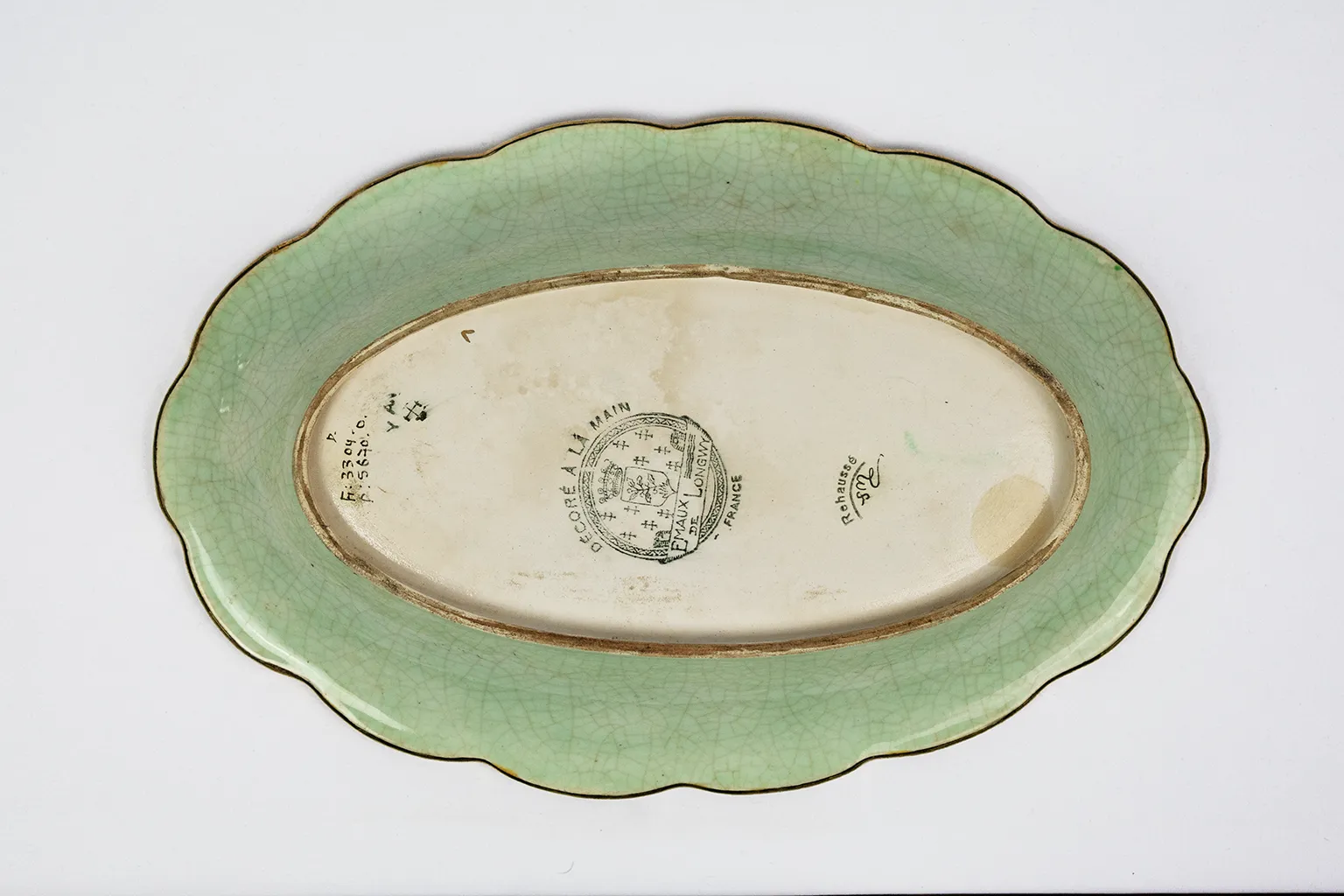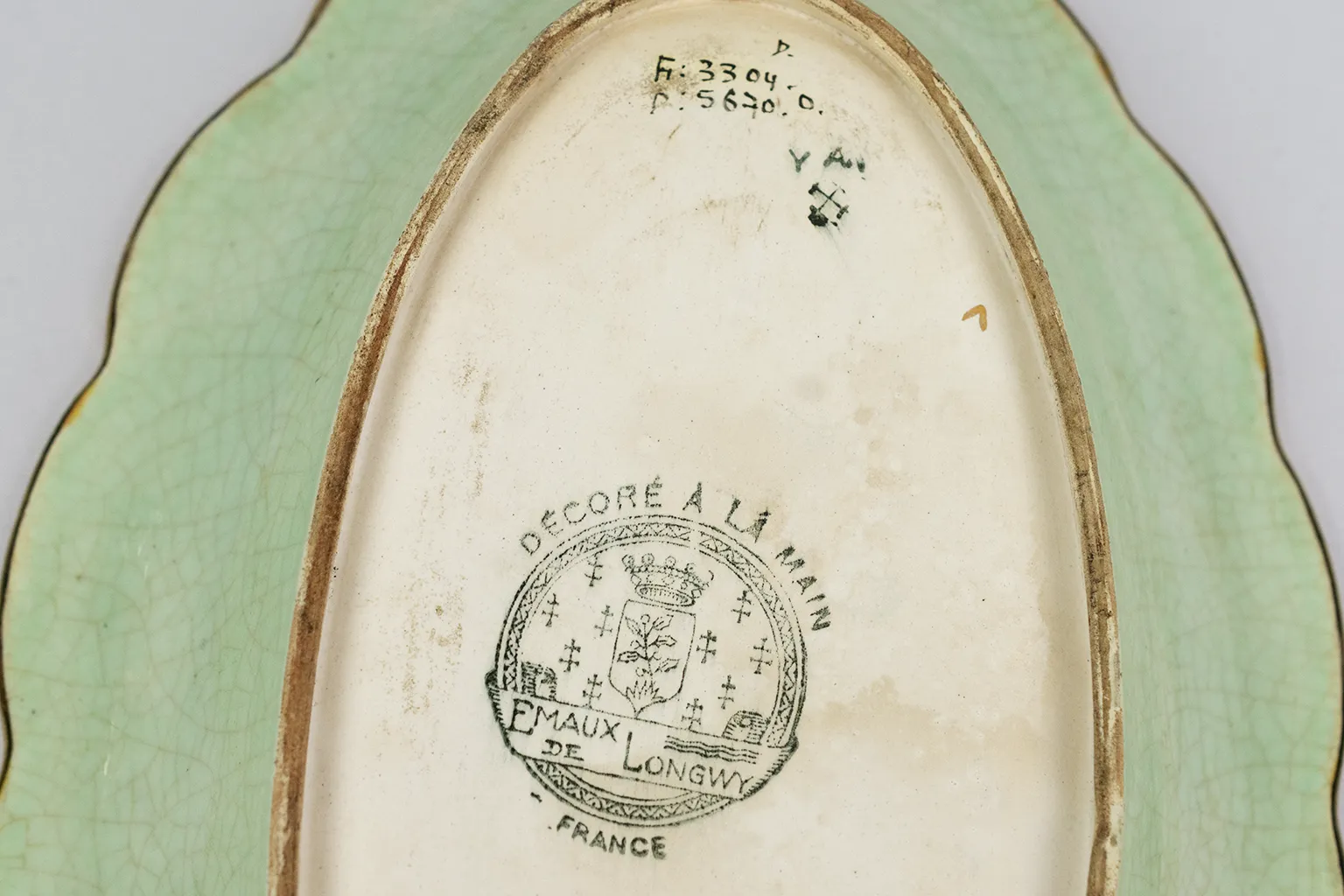 Le revers porte la marque aux dix croix de Lorraine, utilisée par la manufacture de 1920 à 1977, qui atteste l’origine et la période de production. On y lit également la mention “Rehaussé” suivie du monogramme SM, identifié grâce aux archives des réhausseurs de Longwy comme celui de Simone MASSON, active entre 1946 et 1950. Ce détail permet d’attribuer à la pièce une datation beaucoup plus précise, située dans l’immédiat après-guerre. Simone Masson, sœur jumelle de Denise Masson, travaillait alors au rehaut d’or et à la mise en valeur finale des décors, un travail patient et minutieux nécessitant une parfaite maîtrise du geste.