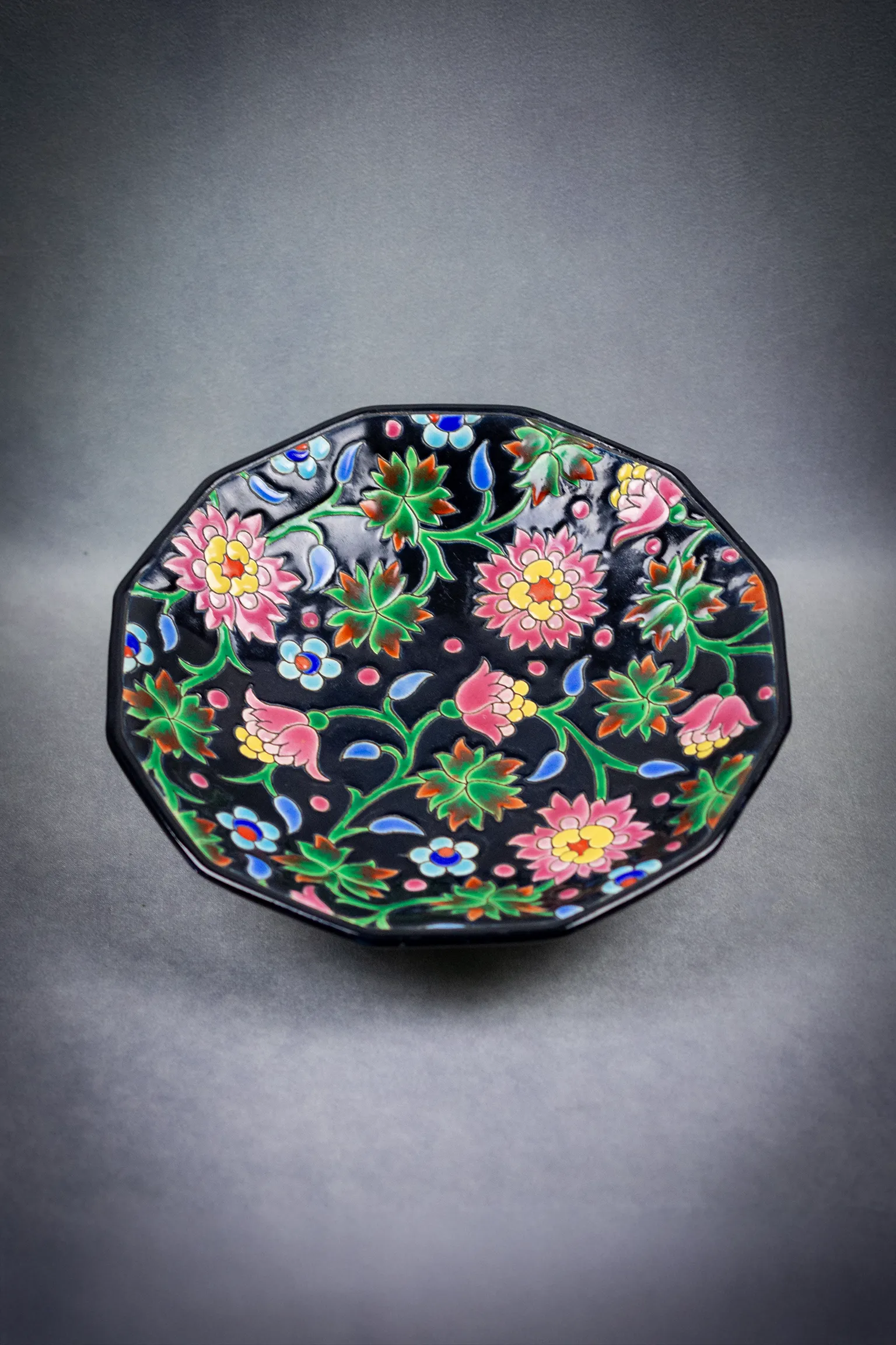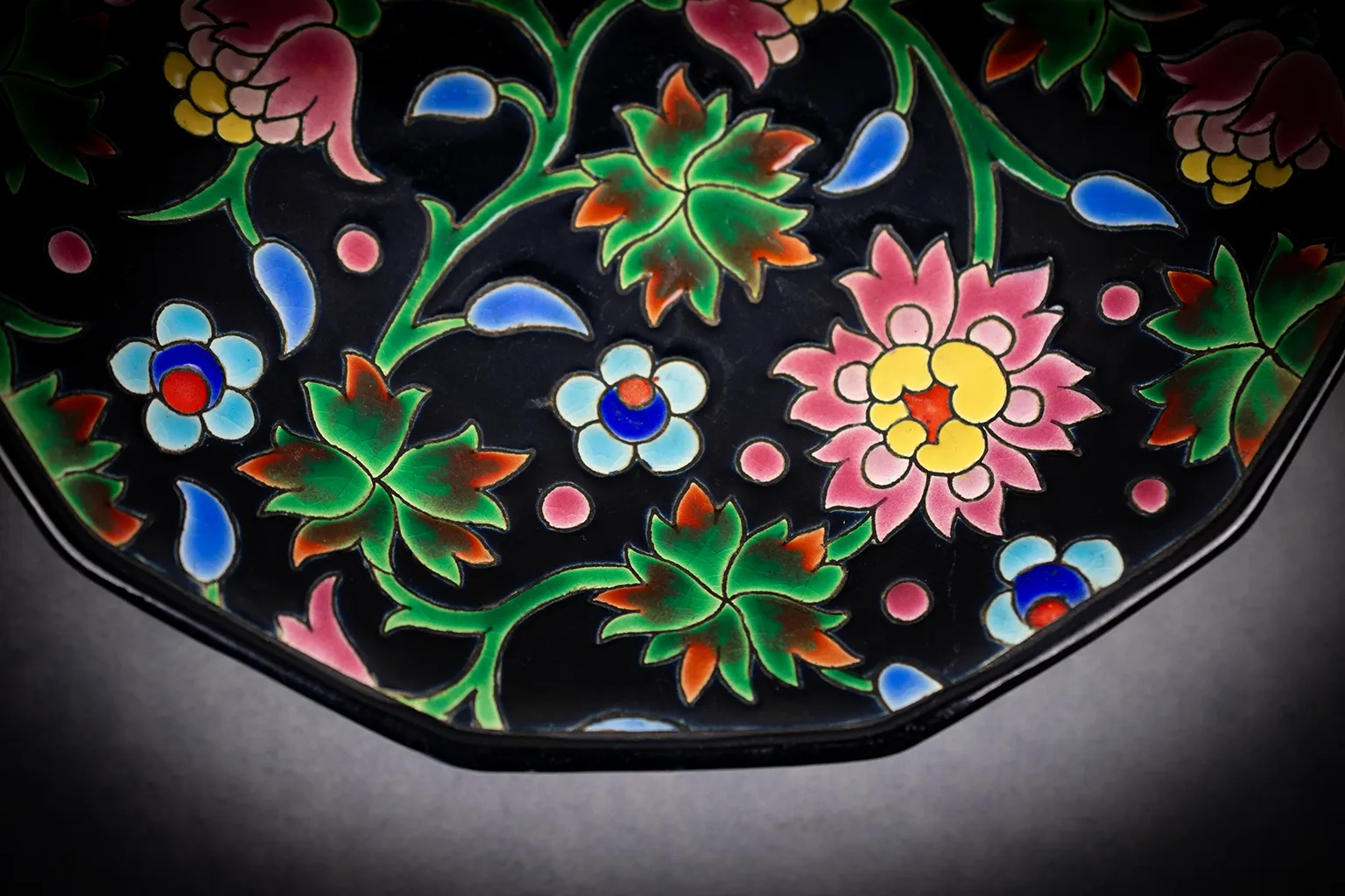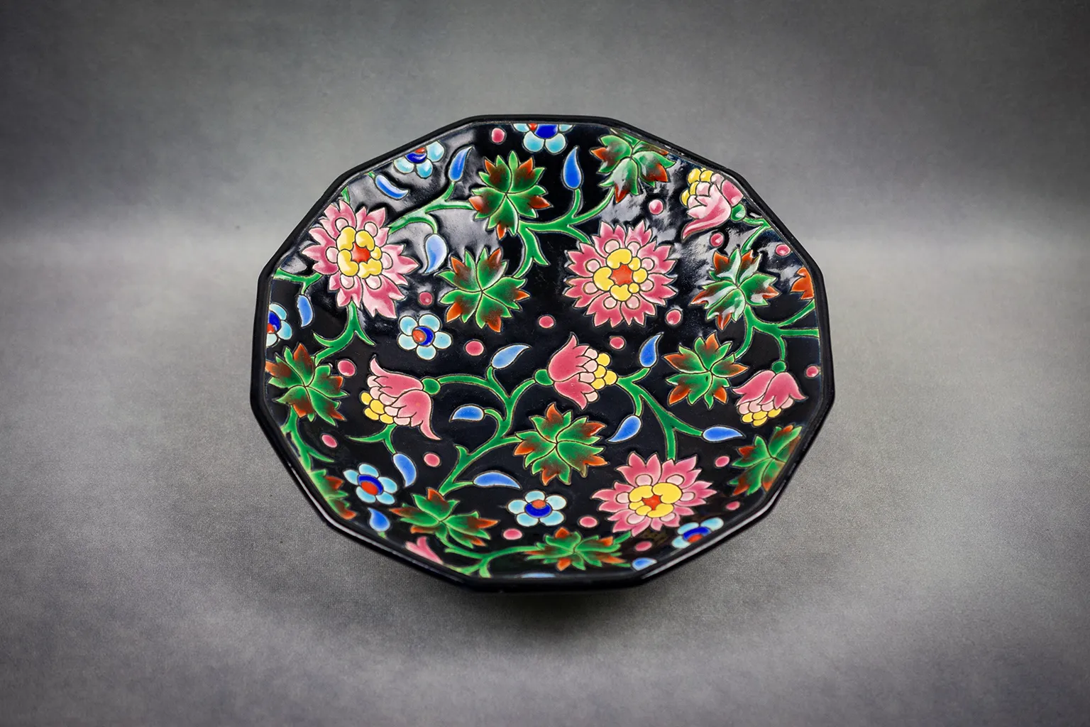 Coupe Émaux de Longwy à pans coupés, décor floral sur fond noir, années 1950