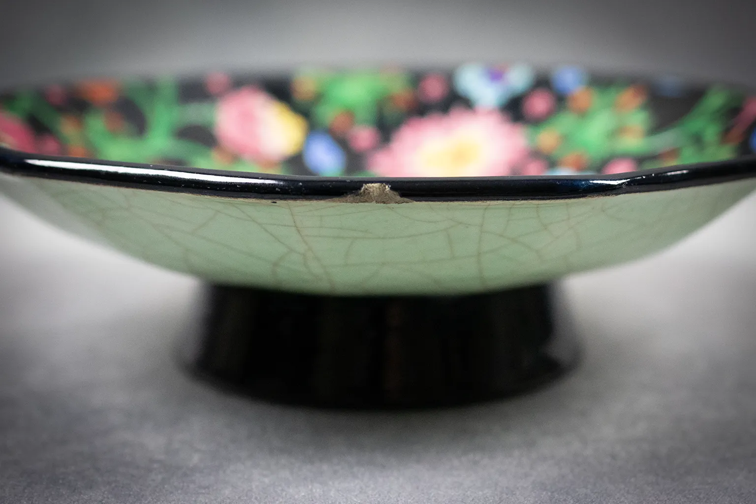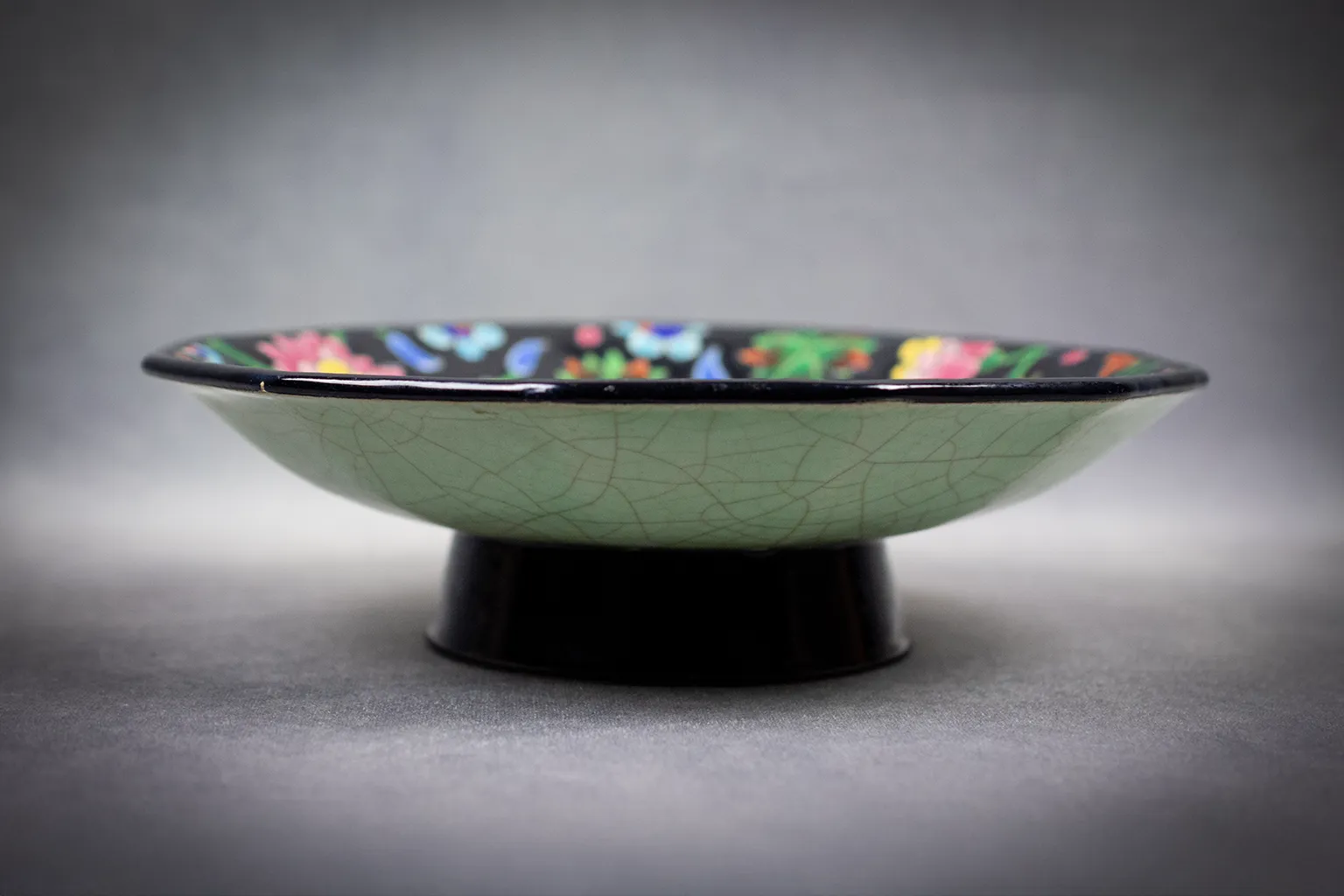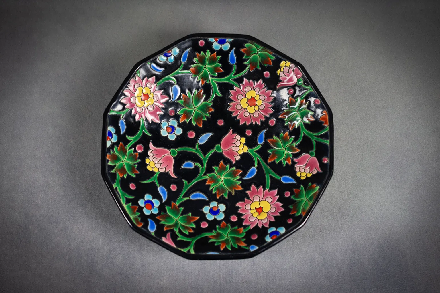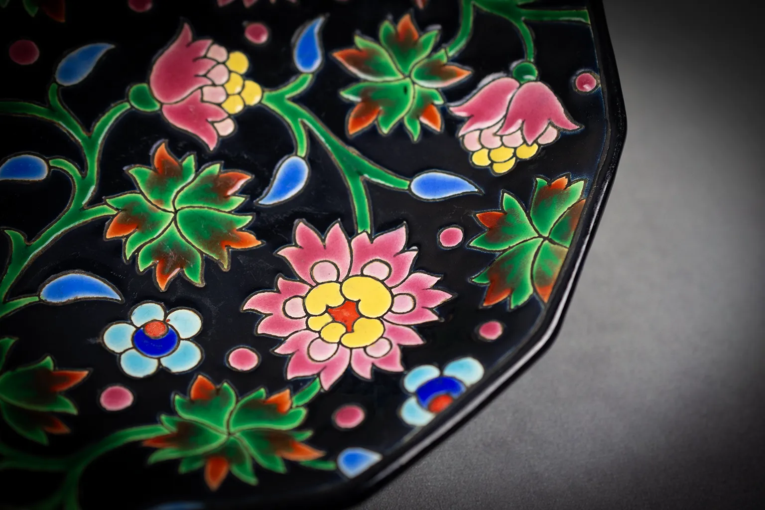 Coupe Émaux de Longwy à pans coupés, décor floral sur fond noir, années 1950