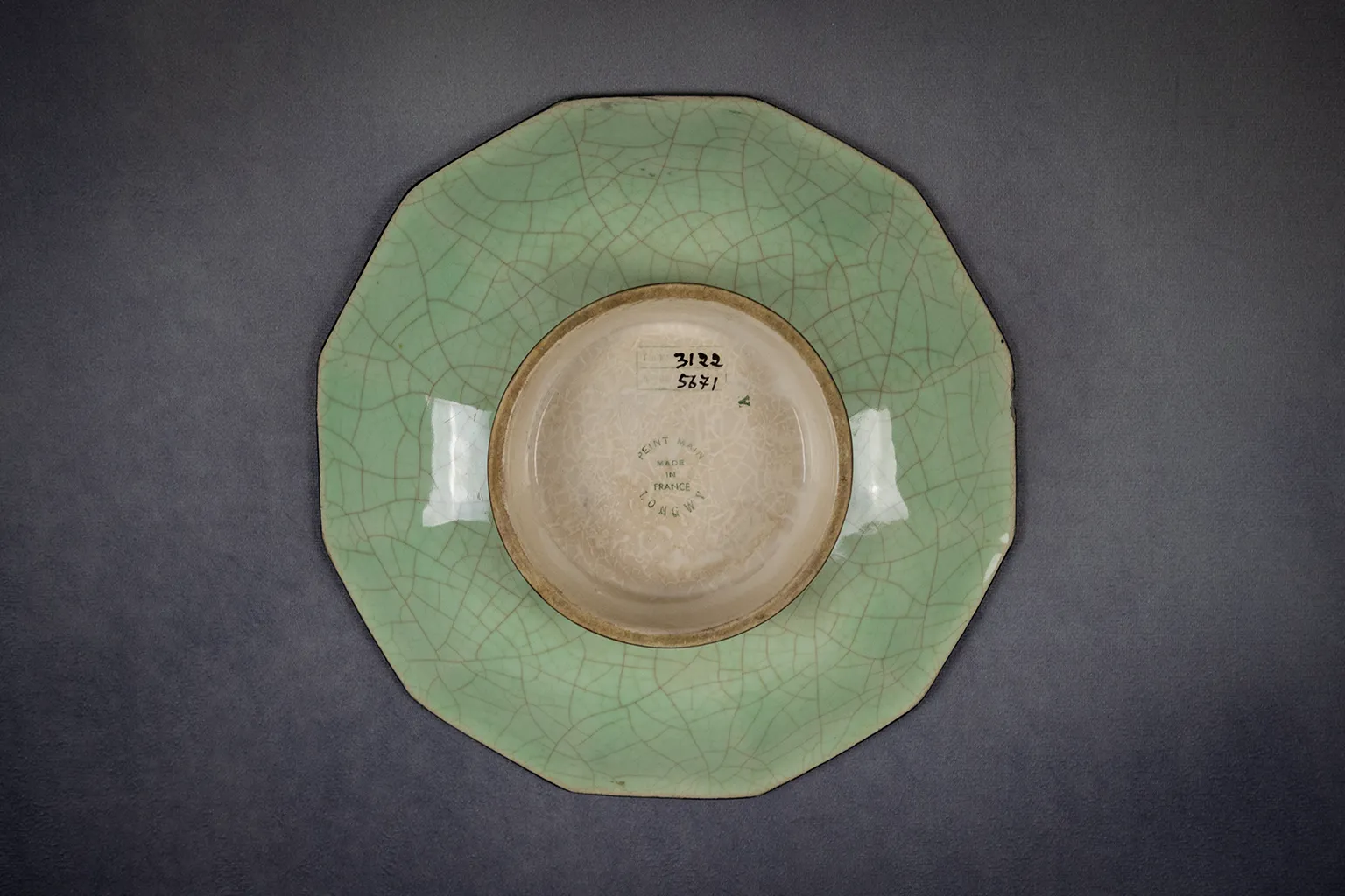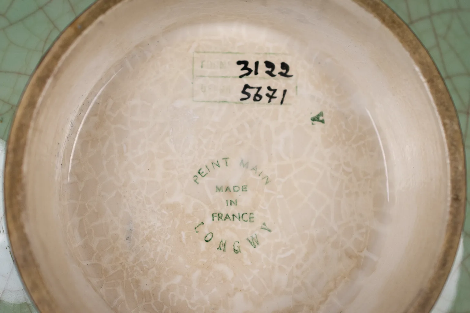 La coupe porte la forme 3122 et le décor 5671, des références propres aux catalogues de la manufacture, et est marquée sous la base avec l’inscription « Peint main, Made in France, Longwy ». Ces marques confirment son authenticité et situent sa production dans les années 1950.