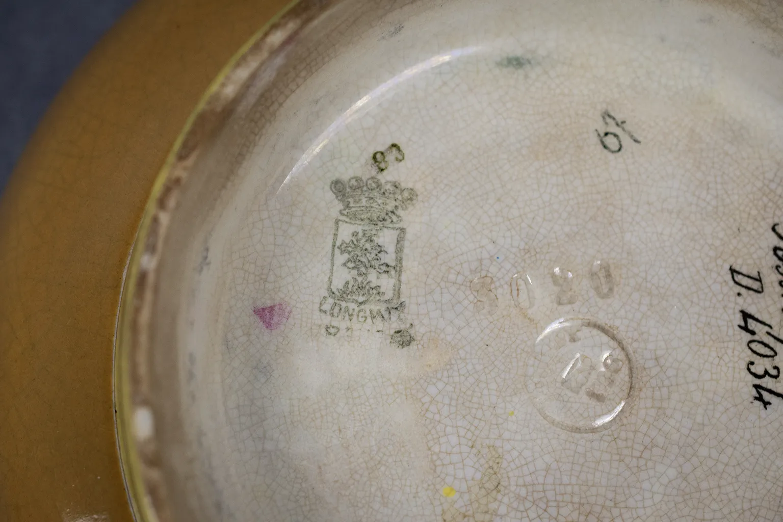 Sous la base, plusieurs marquages attestent de son authenticité : le poinçon au houx, typique des productions de Longwy du début du XXe siècle, ainsi que la numérotation en creux « 3020 » et la référence du décor « D. 4034 ». Ces inscriptions renforcent l’intérêt historique et décoratif de cette coupe, faisant d’elle un objet de collection recherché.