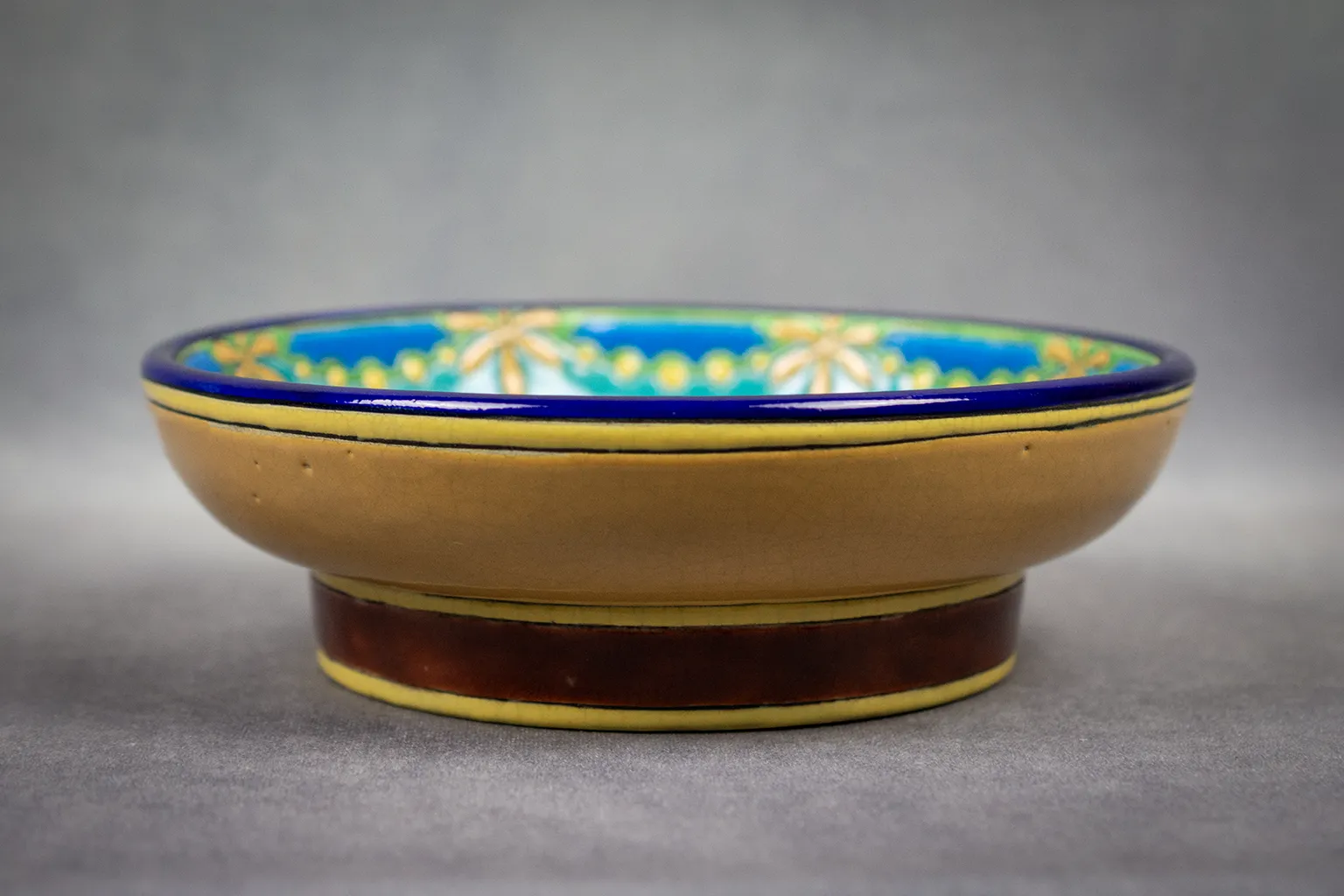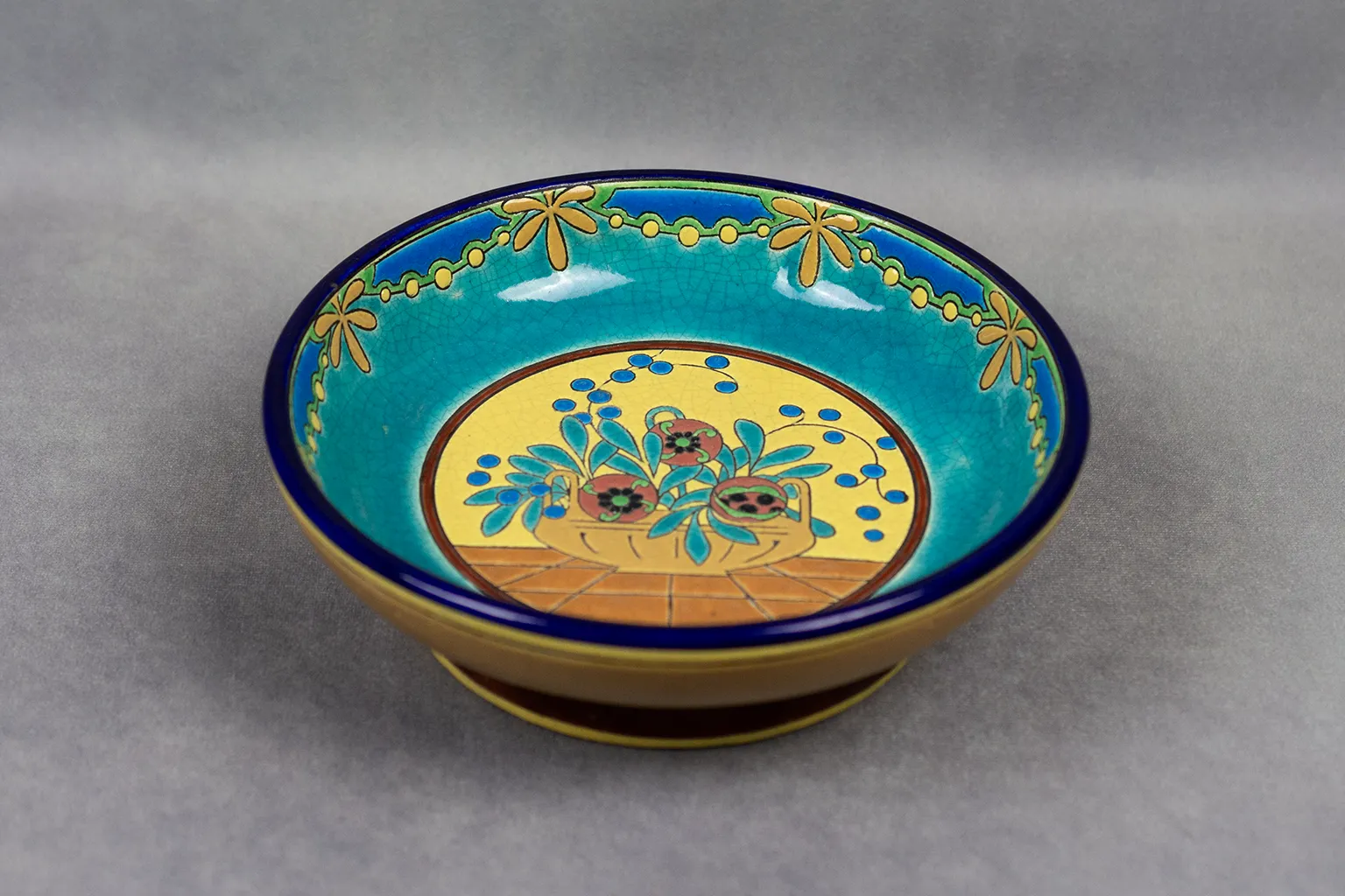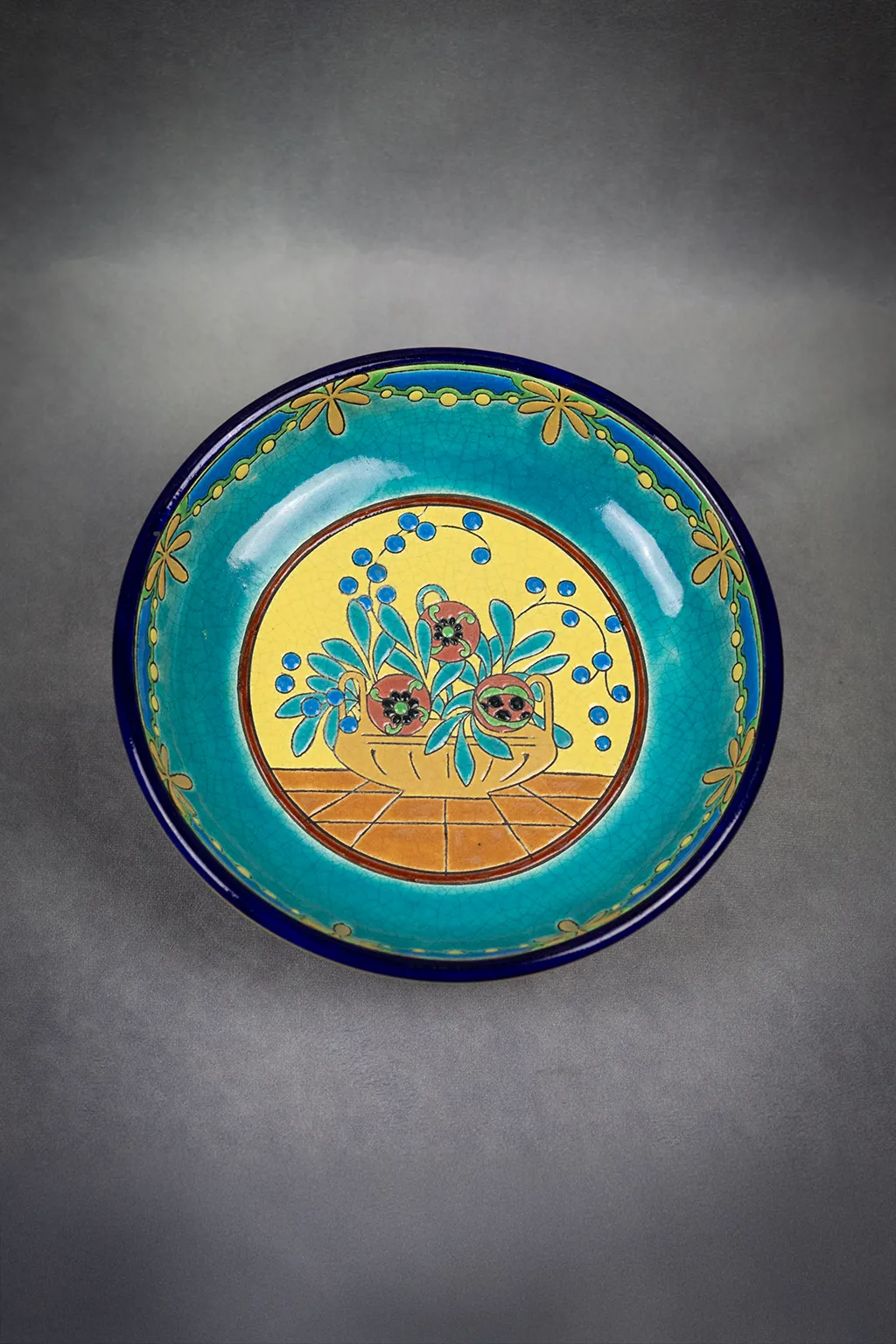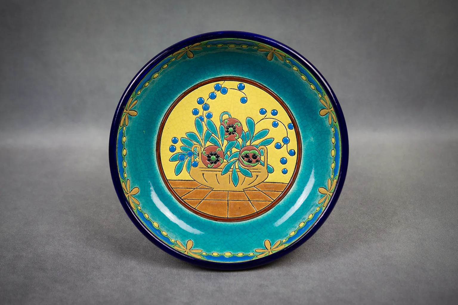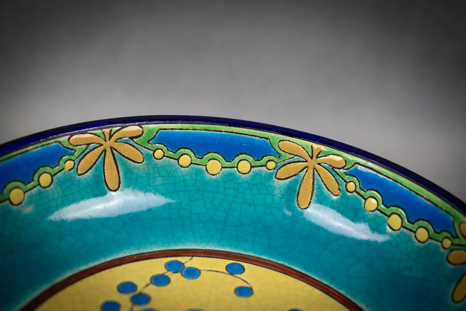 Le décor central représente un panier fleuri stylisé, magnifiquement encadré par un fond jaune éclatant. Ce motif est bordé de guirlandes et de fleurs stylisées qui s’étendent sur un fond bleu turquoise riche et vibrant, caractéristique des productions de Longwy. Le réseau de craquelures, propre aux émaux cloisonnés de la manufacture, ajoute une texture visuelle unique et témoigne de la qualité de la pièce.