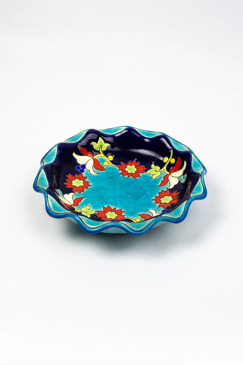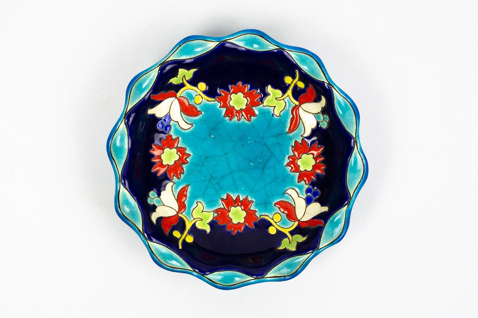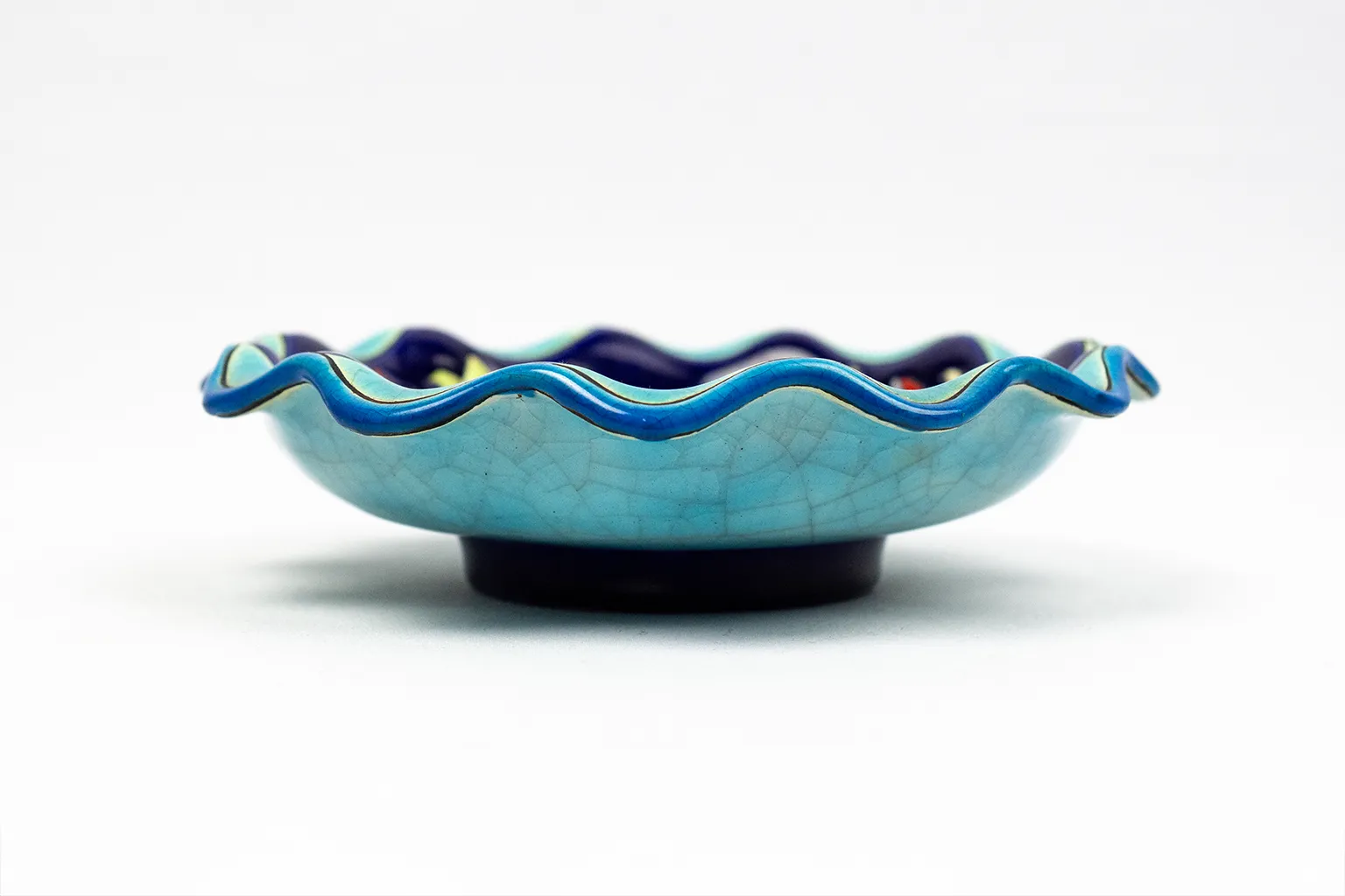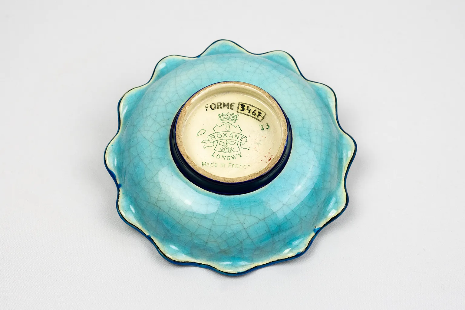 Le bassin révèle un fond turquoise craquelé, signature des ateliers de Longwy, dont la texture fine accroche la lumière et fait vibrer les contours des motifs. Autour de cette zone centrale se déploie une guirlande florale continue : corolles rouge vif, fleurettes rose pâle, feuilles vertes et touches ponctuelles de bleu cobalt. Ces éléments s’inscrivent dans un large bandeau bleu nuit, renforçant l’effet de profondeur et structurant la composition. Le pourtour polylobé, animé par une succession de courbes souples, évoque la silhouette de la grande coupe tout en accentuant ici la délicatesse de l’objet.