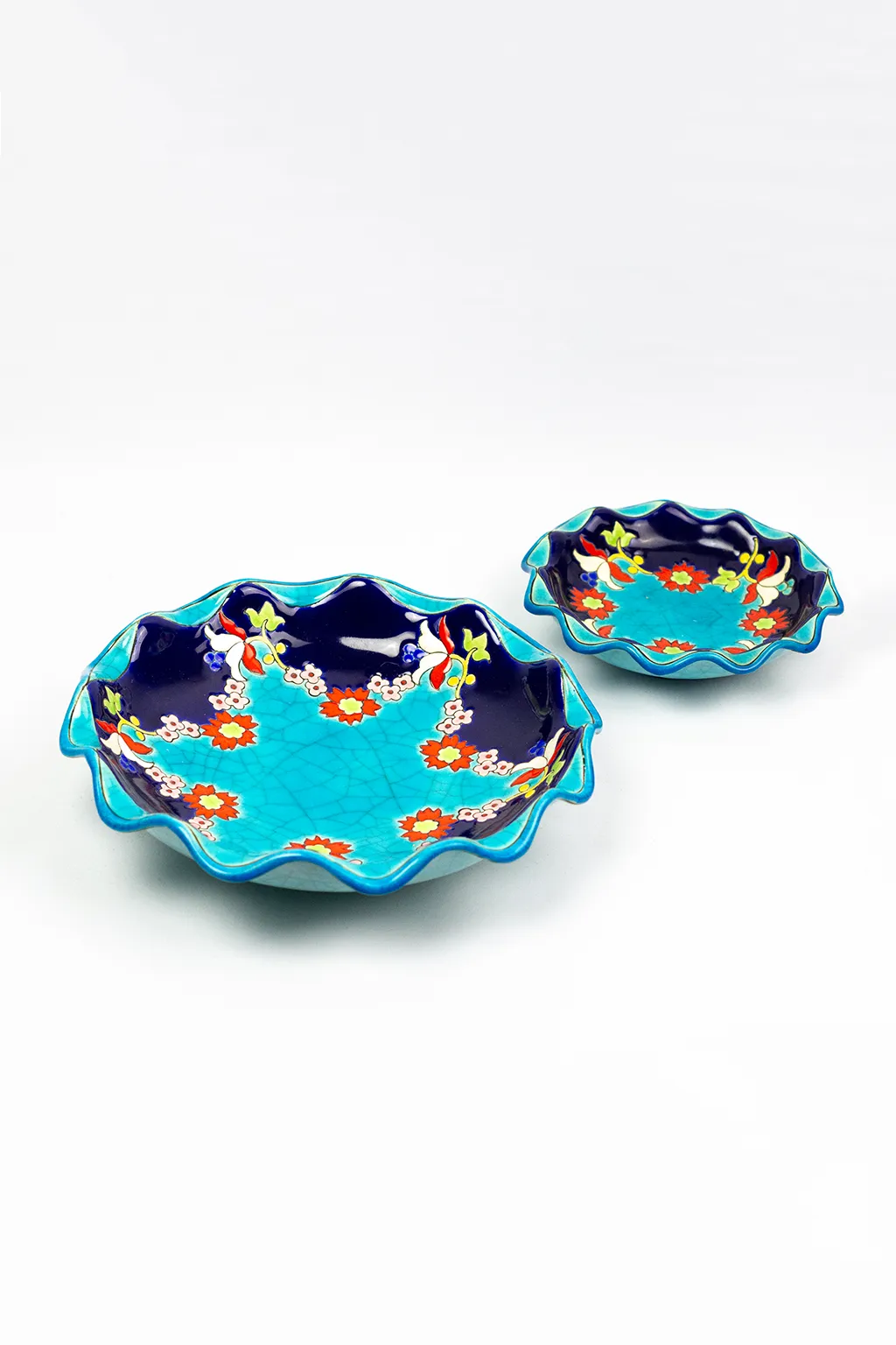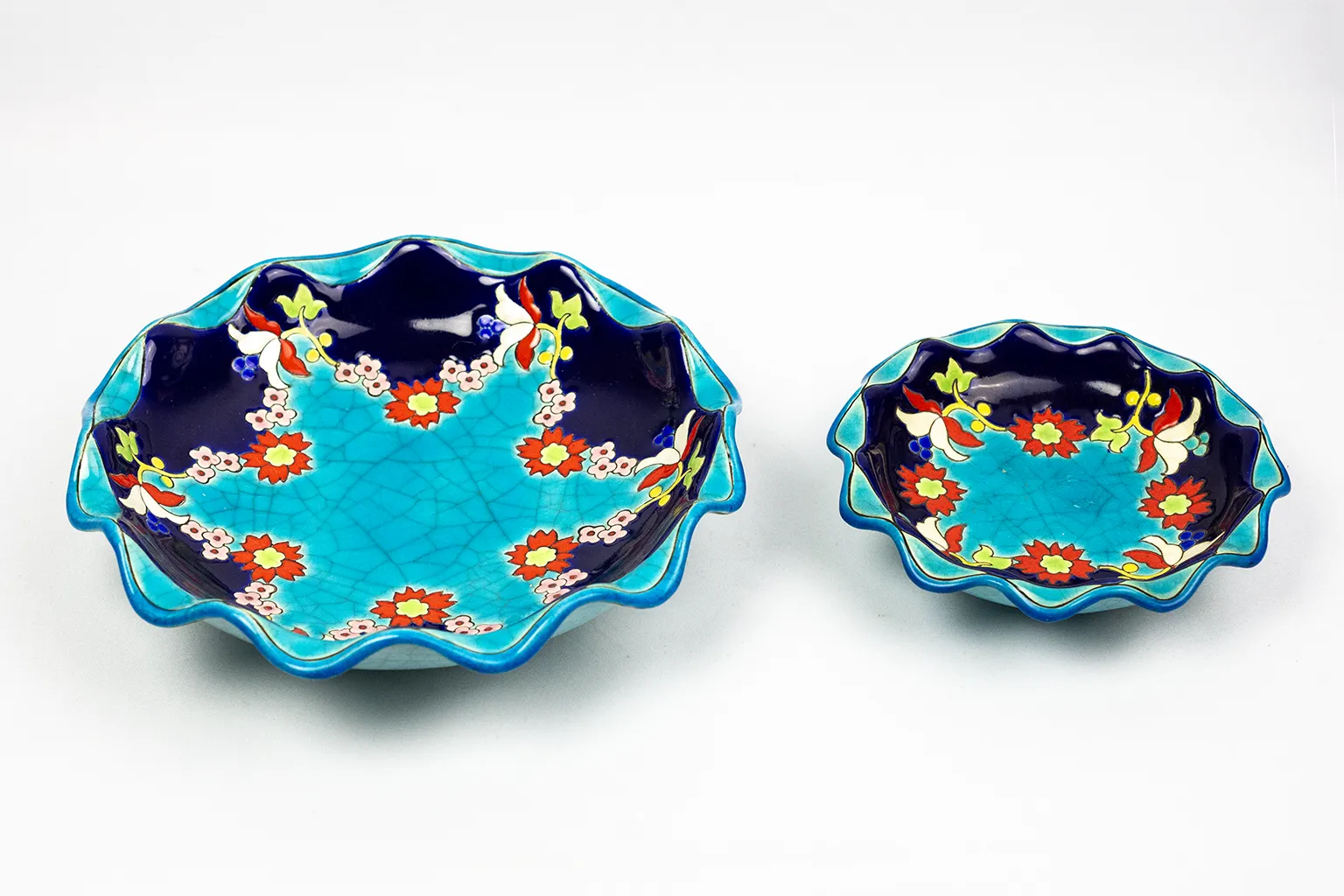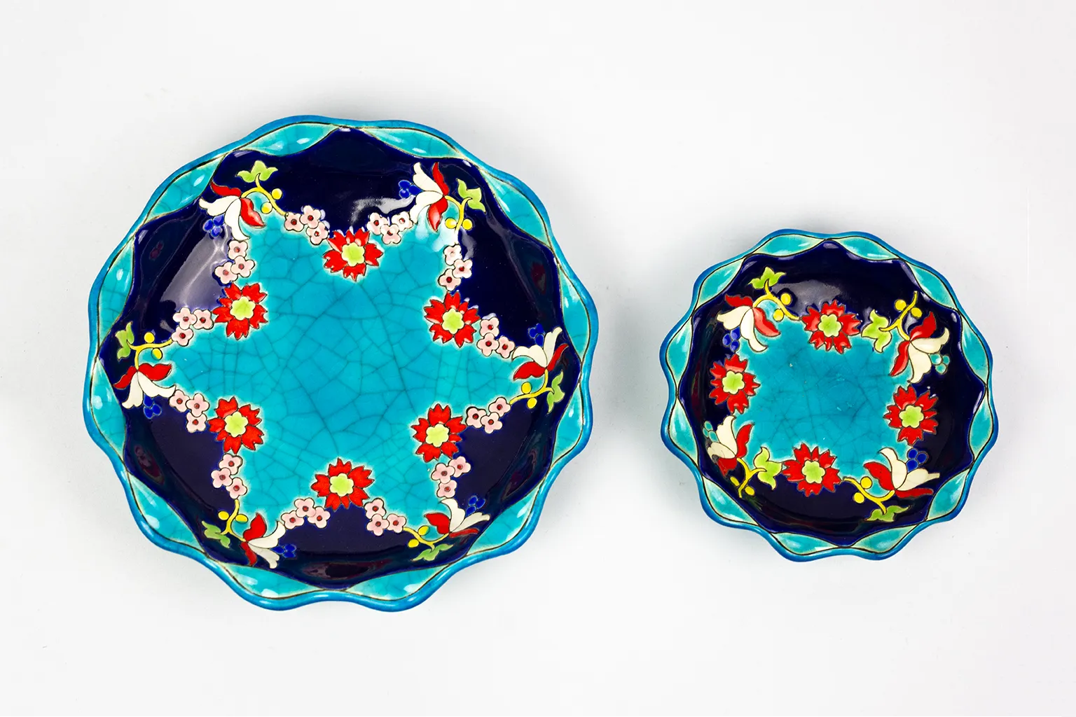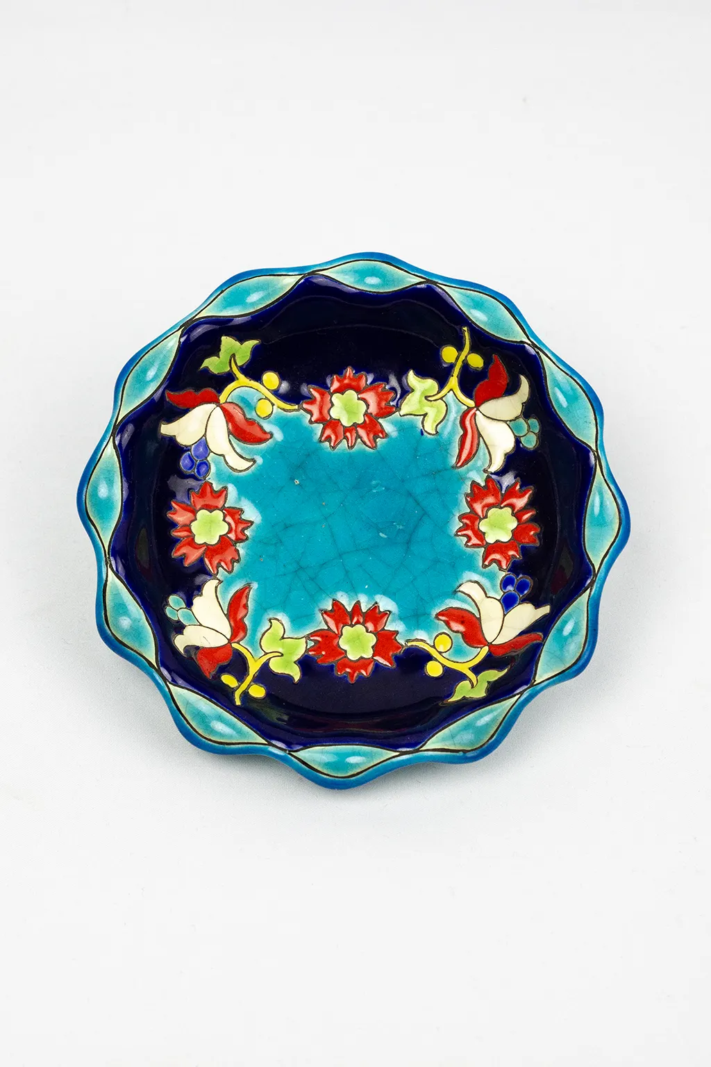 Le bassin révèle un fond turquoise craquelé, signature des ateliers de Longwy, dont la texture fine accroche la lumière et fait vibrer les contours des motifs. Autour de cette zone centrale se déploie une guirlande florale continue : corolles rouge vif, fleurettes rose pâle, feuilles vertes et touches ponctuelles de bleu cobalt. Ces éléments s’inscrivent dans un large bandeau bleu nuit, renforçant l’effet de profondeur et structurant la composition. Le pourtour polylobé, animé par une succession de courbes souples, évoque la silhouette de la grande coupe tout en accentuant ici la délicatesse de l’objet.