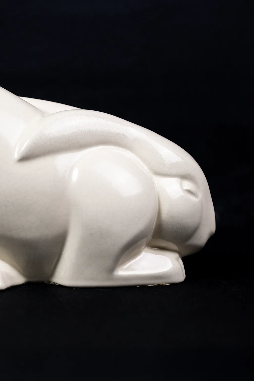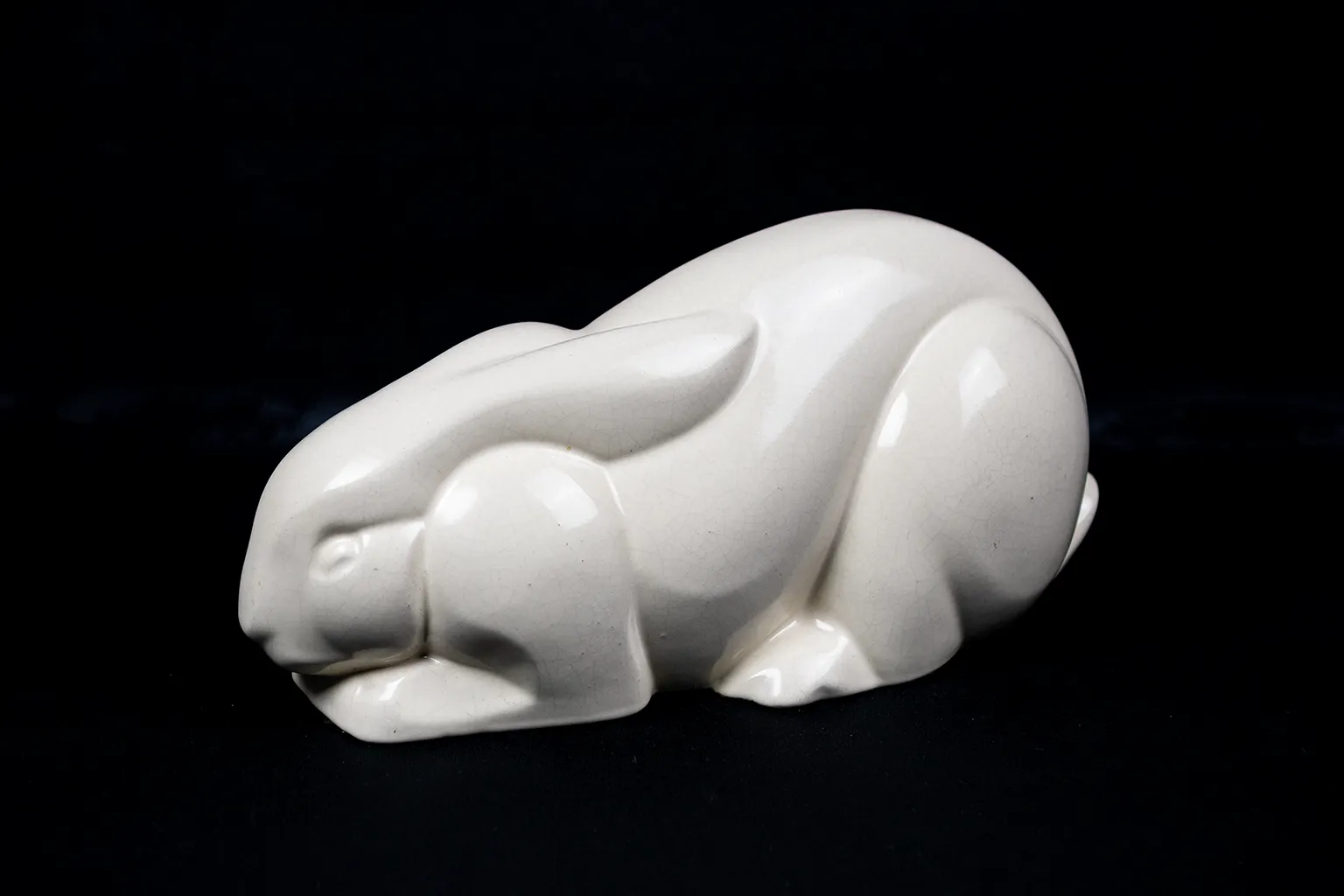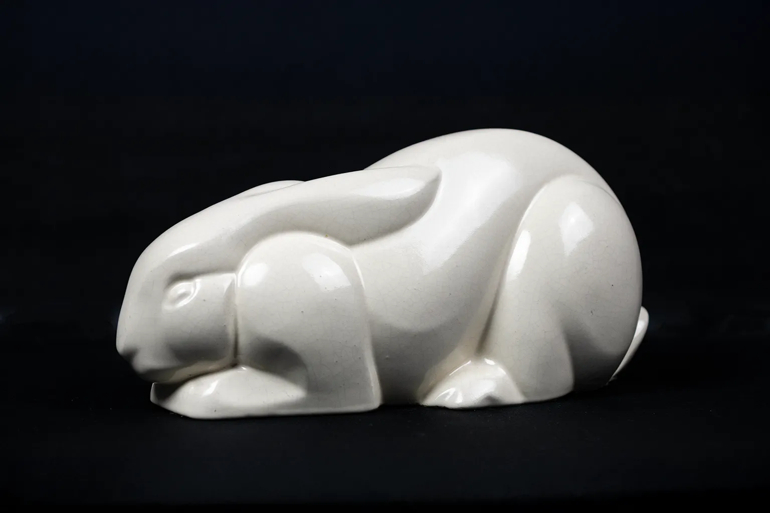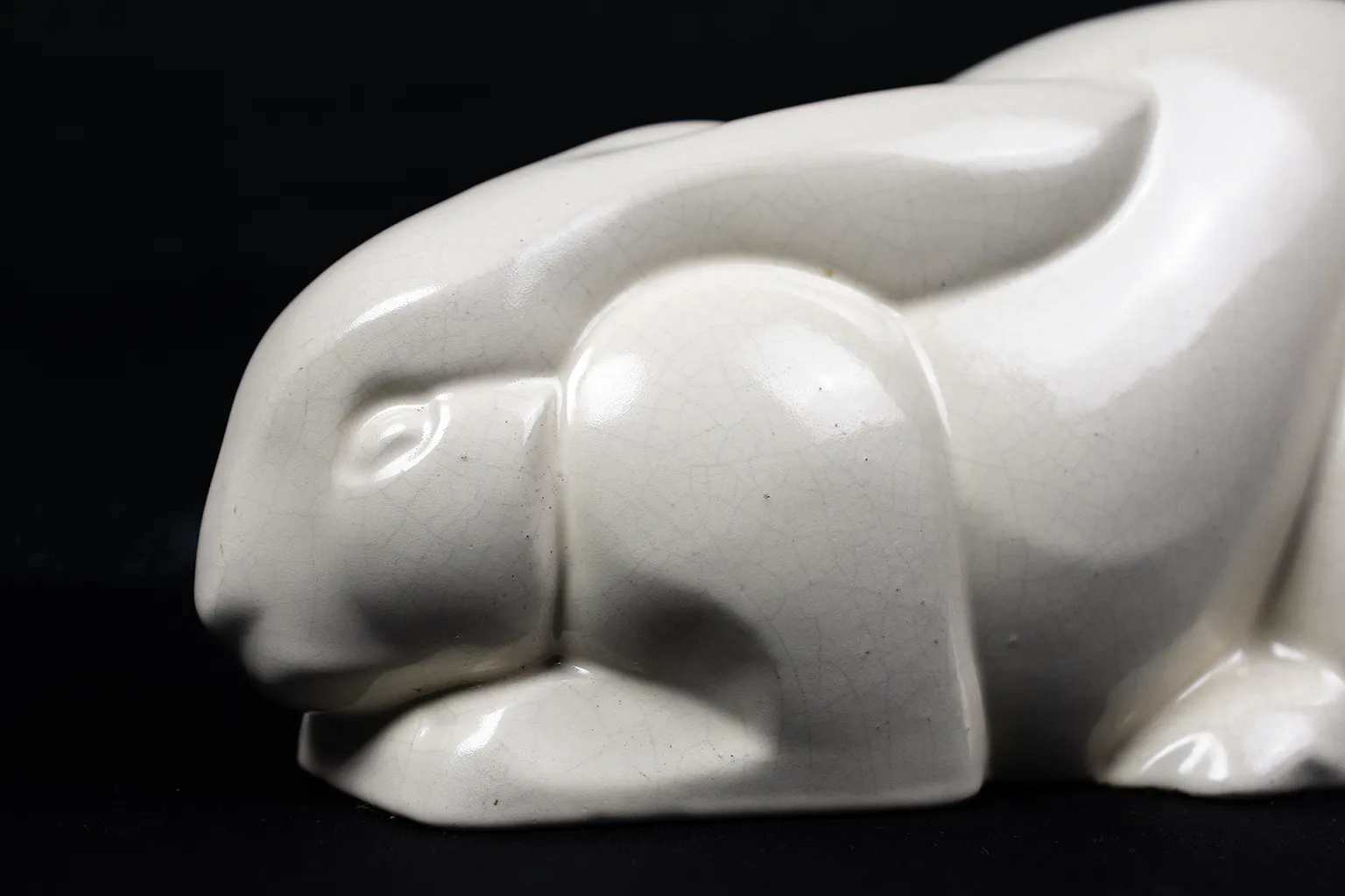 Lapin Art déco couché en faïence craquelée — attribué à Charles Lemanceau pour Saint-Clément, vers 1930