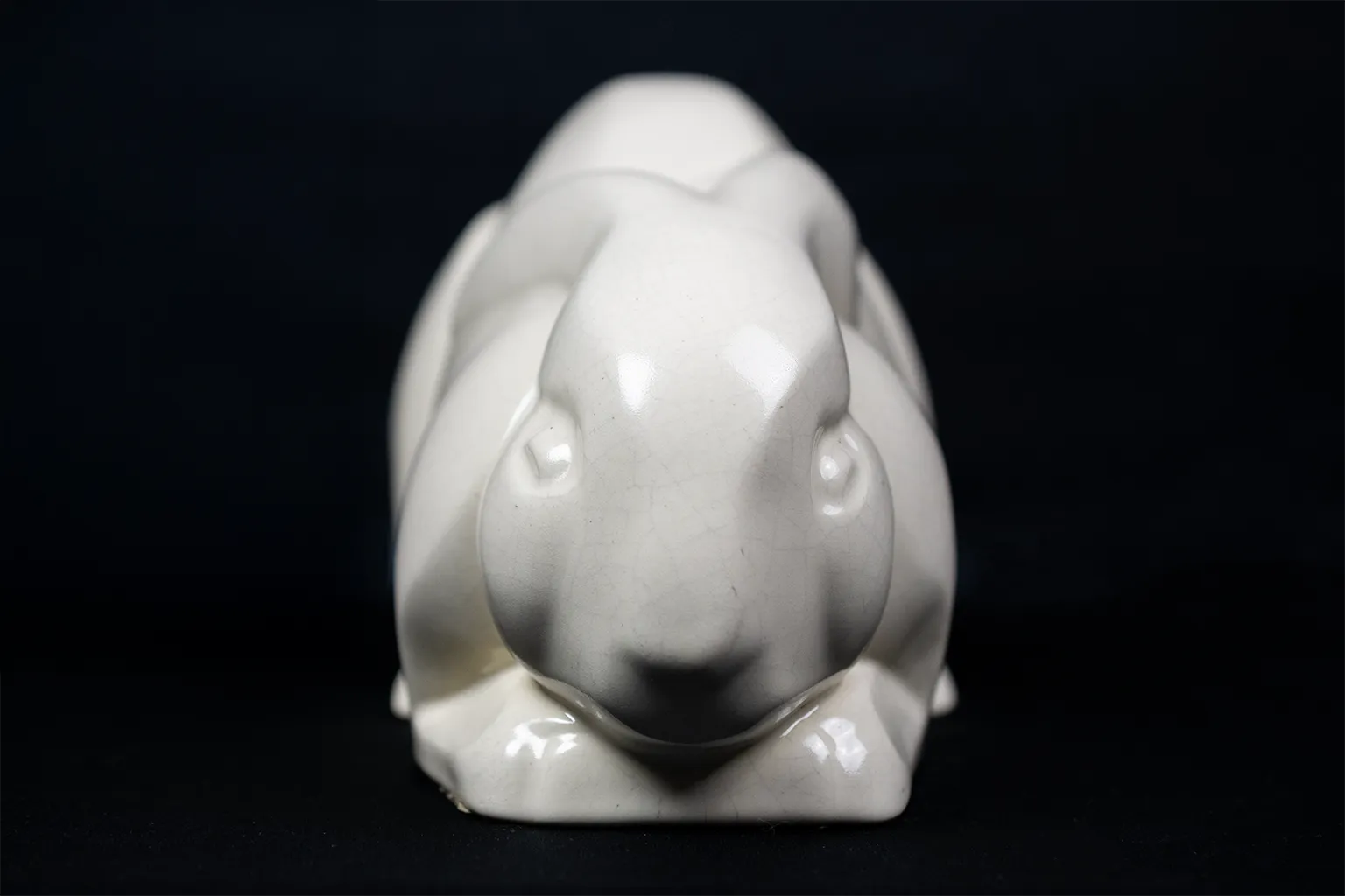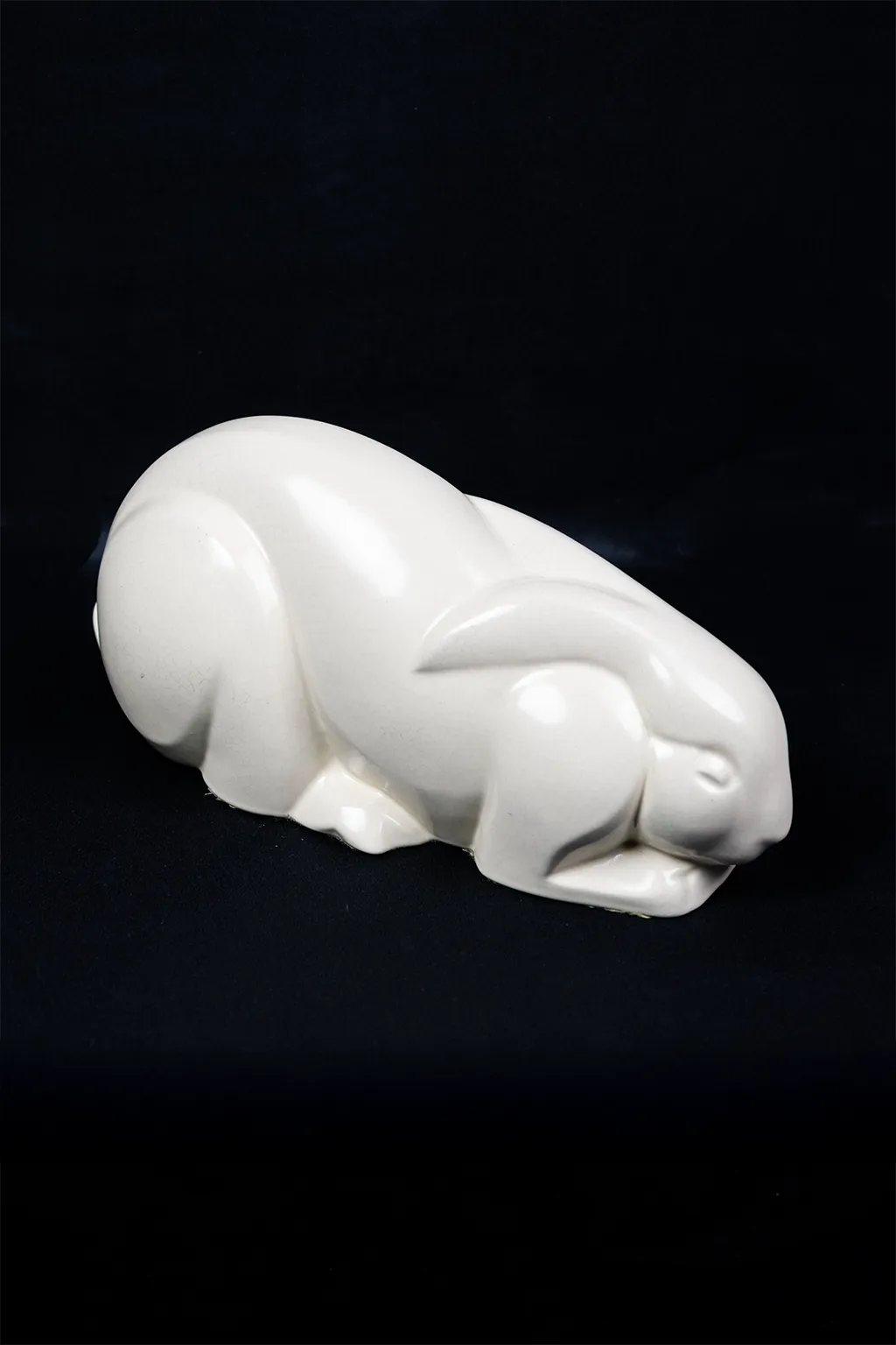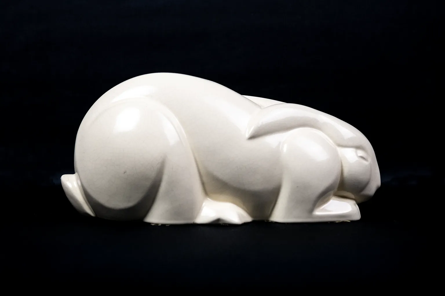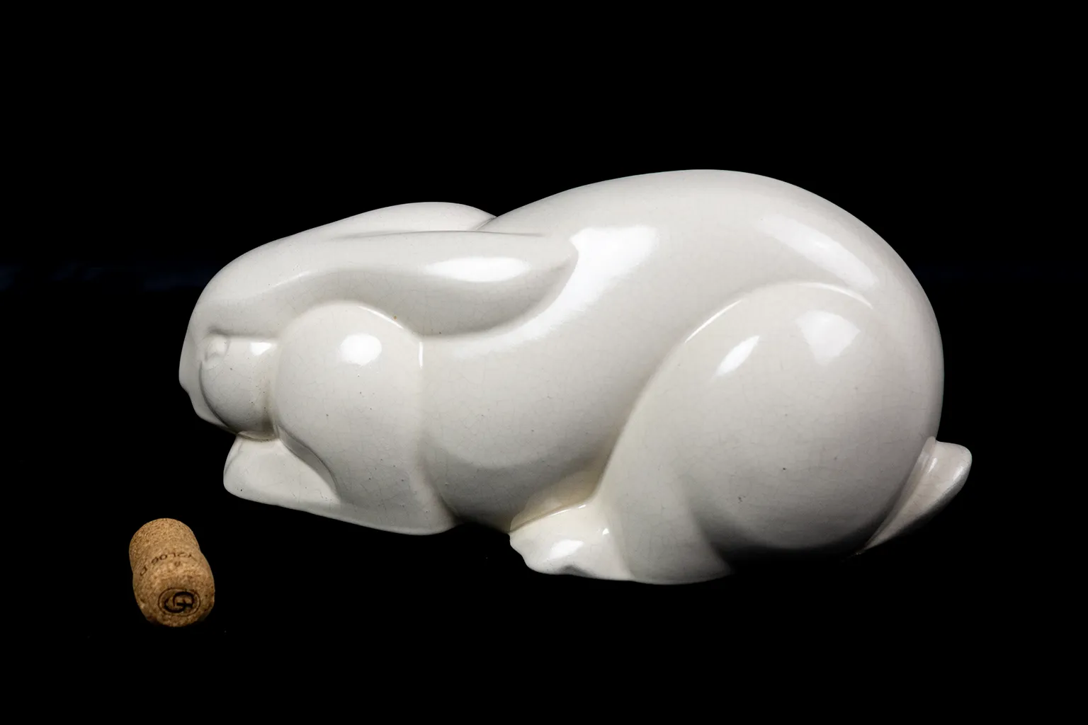 Lapin Art déco couché en faïence craquelée — attribué à Charles Lemanceau pour Saint-Clément, vers 1930