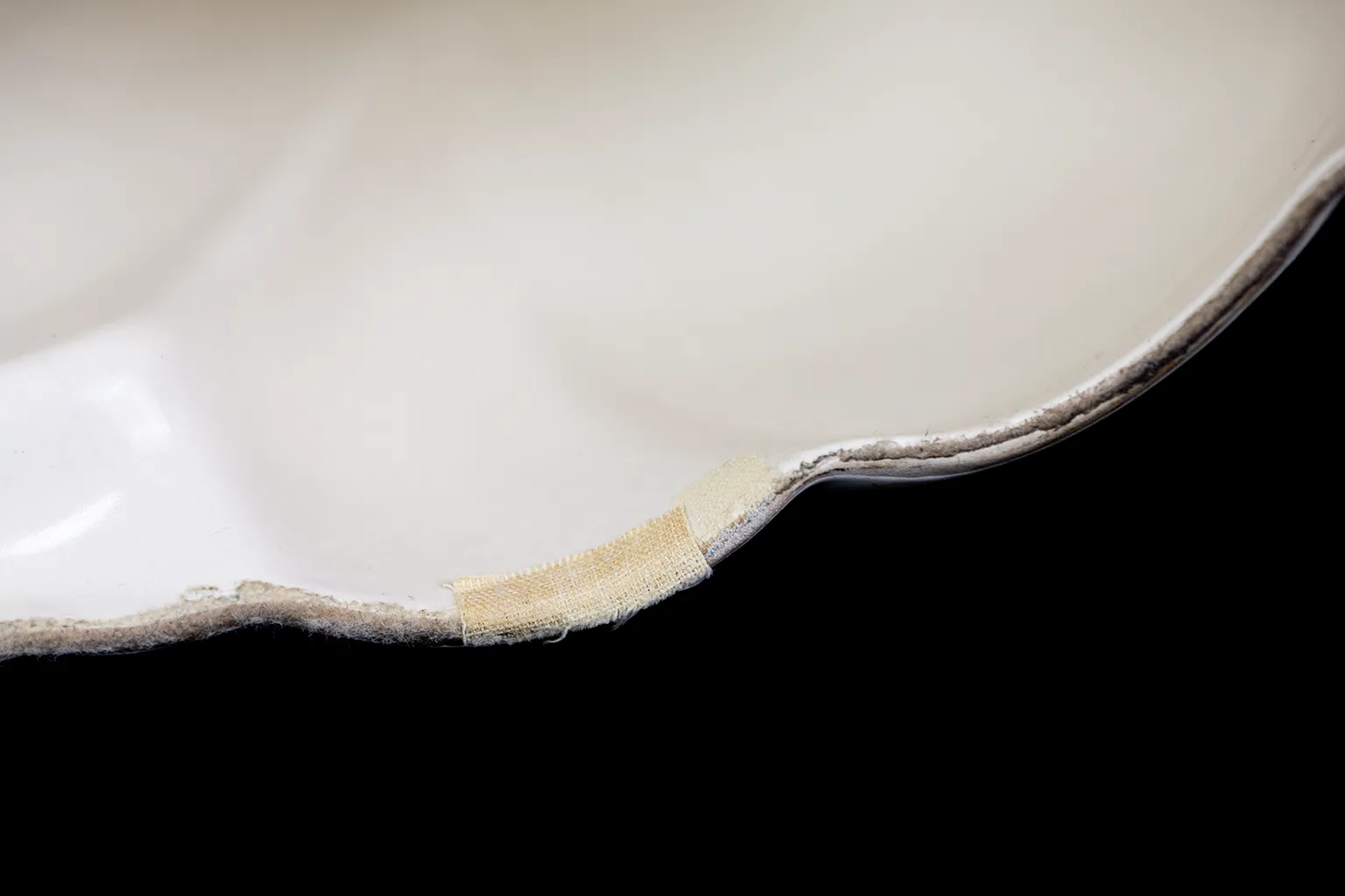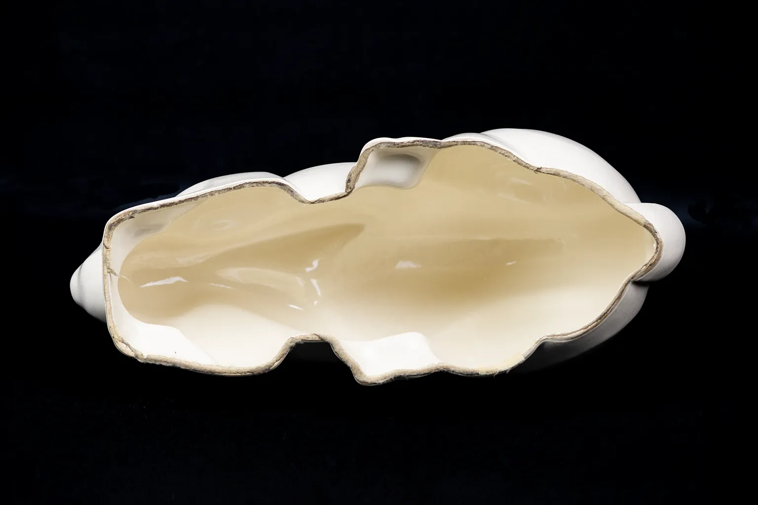 L’émail blanc ivoire, légèrement craquelé, est d’une application soignée. Le réseau de craquelures — visible à l’œil nu sur les zones en léger retrait — est fin et régulier, caractéristique de la production de Saint-Clément dans l’entre-deux-guerres. La surface intérieure révèle un fond de couverte crème sur corps céramique beige, sans marque manufacture visible.