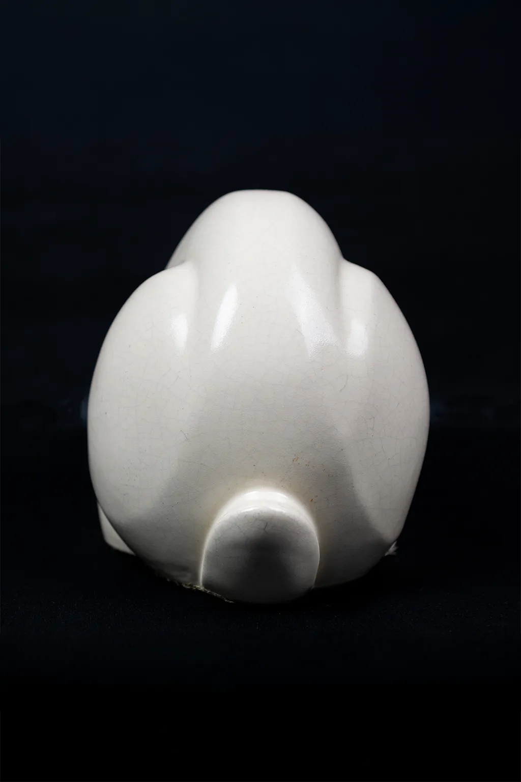 Le lapin est représenté tapi, tête baissée, oreilles couchées le long du dos — posture de retrait que la légende du catalogue Saint-Clément de 1930 nomme explicitement « Craintif ». La composition repose sur un principe d’économie formelle : le volume du corps se réduit à trois masses ovoïdes emboîtées — croupe, flanc, tête — que relient des plans franchement coupés, sans détail anatomique superflu. Vue de face, la silhouette se resserre jusqu’à ne former qu’un bloc presque monolithique ; vue de côté, la ligne d’échine décrit une courbe continue de la queue aux oreilles, sans rupture. C’est cette tension entre la synthèse géométrique et la lisibilité immédiate du motif qui caractérise le travail de Lemanceau à cette période.