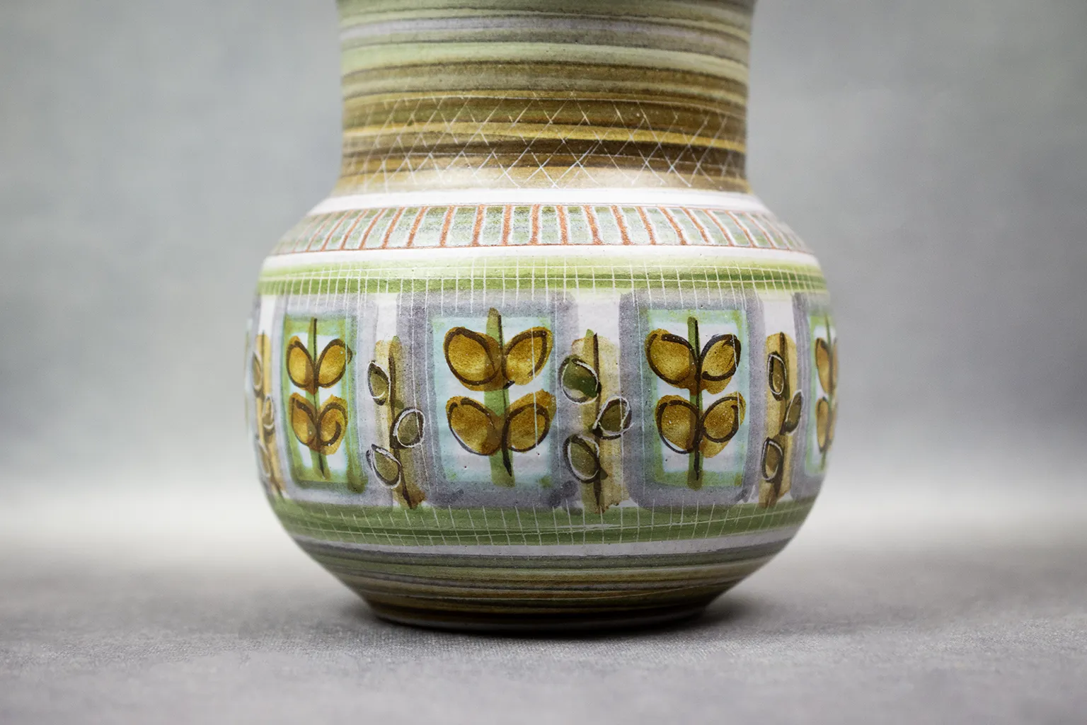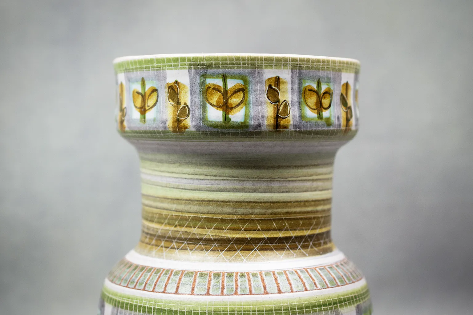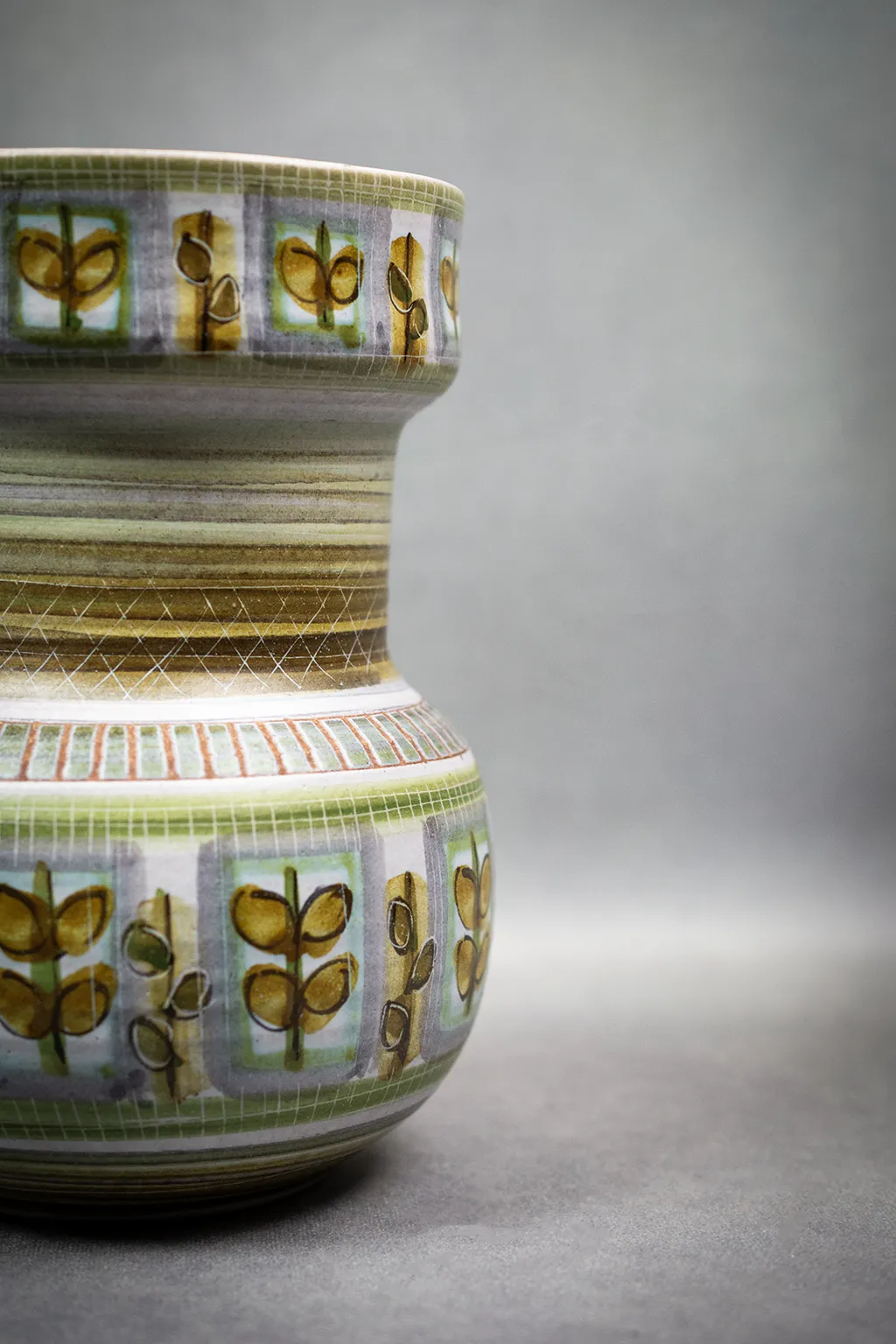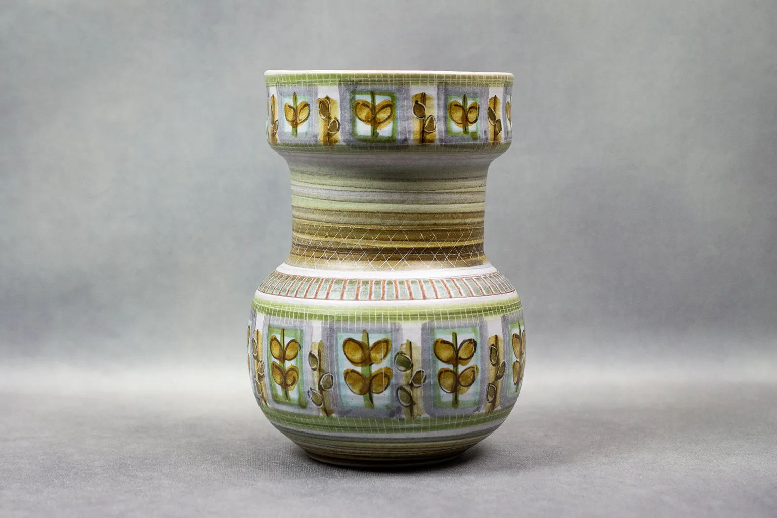 La structure du vase, modelée avec soin, révèle un goût pour la régularité et l’harmonie. Le décor végétal, répété à la manière d’un motif tissé, évoque les textiles modernistes ou les papiers peints scandinaves de la même époque. La base, émaillée de bandes vertes superposées, ancre l’objet tout en soulignant sa verticalité.