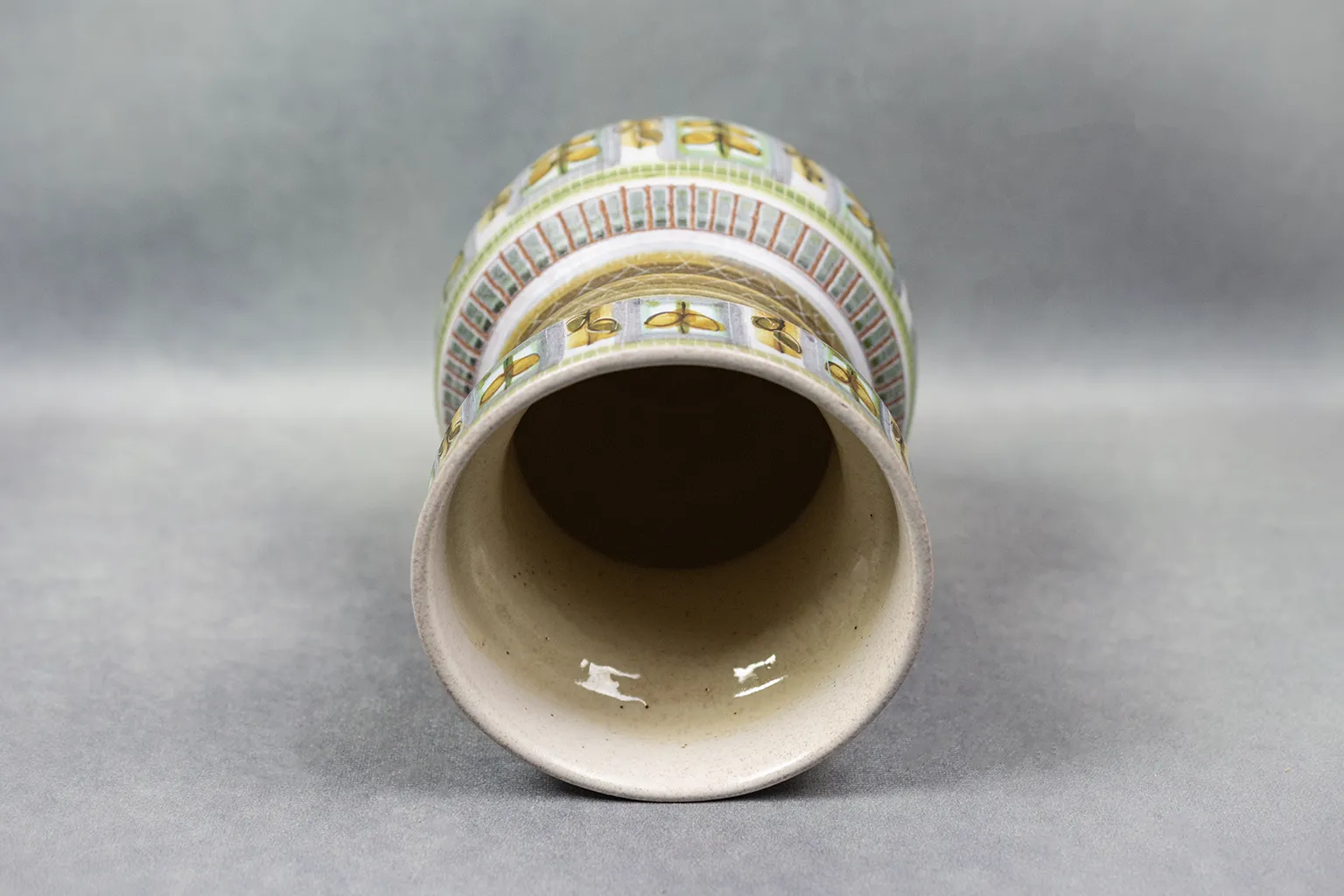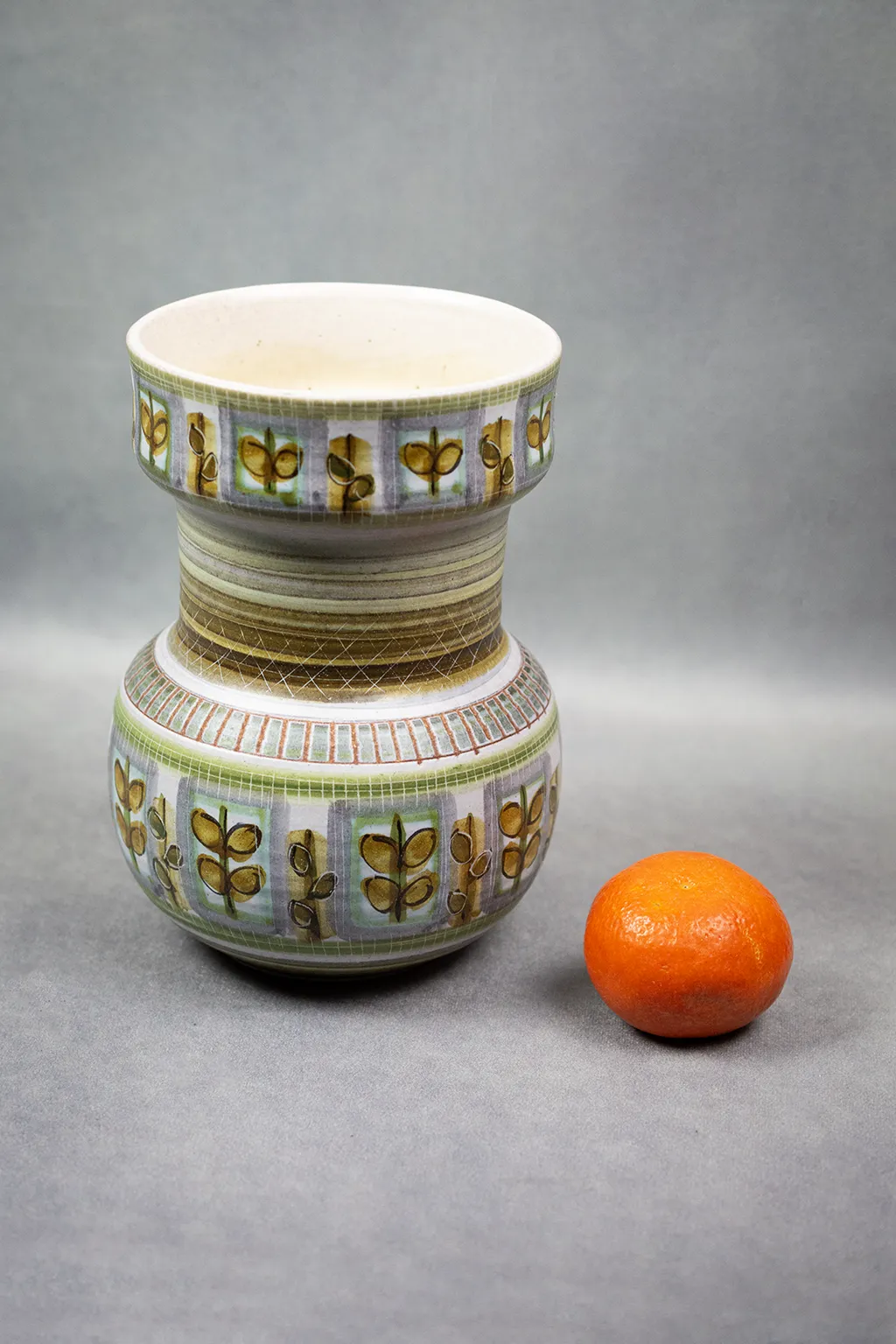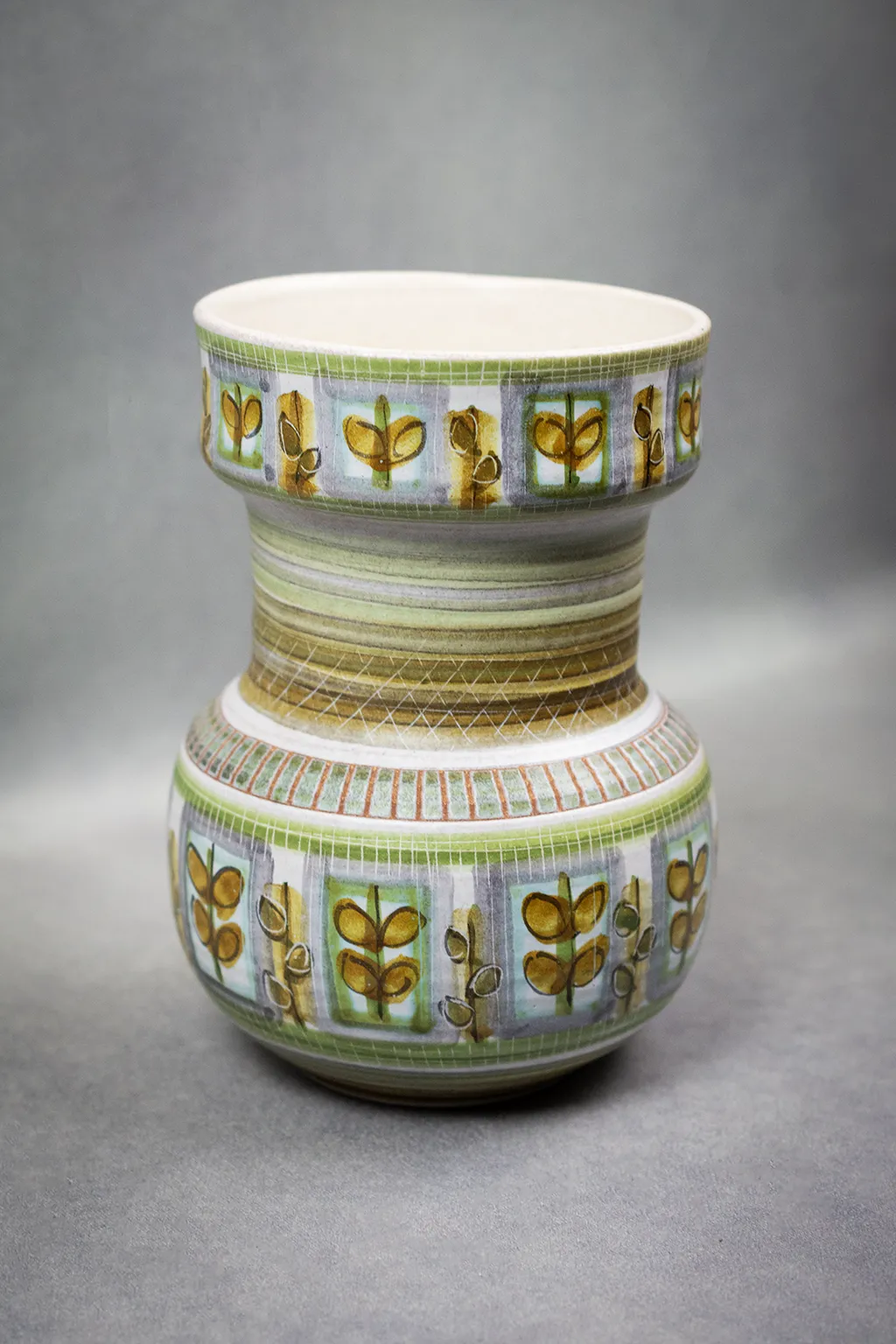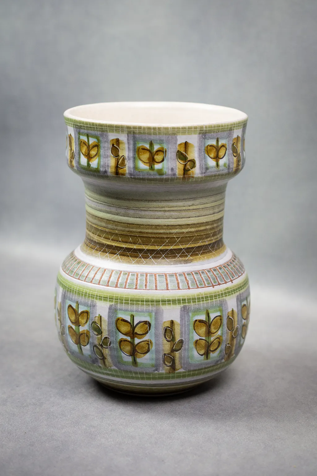 La structure du vase, modelée avec soin, révèle un goût pour la régularité et l’harmonie. Le décor végétal, répété à la manière d’un motif tissé, évoque les textiles modernistes ou les papiers peints scandinaves de la même époque. La base, émaillée de bandes vertes superposées, ancre l’objet tout en soulignant sa verticalité.