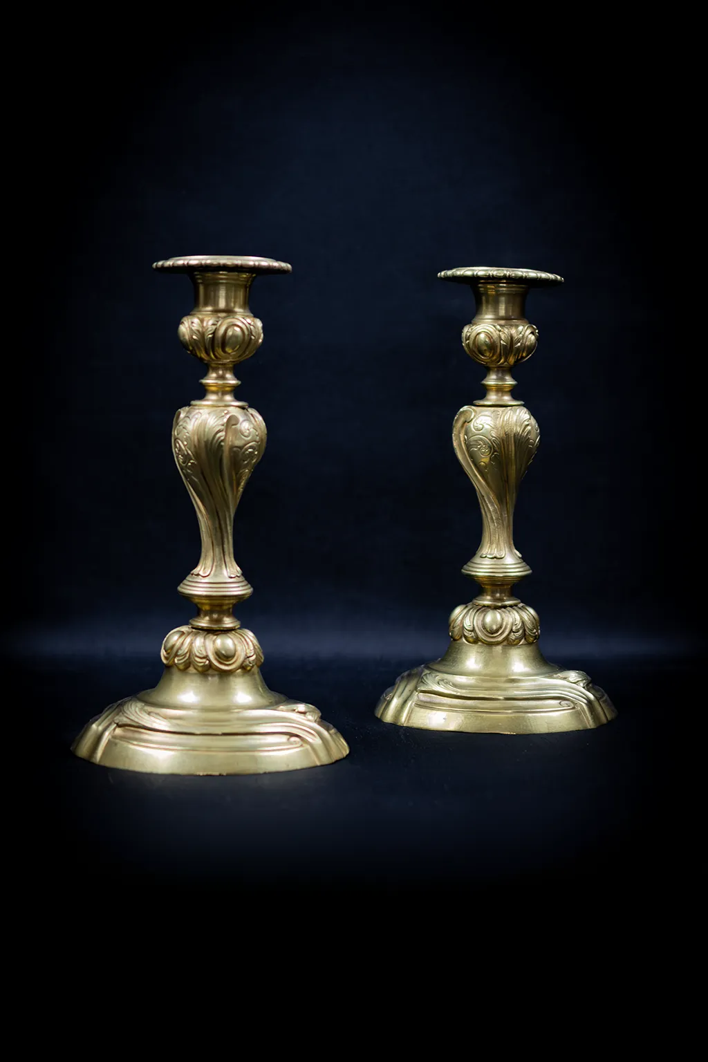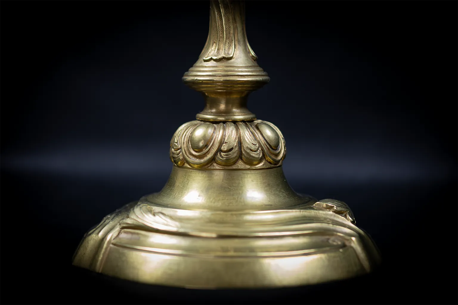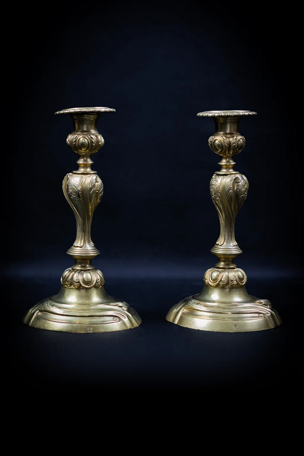 La structure de chaque flambeau suit un schéma tripartite rigoureusement équilibré. Le socle, à contours chantournés, est souligné d’une double moulure courante et animé sur ses flancs de volutes et de coquilles en faible relief. La collerette qui fait la jonction entre le pied et le fût présente une rangée de cabochons ovoïdes ceinturés de feuilles d’acanthe retombantes, motif caractéristique du vocabulaire Louis XV dans sa version la plus ornementée. Le fût lui-même adopte une forme de vase ballustre dont le galbe prononcé est entièrement parcouru de feuilles d’acanthe en fort relief, traitées avec une souplesse qui accentue le mouvement ascendant de la tige. Un anneau de séparation marque le resserrement avant le nœud supérieur, lui aussi couvert de cabochons et de feuillage. La bague porte-bougie circulaire, à rebord festonné, couronne l’ensemble avec discrétion.