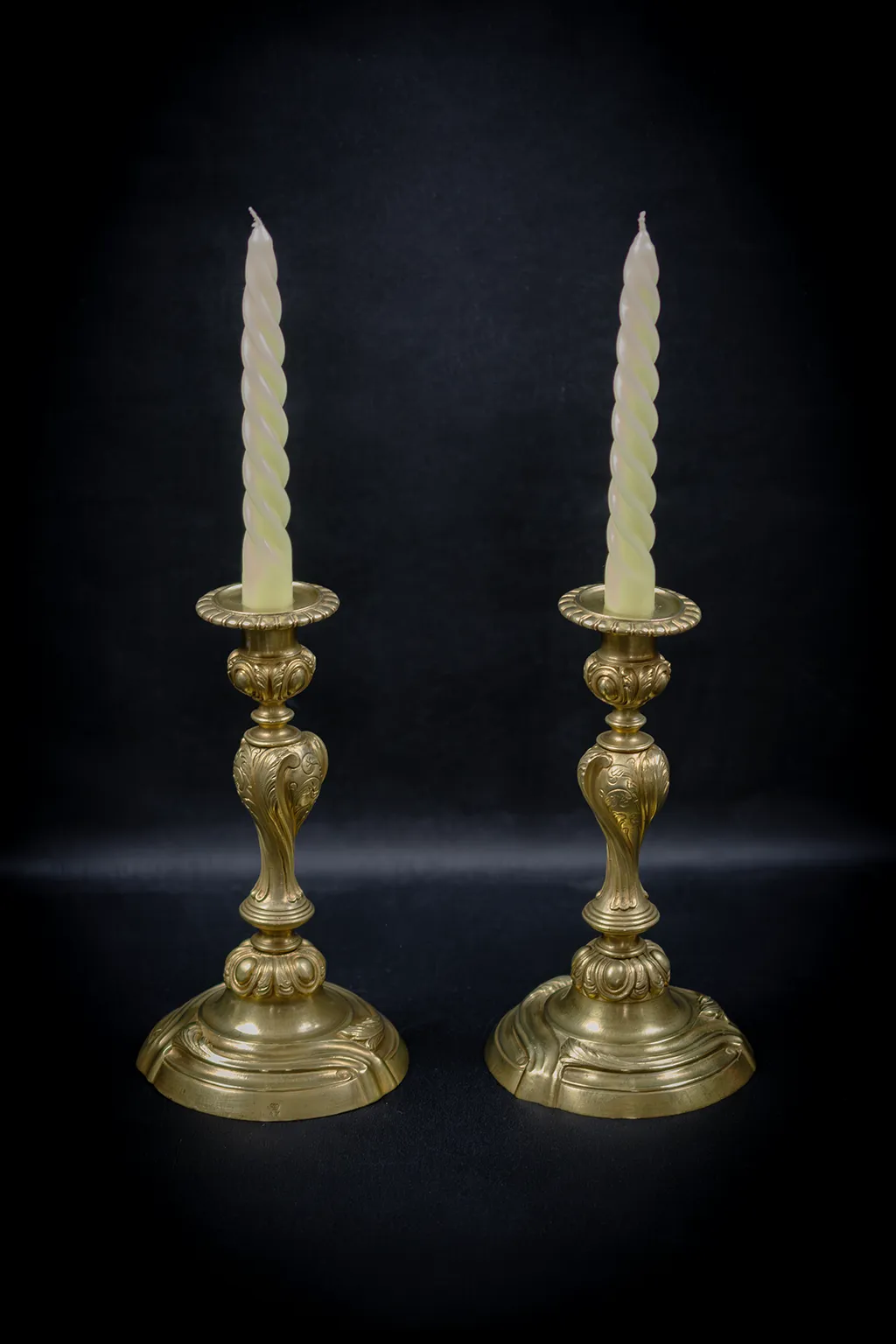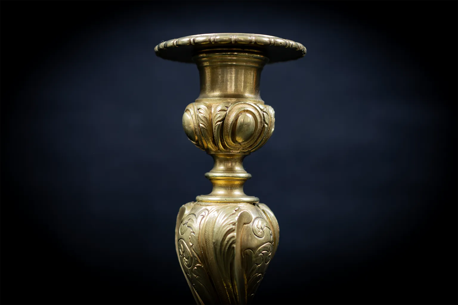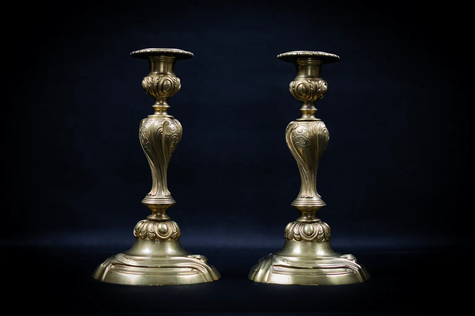 La structure de chaque flambeau suit un schéma tripartite rigoureusement équilibré. Le socle, à contours chantournés, est souligné d’une double moulure courante et animé sur ses flancs de volutes et de coquilles en faible relief. La collerette qui fait la jonction entre le pied et le fût présente une rangée de cabochons ovoïdes ceinturés de feuilles d’acanthe retombantes, motif caractéristique du vocabulaire Louis XV dans sa version la plus ornementée. Le fût lui-même adopte une forme de vase ballustre dont le galbe prononcé est entièrement parcouru de feuilles d’acanthe en fort relief, traitées avec une souplesse qui accentue le mouvement ascendant de la tige. Un anneau de séparation marque le resserrement avant le nœud supérieur, lui aussi couvert de cabochons et de feuillage. La bague porte-bougie circulaire, à rebord festonné, couronne l’ensemble avec discrétion.