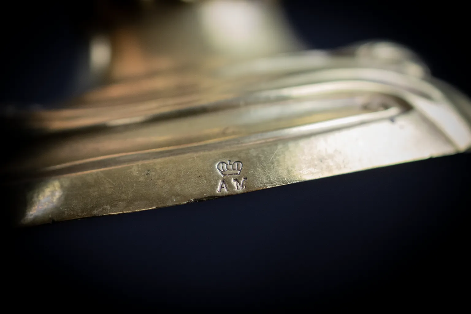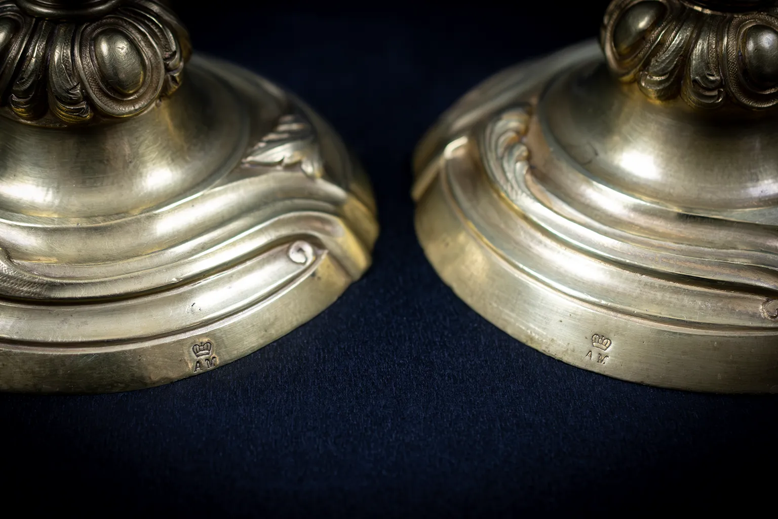 Sur la tranche du socle de chaque flambeau est frappé un poinçon composé d’une couronne surmontant les initiales AM. Ce poinçon, identique sur les deux exemplaires, n’a pas pu être rapproché à ce stade d’un fondeur ou d’un bronzier répertorié dans les sources consultées. Il pourrait s’agir d’un monogramme de propriétaire — la forme de la couronne, à cinq fleurons surmontés d’une croix, étant proche des couronnes de comte dans l’héraldique française du XIXe siècle — ou d’une marque d’atelier non documentée publiquement.