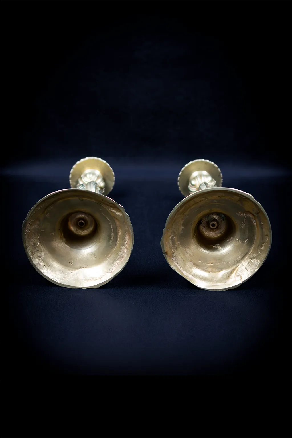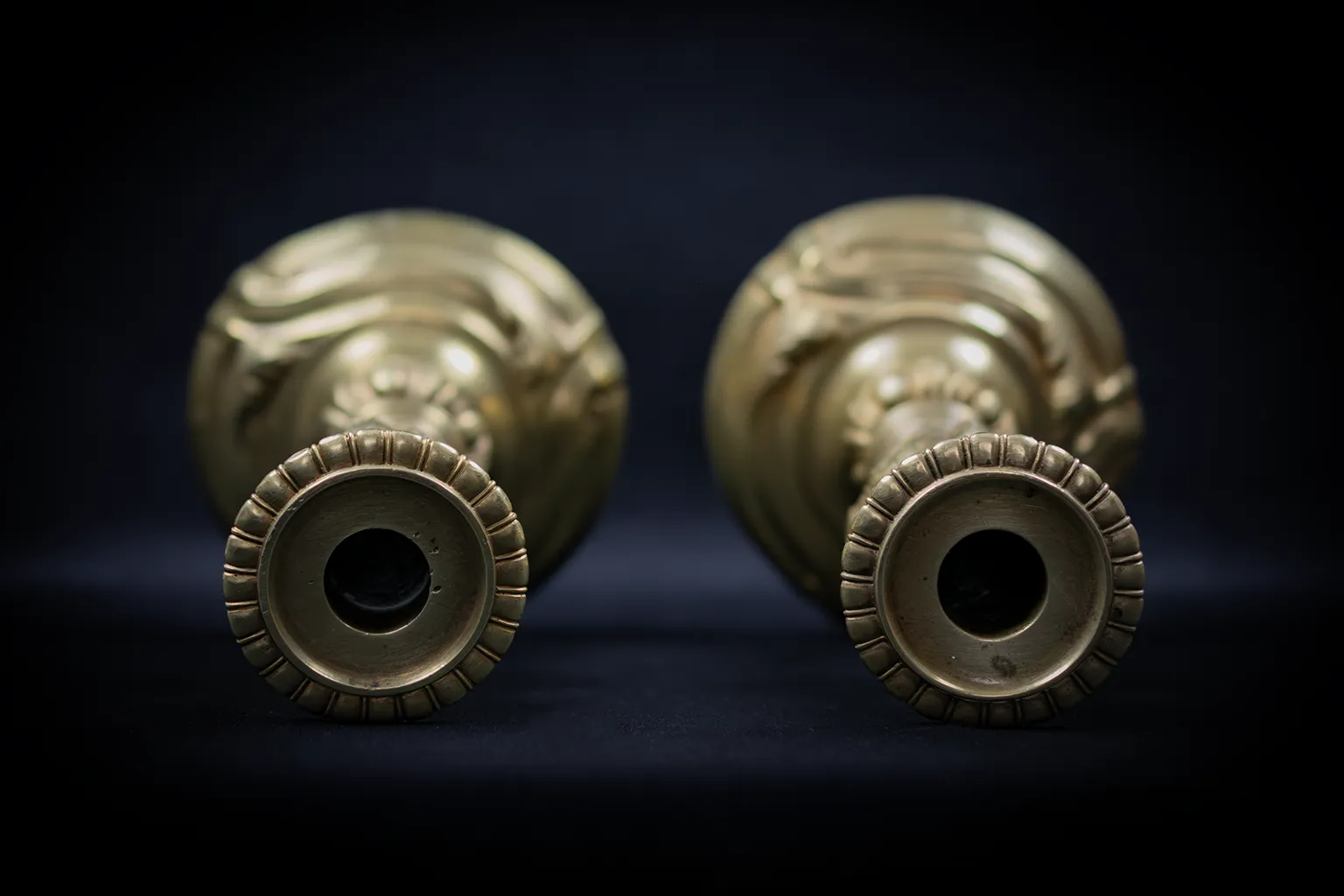 La dorure, d’un ton chaud uniformément maintenu, présente les légères usures attendues d’un usage ancien, notamment aux points de contact et sur les parties convexes les plus saillantes. L’intérieur des socles révèle une facture coulée sans finition intérieure particulière, procédé courant dans la bronzerie d’ameublement du XIXe siècle.