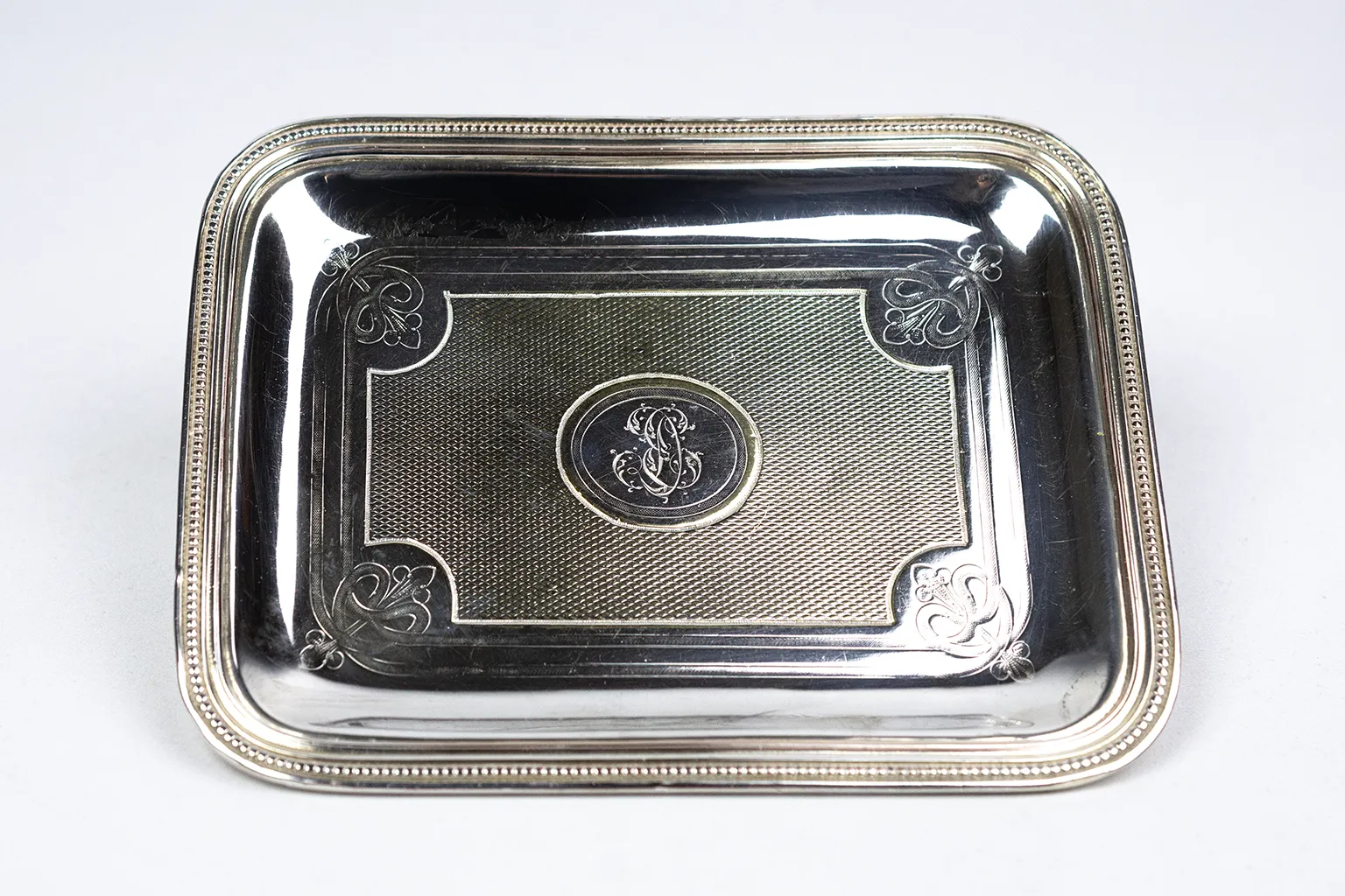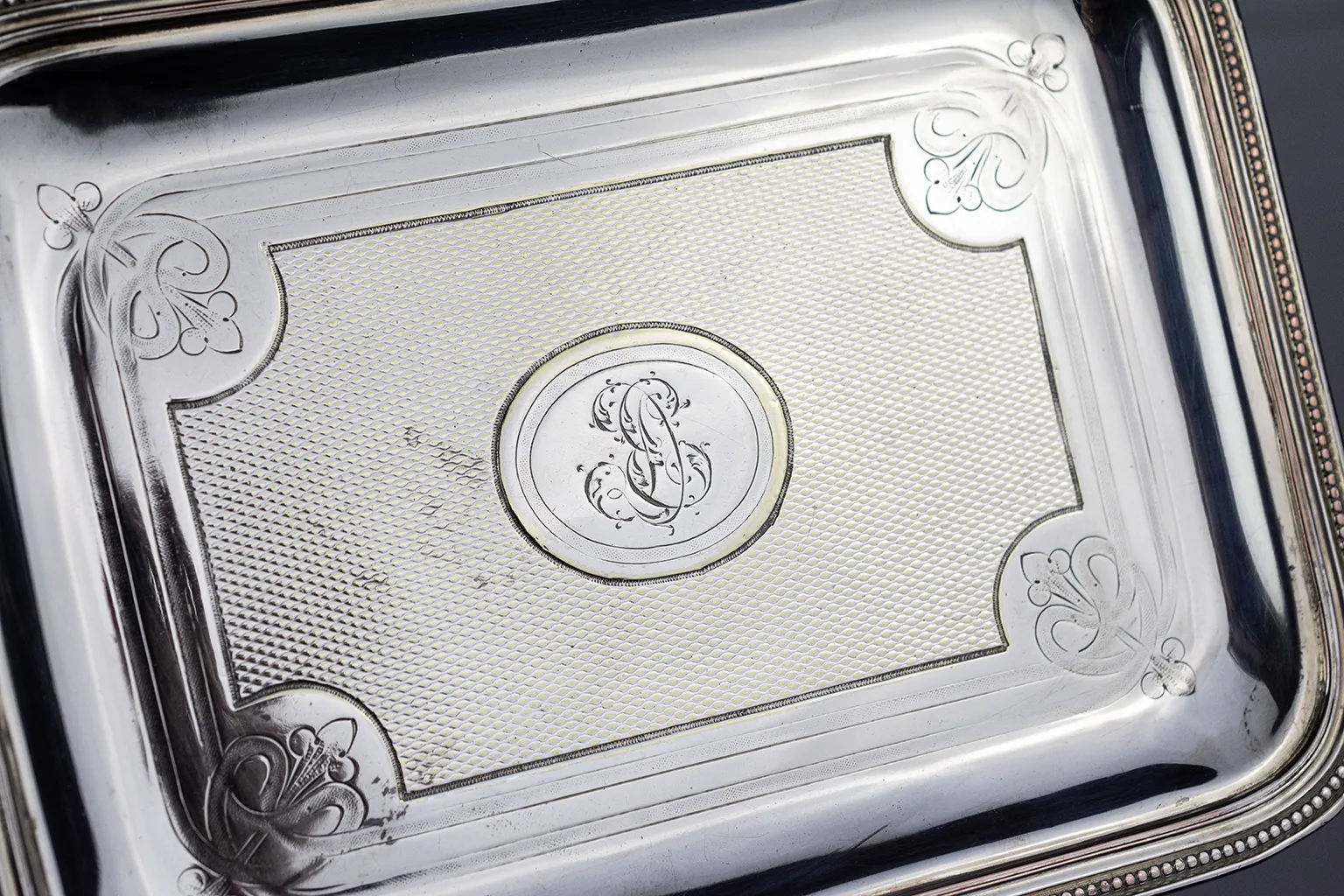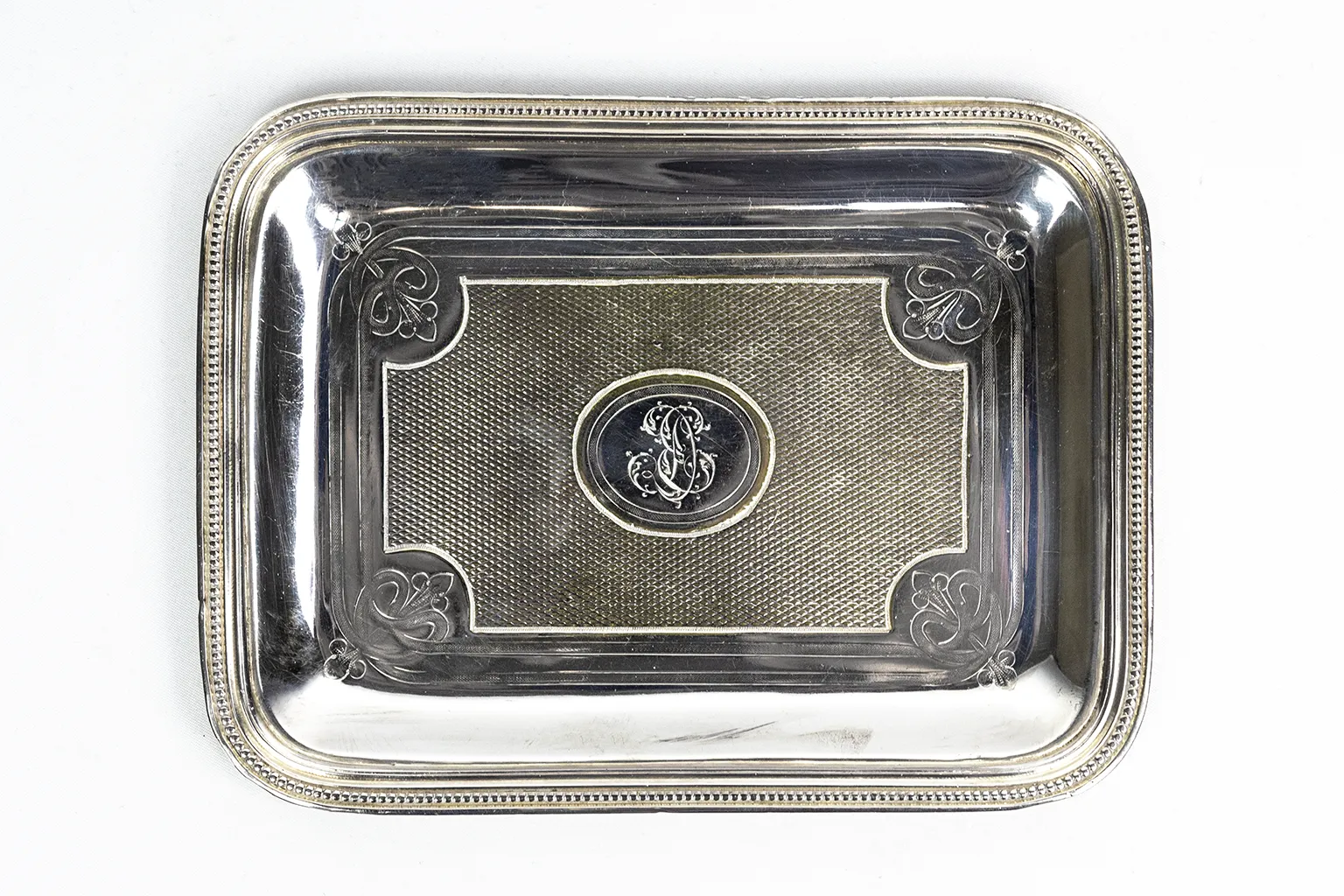 Le corps est rectangulaire à angles arrondis, avec un fond légèrement en cuvette. Le bord est traité en double filet perlé continu — motif sobre et élégant, courant dans la production Christofle de la période. Le fond de la cuvette est entièrement guilloché : un réseau serré de losanges en creux couvre la surface, créant un effet de texture lumineuse qui contraste avec le miroir poli des bords. Ce traitement, réalisé au tour à guillocher, est caractéristique de la production orfèvrière de la fin du XIXe siècle. Aux quatre angles du champ guilloché, des écoinçons à motif de palmette stylisée — gravés au burin — viennent articuler la transition entre la zone décorée et la bordure lisse.