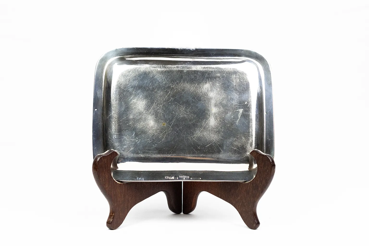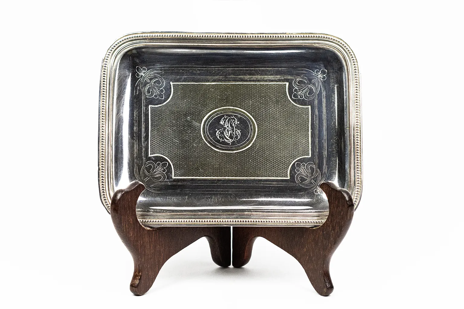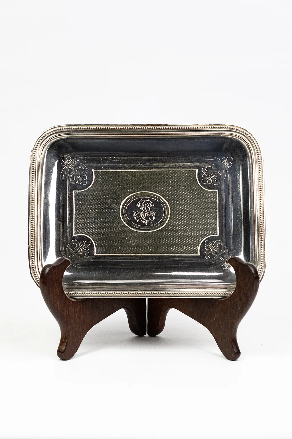 Le corps est rectangulaire à angles arrondis, avec un fond légèrement en cuvette. Le bord est traité en double filet perlé continu — motif sobre et élégant, courant dans la production Christofle de la période. Le fond de la cuvette est entièrement guilloché : un réseau serré de losanges en creux couvre la surface, créant un effet de texture lumineuse qui contraste avec le miroir poli des bords. Ce traitement, réalisé au tour à guillocher, est caractéristique de la production orfèvrière de la fin du XIXe siècle. Aux quatre angles du champ guilloché, des écoinçons à motif de palmette stylisée — gravés au burin — viennent articuler la transition entre la zone décorée et la bordure lisse.