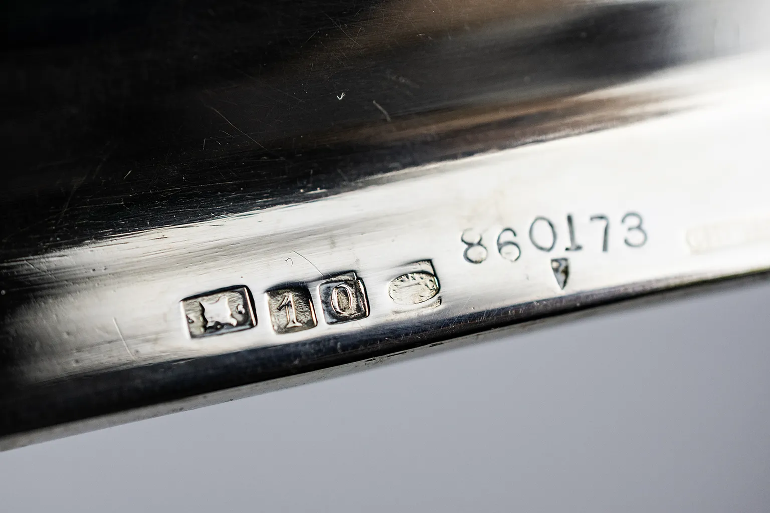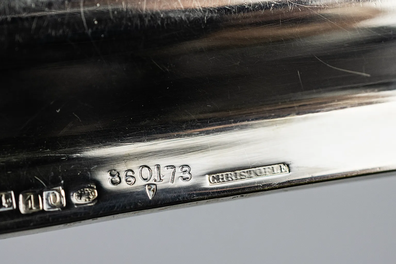 Au revers, le marquage complet est présent sur le plat du bord : poinçon de fabrique CC dans un ovale rectangulaire (abeille, balance, étoiles et lettres CC, utilisé de 1844 à 1935), poinçon de qualité 10, cartouche estampillé CHRISTOFLE et numéro de modèle gravé 860173. L’ensemble des éléments stylistiques et du marquage oriente vers une production de la fin du XIXe – début du XXe siècle, vraisemblablement entre 1880 et 1910.