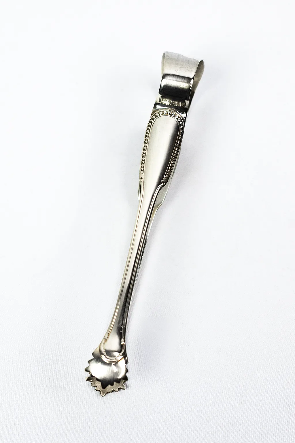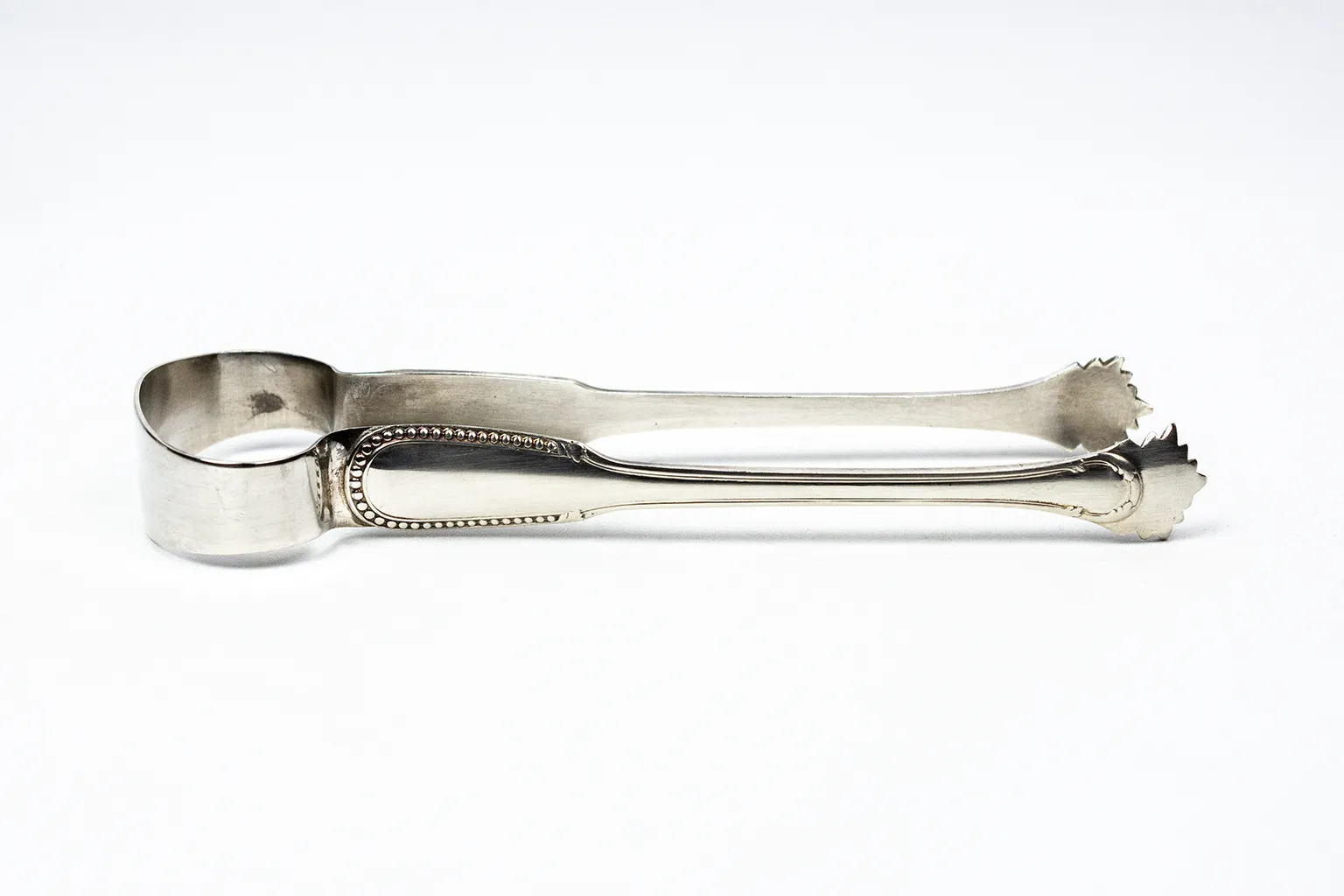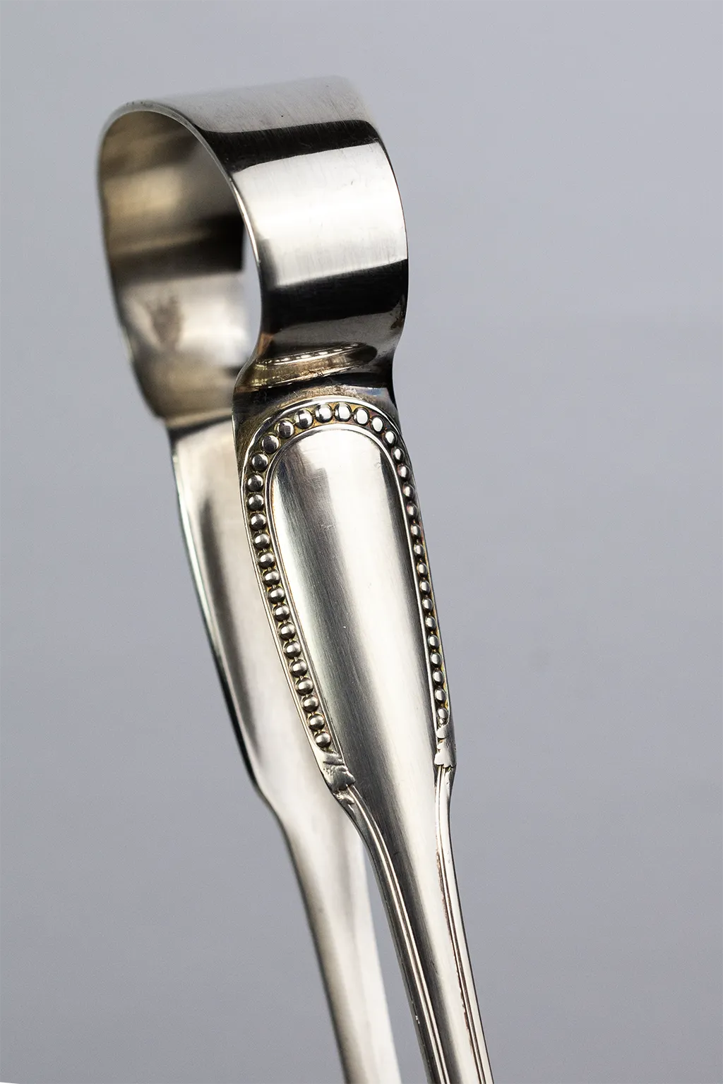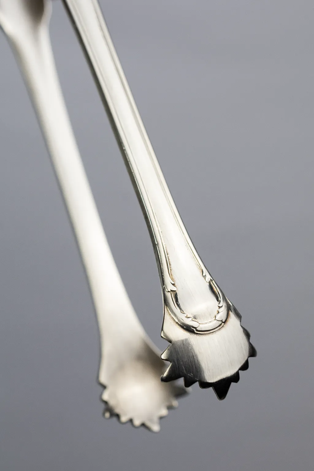 La pince se présente comme une pièce de service à ressort, construite autour d’un pontet arqué à section plate qui relie deux branches légèrement cambrées se terminant chacune par un mors rectangulaire à dents de scie. Ce type de mors — plus agressif que celui des pinces à sucre standard — est caractéristique des accessoires de service à la glace, destinés à la préhension de glaçons ou de blocs de glace taillés. Les dimensions (19 cm de longueur, 6 cm de largeur aux mors) confirment un usage de service à table plutôt qu’un usage individuel.