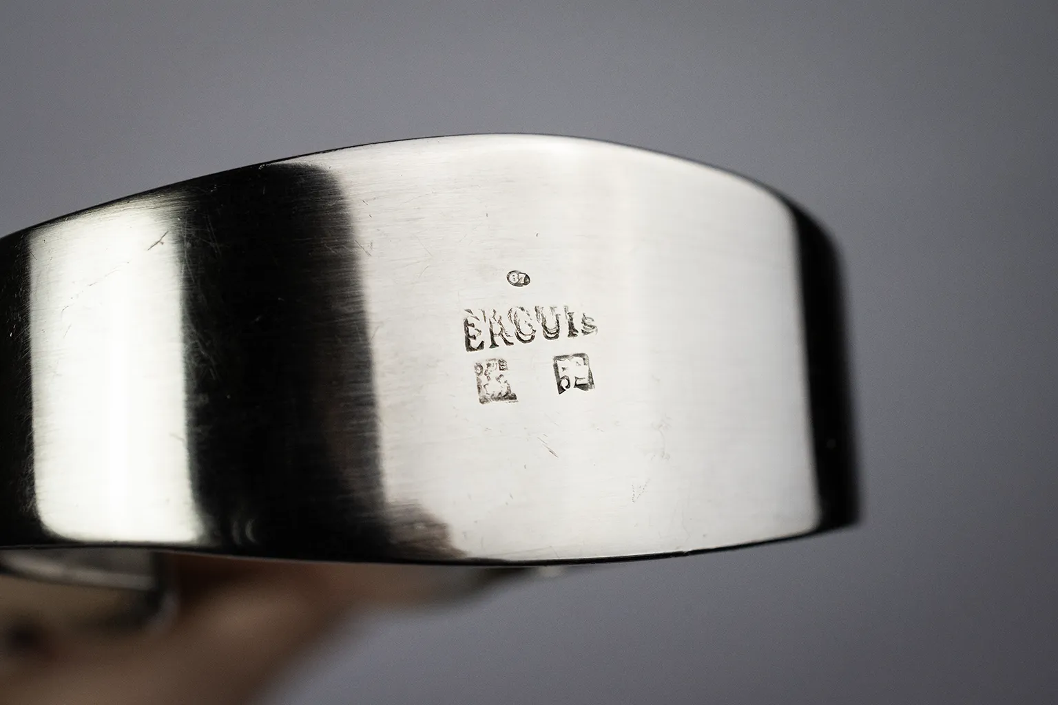 L’argenture, réalisée par galvanoplastie sur métal blanc, présente une belle homogénéité. Ercuis revendique un dépôt d’argent supérieur aux normes en vigueur, ce que la qualité de surface observable ici, après usage, tend à confirmer. Les poinçons frappés sur le plat intérieur du pontet comportent le nom ERCUIS en toutes lettres, un poinçon ovale et deux poinçons carrés — format réglementaire pour les pièces en métal argenté de qualité sous contrôle français. Le poinçon au centaure, emblème de la maison depuis 1886, est vraisemblablement présent parmi ces marques, bien qu’il ne soit pas distinctement lisible sur les photographies disponibles.