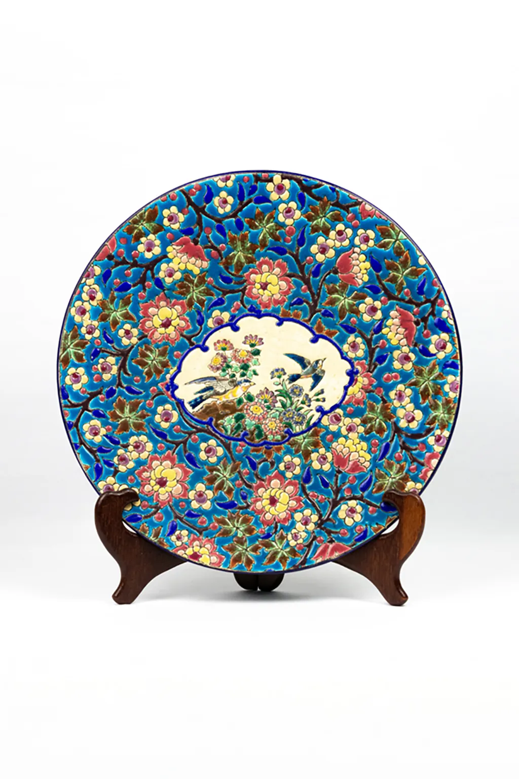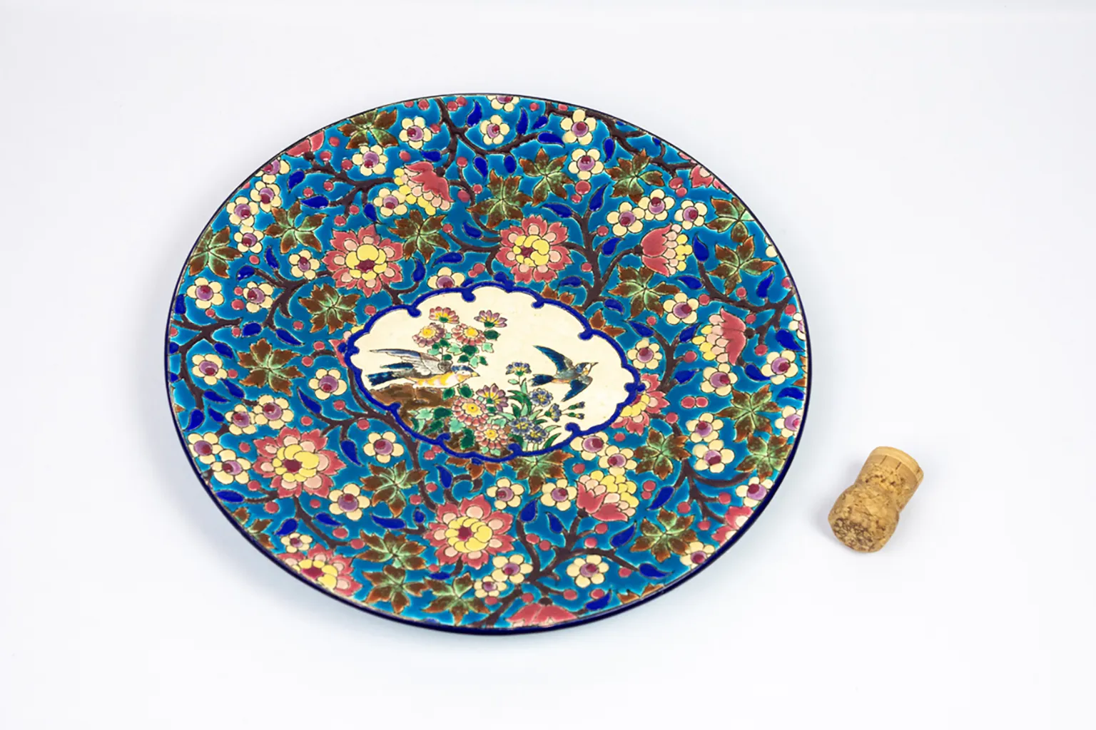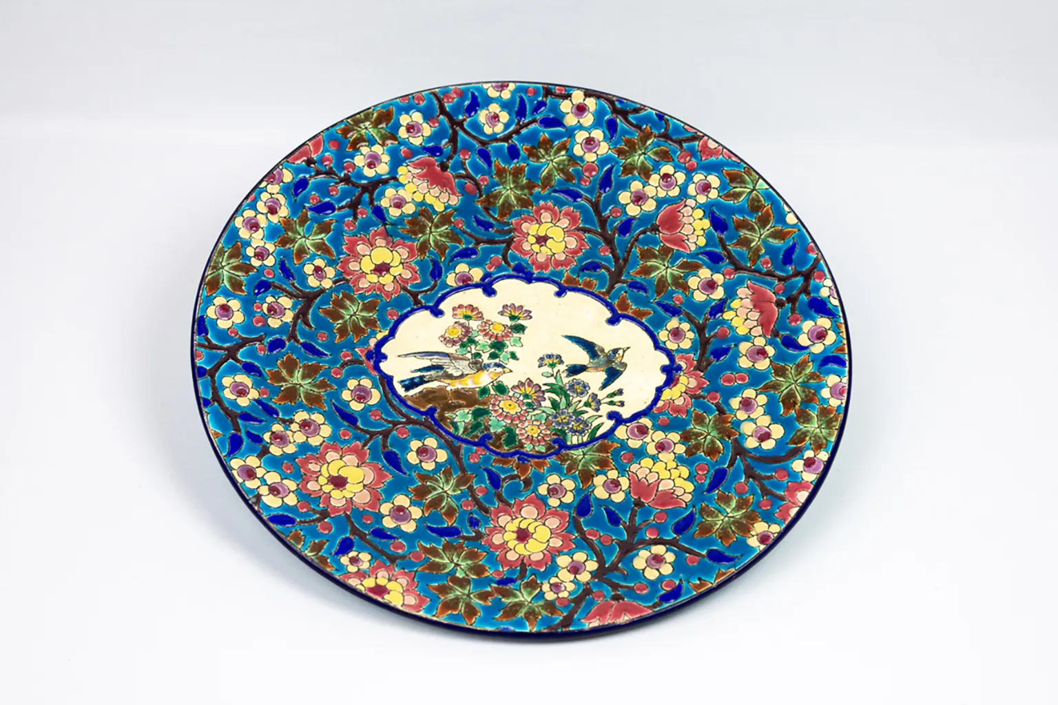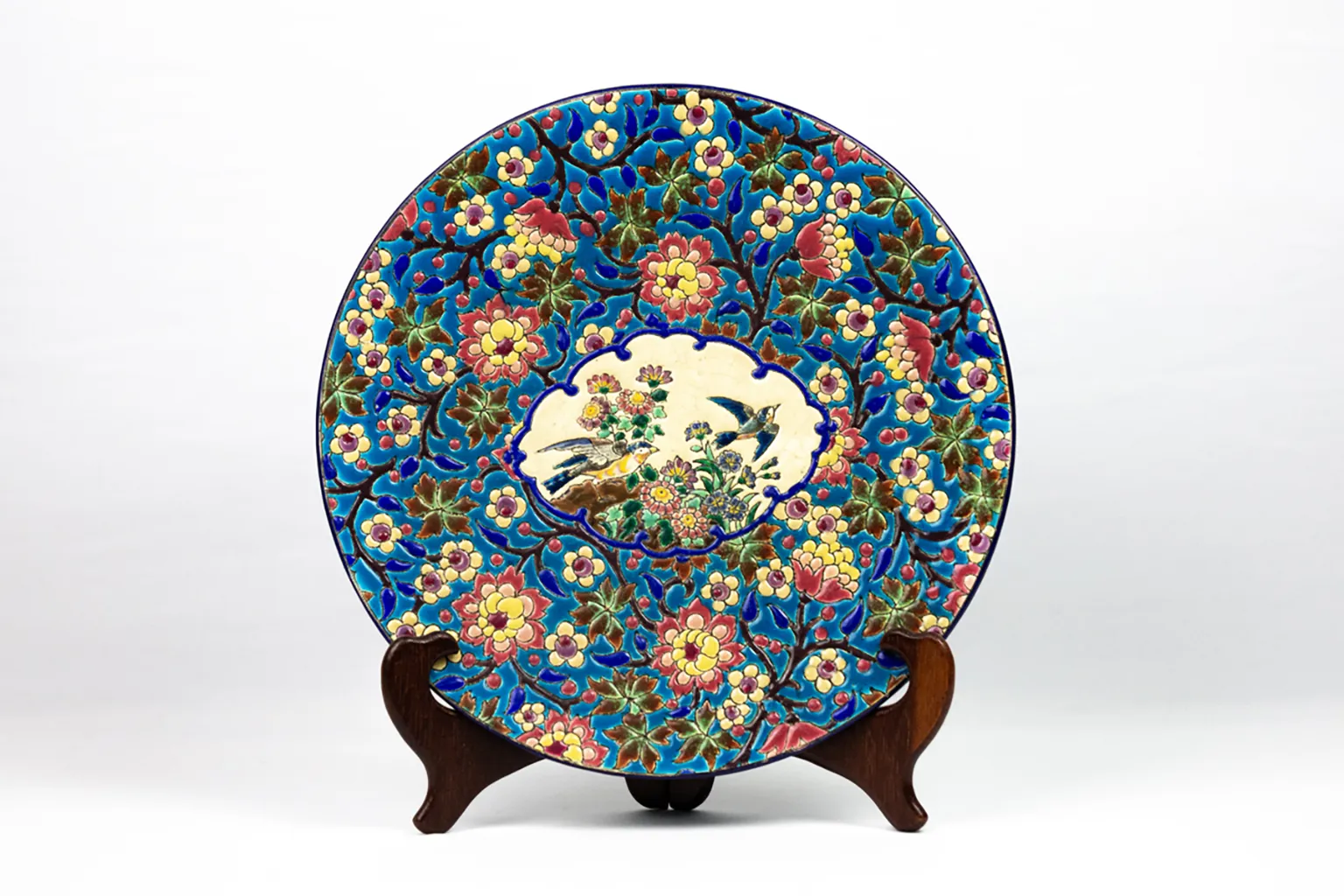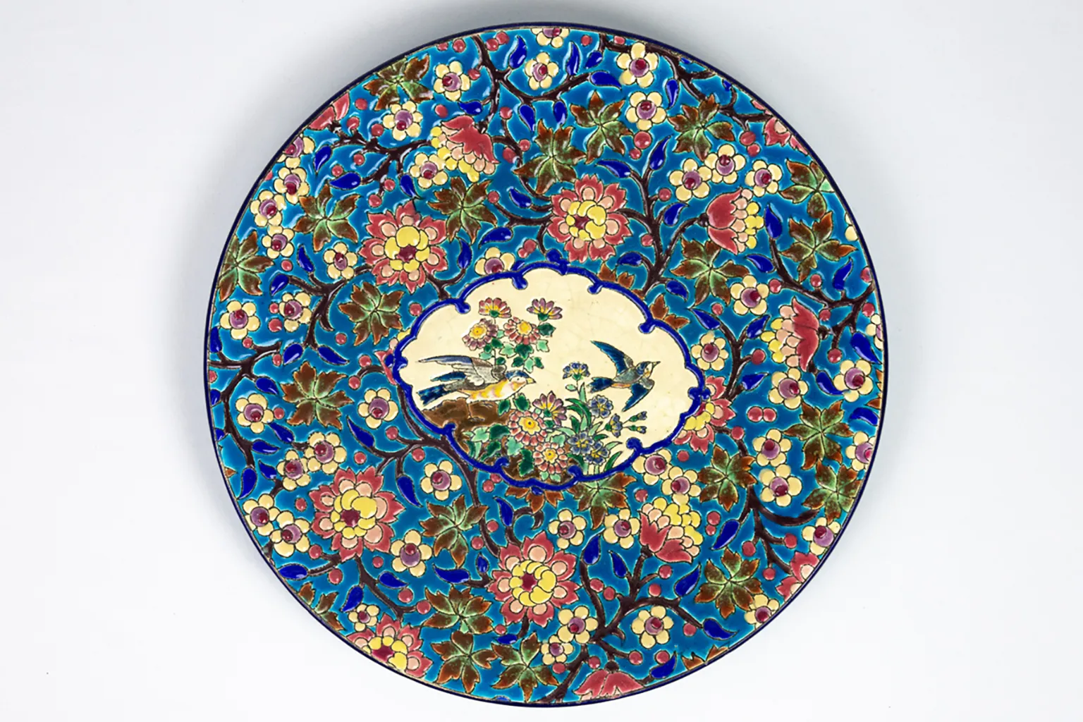 Le décor central, sur fond ivoire, figure deux oiseaux parmi un foisonnement de fleurs stylisées. L’ensemble est encadré d’un médaillon bleu profond souligné d’un décor floral sur fond turquoise — un motif typiquement longovicien, à la fois précis et vibrant. Chaque élément du décor est cerné d’un trait brun foncé formant de véritables cloisons, dans la tradition des émaux cloisonnés sur faïence qui ont fait la renommée de la manufacture.