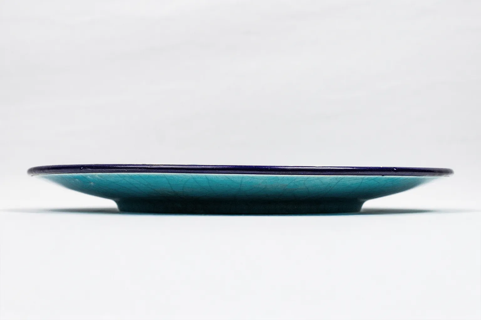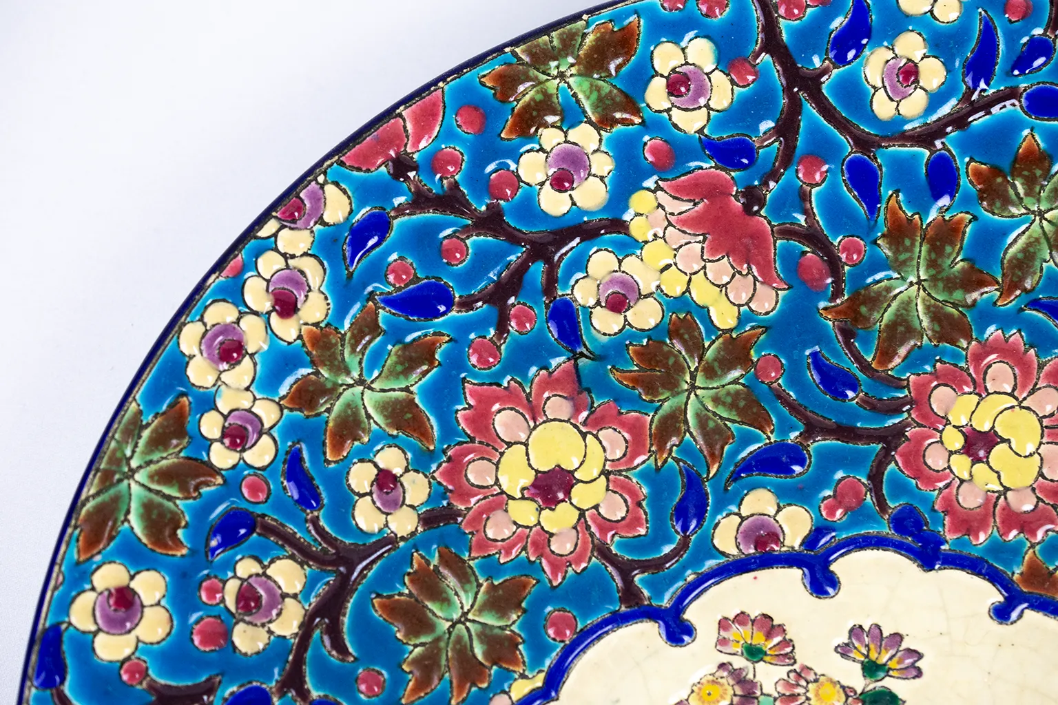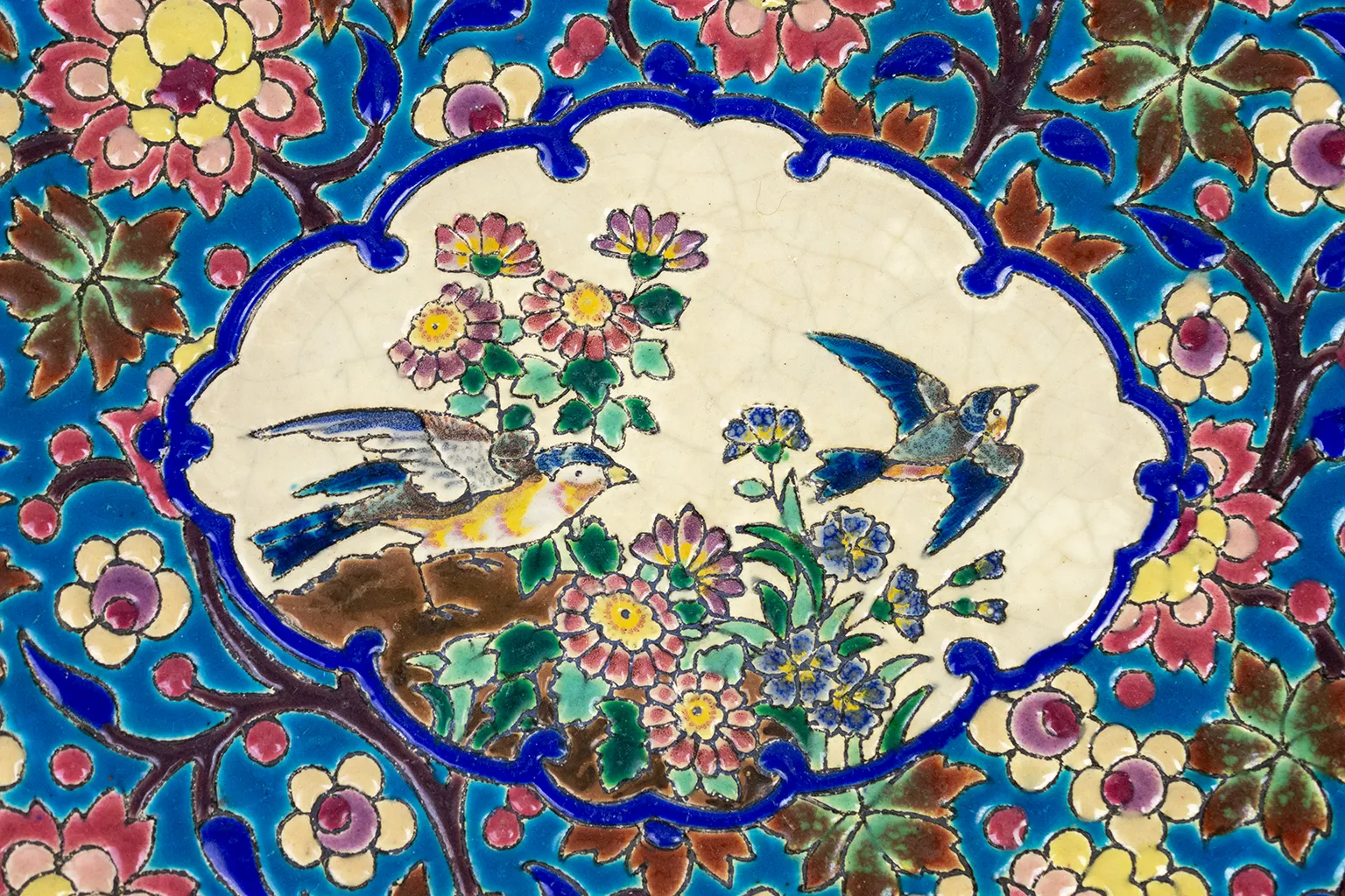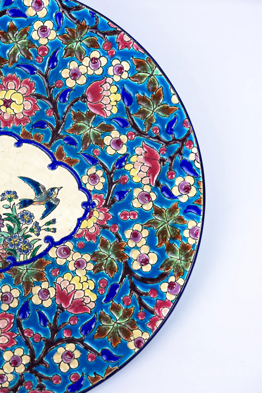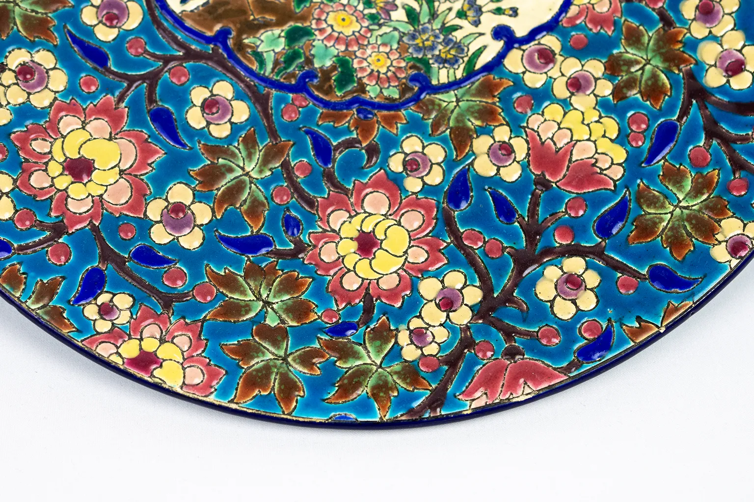 Le décor central, sur fond ivoire, figure deux oiseaux parmi un foisonnement de fleurs stylisées. L’ensemble est encadré d’un médaillon bleu profond souligné d’un décor floral sur fond turquoise — un motif typiquement longovicien, à la fois précis et vibrant. Chaque élément du décor est cerné d’un trait brun foncé formant de véritables cloisons, dans la tradition des émaux cloisonnés sur faïence qui ont fait la renommée de la manufacture.