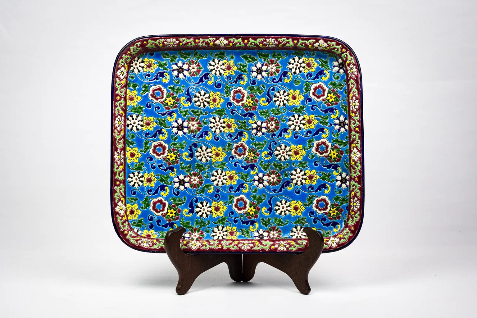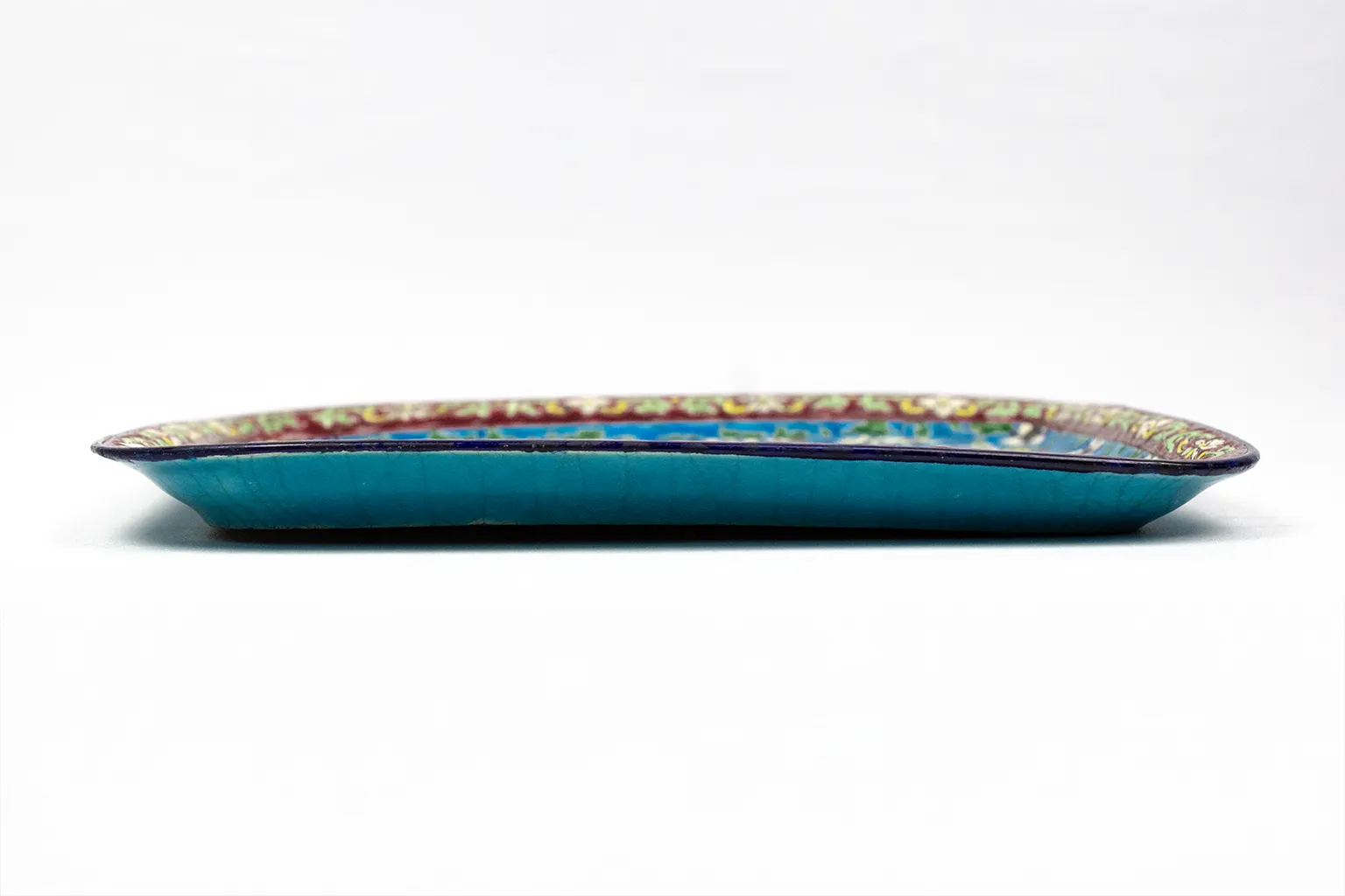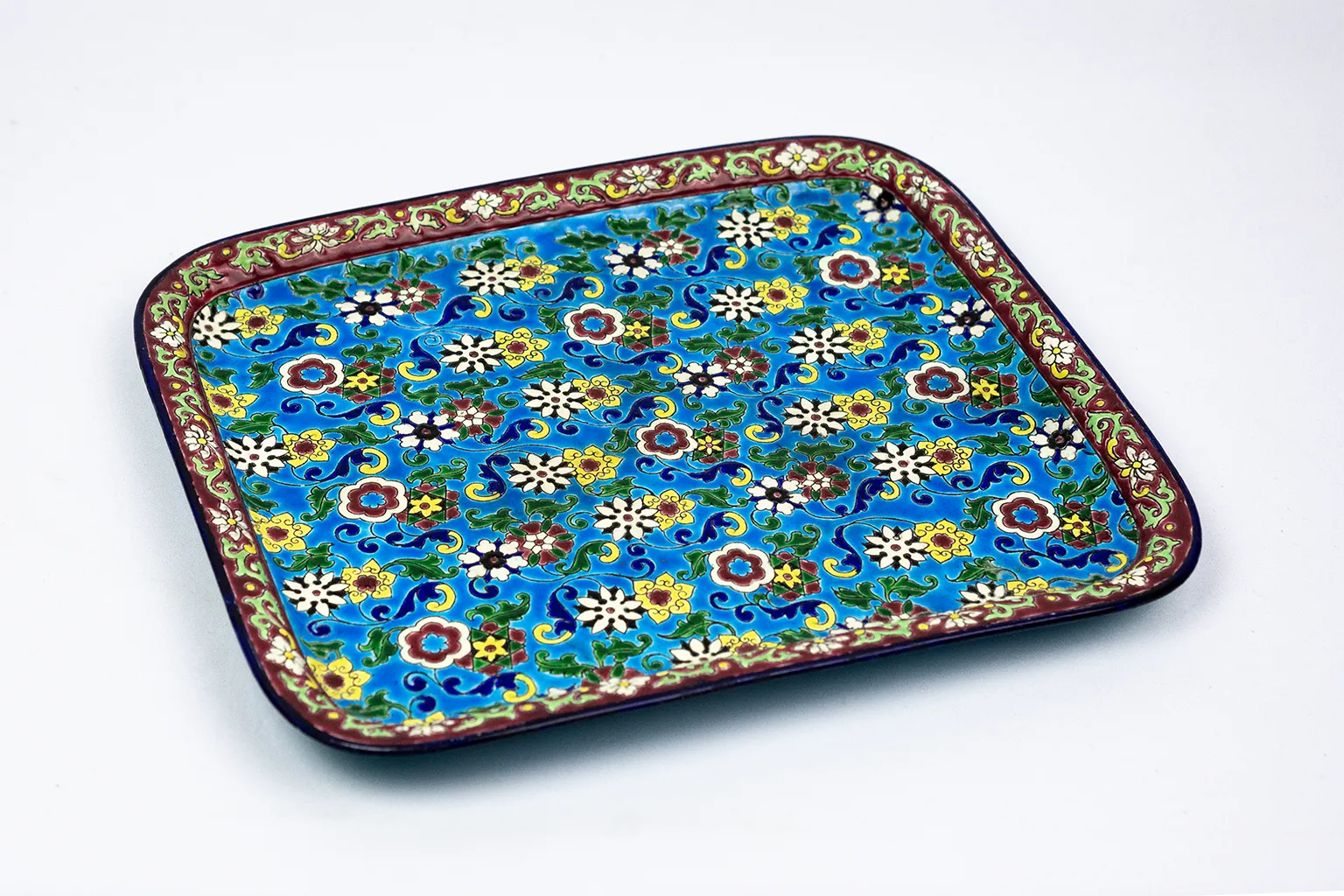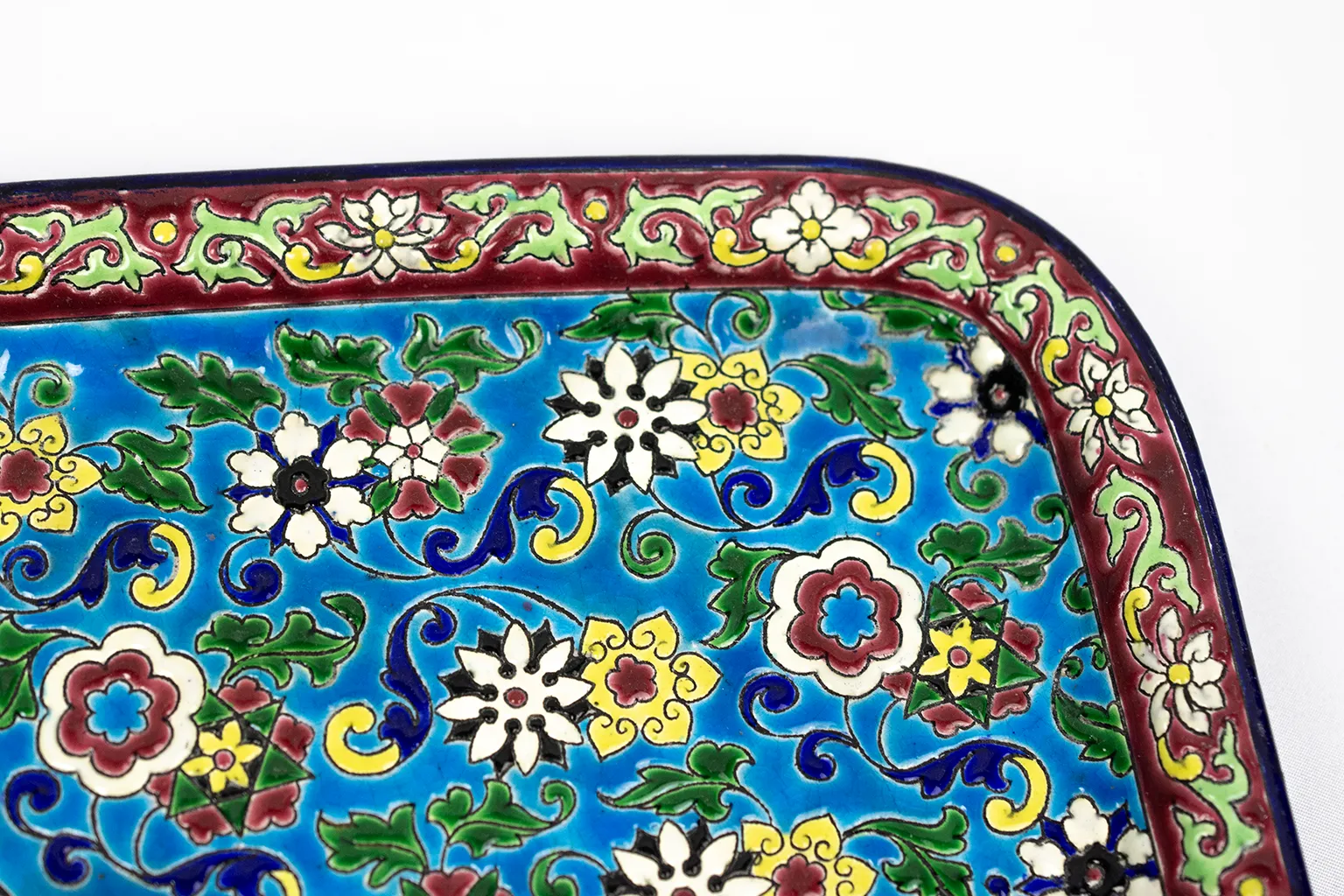 La manufacture, fondée en 1798, connaît alors un renouveau technique et artistique sous l’impulsion d’Amédée et Ernest d’Huart, qui développent un savoir-faire unique de pose d’émaux cloisonnés à la main, inspiré des arts d’Extrême-Orient. Le présent plateau illustre parfaitement cette tradition : l’équilibre entre la richesse chromatique et la précision du dessin en fait un objet d’art décoratif autant qu’un témoin d’histoire industrielle.