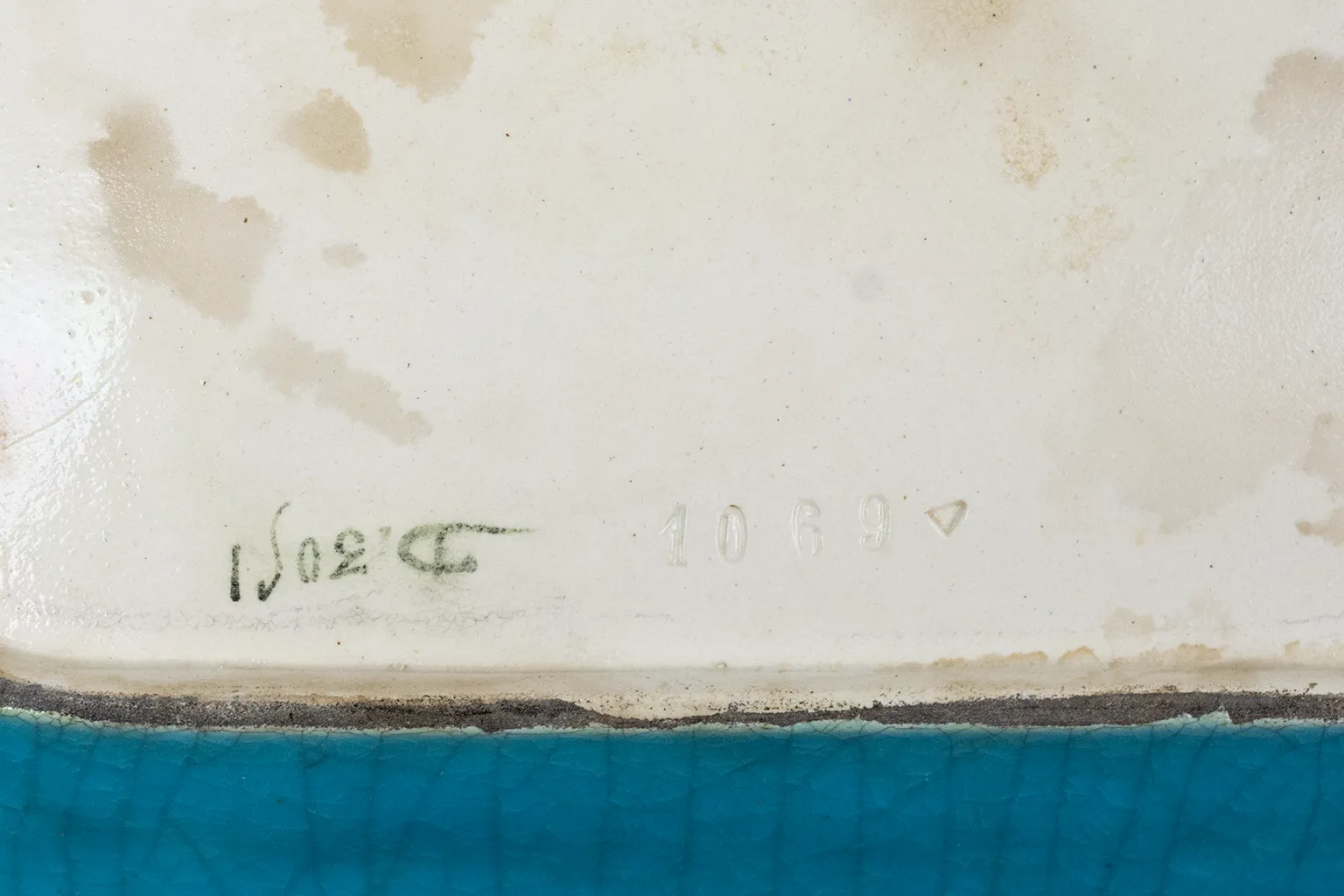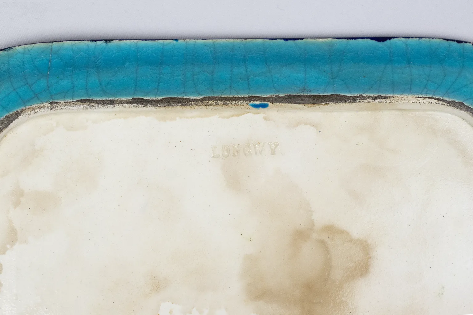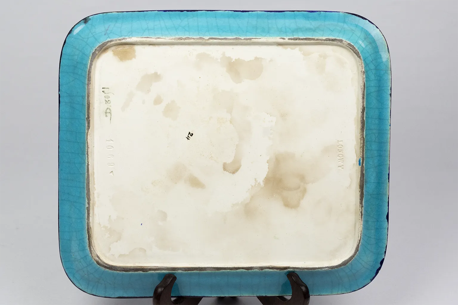 Ce plateau rectangulaire en céramique émaillée, signé et numéroté en creux par les Émaux de Longwy, illustre avec finesse la production de la fin du XIXᵉ siècle, à l’époque où la manufacture s’impose comme l’un des fleurons français des arts du feu.
