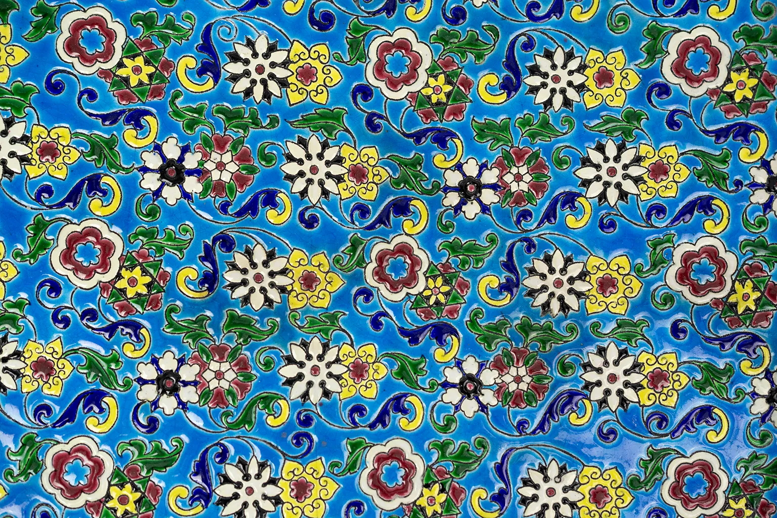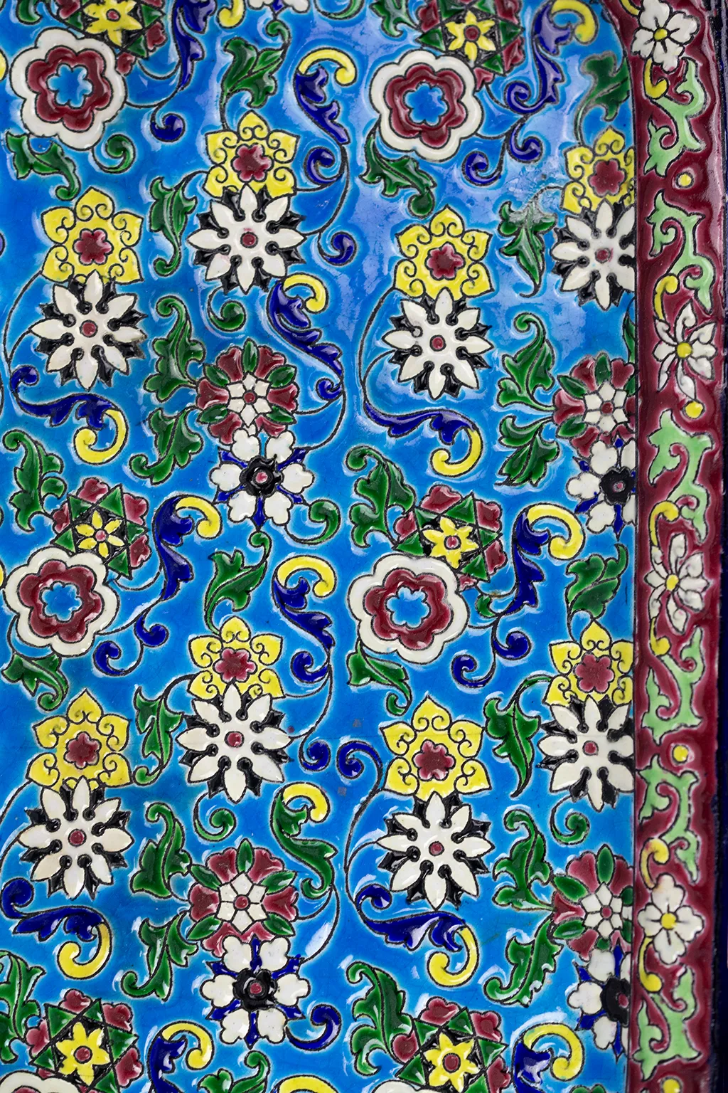 Le décor floral polychrome sur fond bleu profond, rehaussé d’une bordure rouge, témoigne de la maîtrise du cloisonné sur faïence qui fit la renommée de Longwy dès 1872. Chaque motif, cerné d’un fin réseau d’émail noir, se déploie en arabesques stylisées, évoquant les influences japonisantes et persanes très en vogue dans les années 1880.