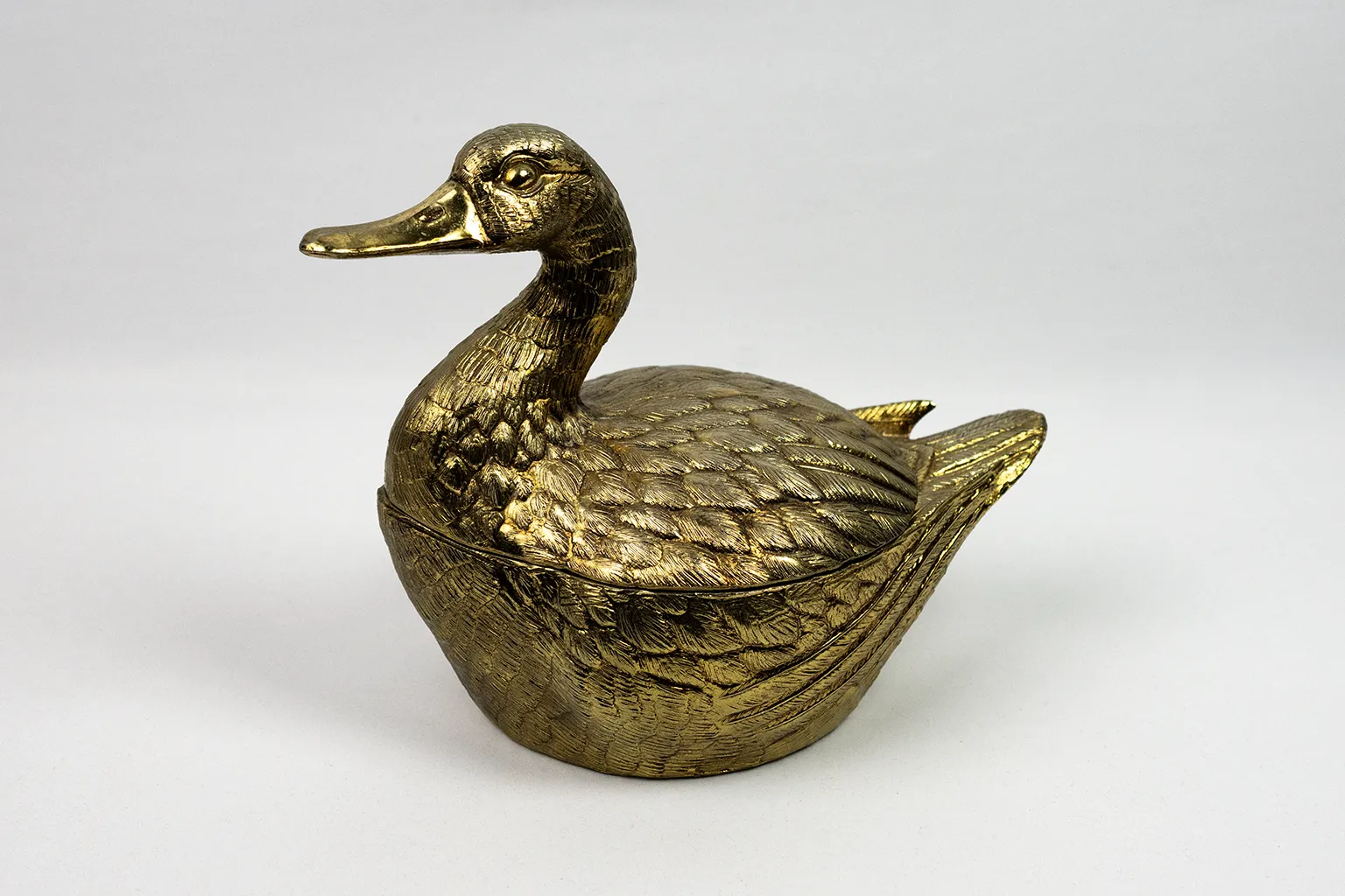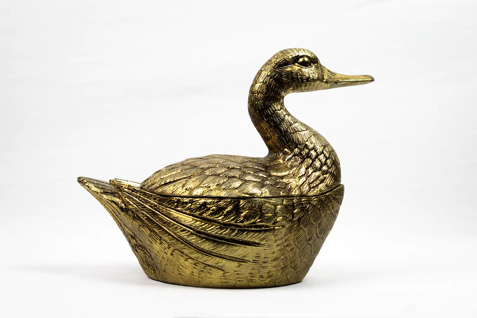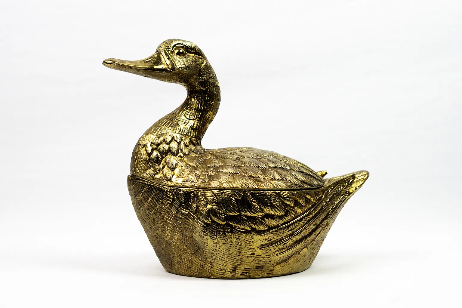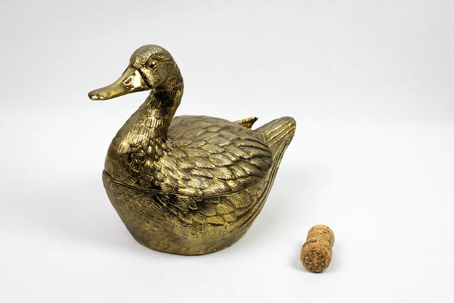 Ce seau à glaçons en forme de canard est une création de Mauro Manetti (né en 1946), designer florentin connu pour ses objets de table et accessoires de bar à la fois ludiques et raffinés. Réalisé en métal à patine dorée, il présente une remarquable texture ciselée, reproduisant avec précision les plumes et le modelé du plumage.
