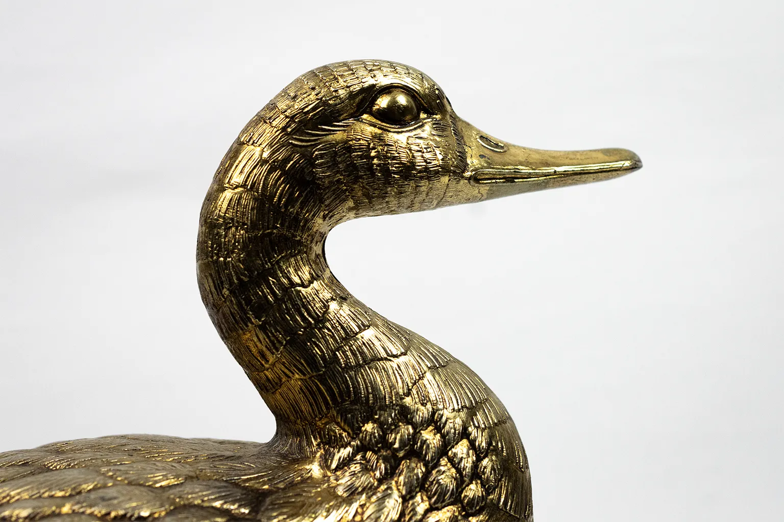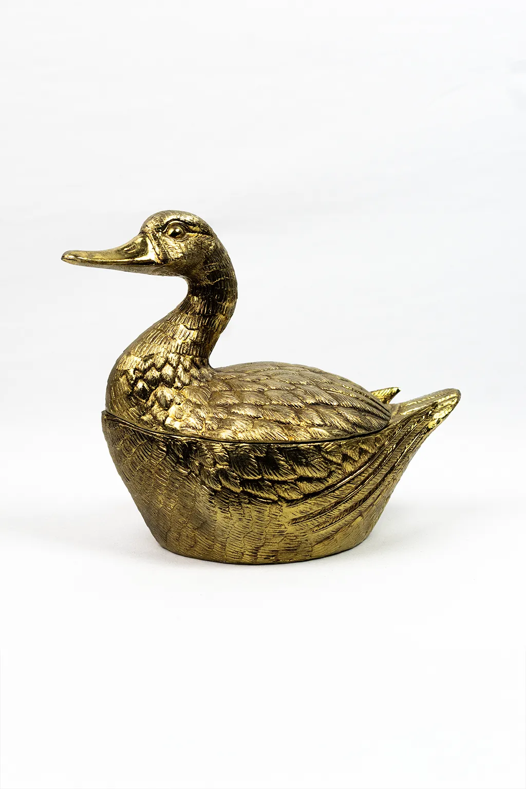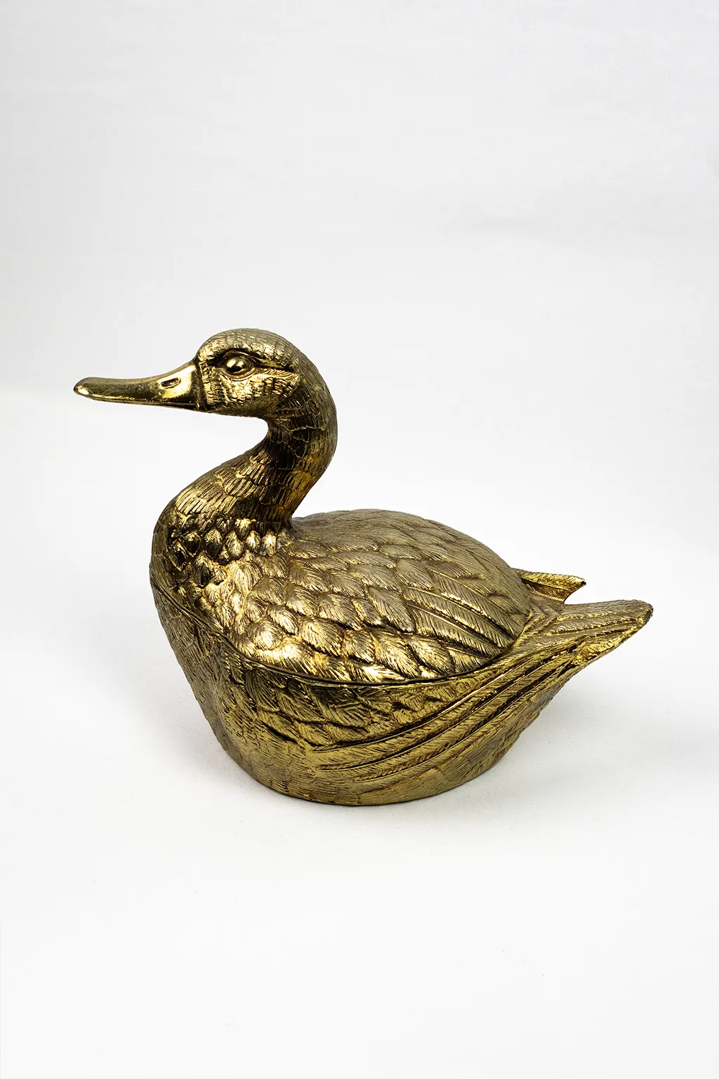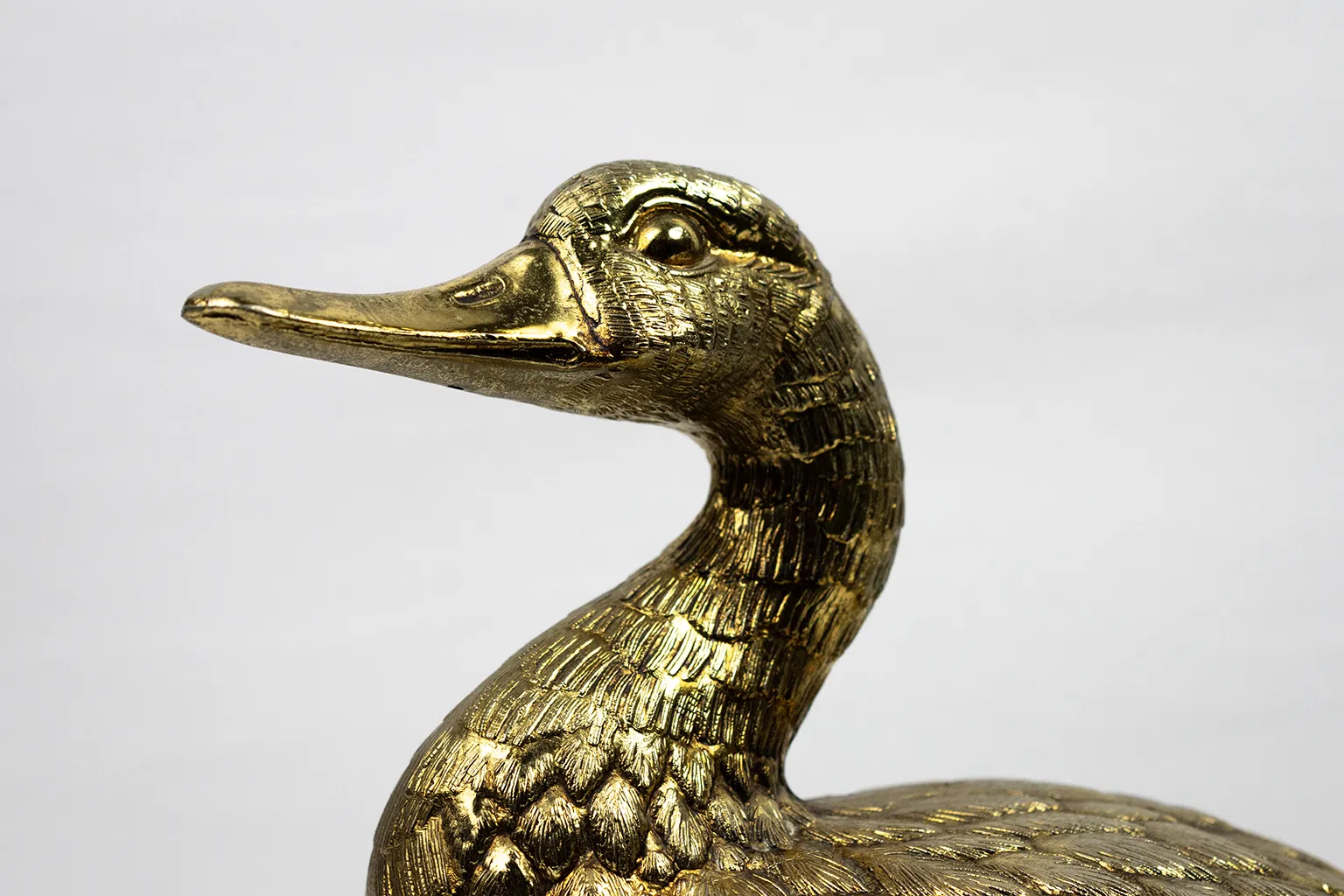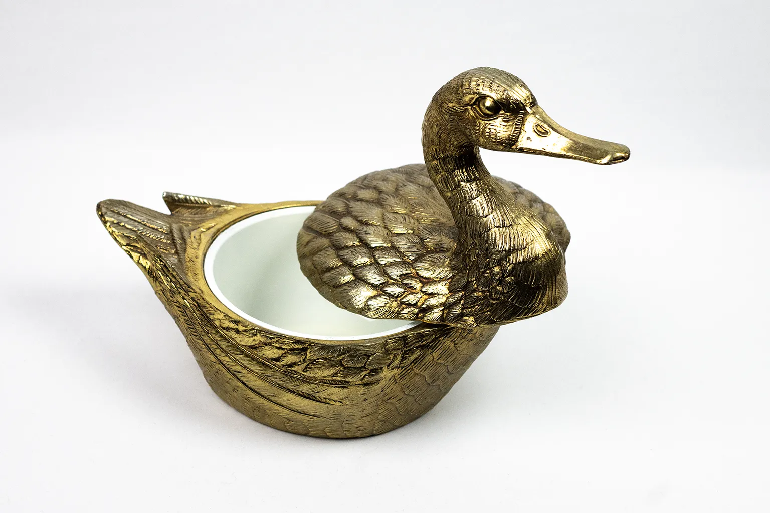 Ce seau à glaçons en forme de canard est une création de Mauro Manetti (né en 1946), designer florentin connu pour ses objets de table et accessoires de bar à la fois ludiques et raffinés. Réalisé en métal à patine dorée, il présente une remarquable texture ciselée, reproduisant avec précision les plumes et le modelé du plumage.