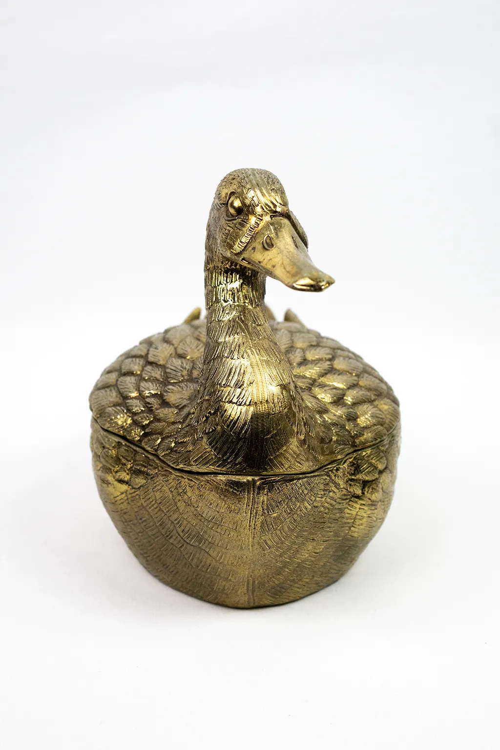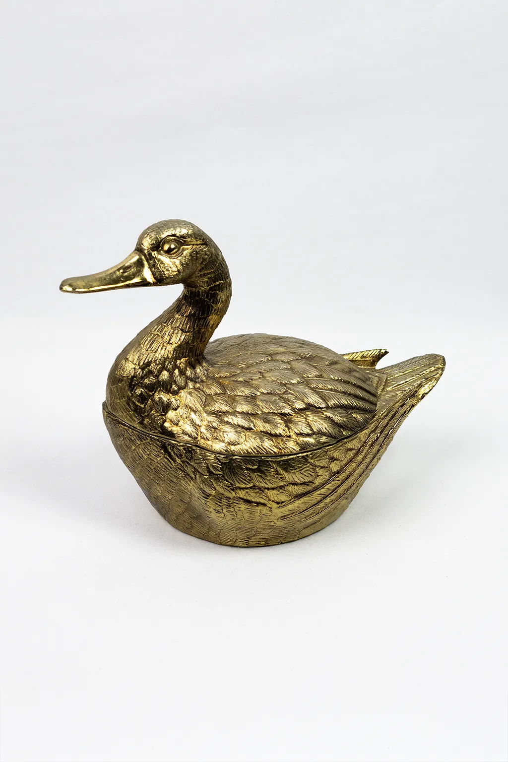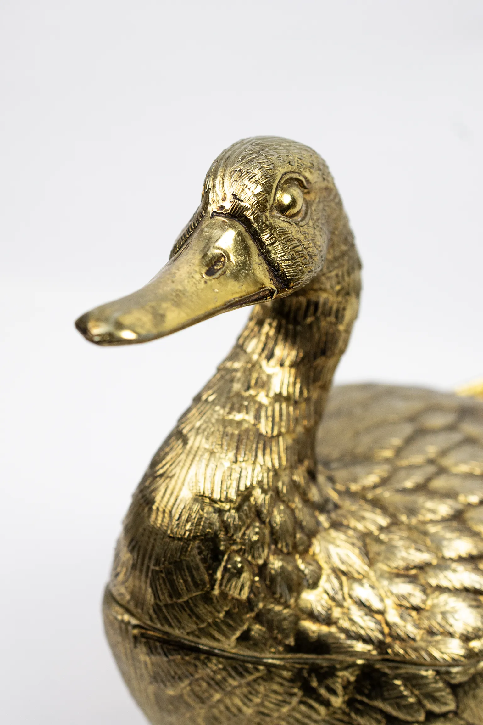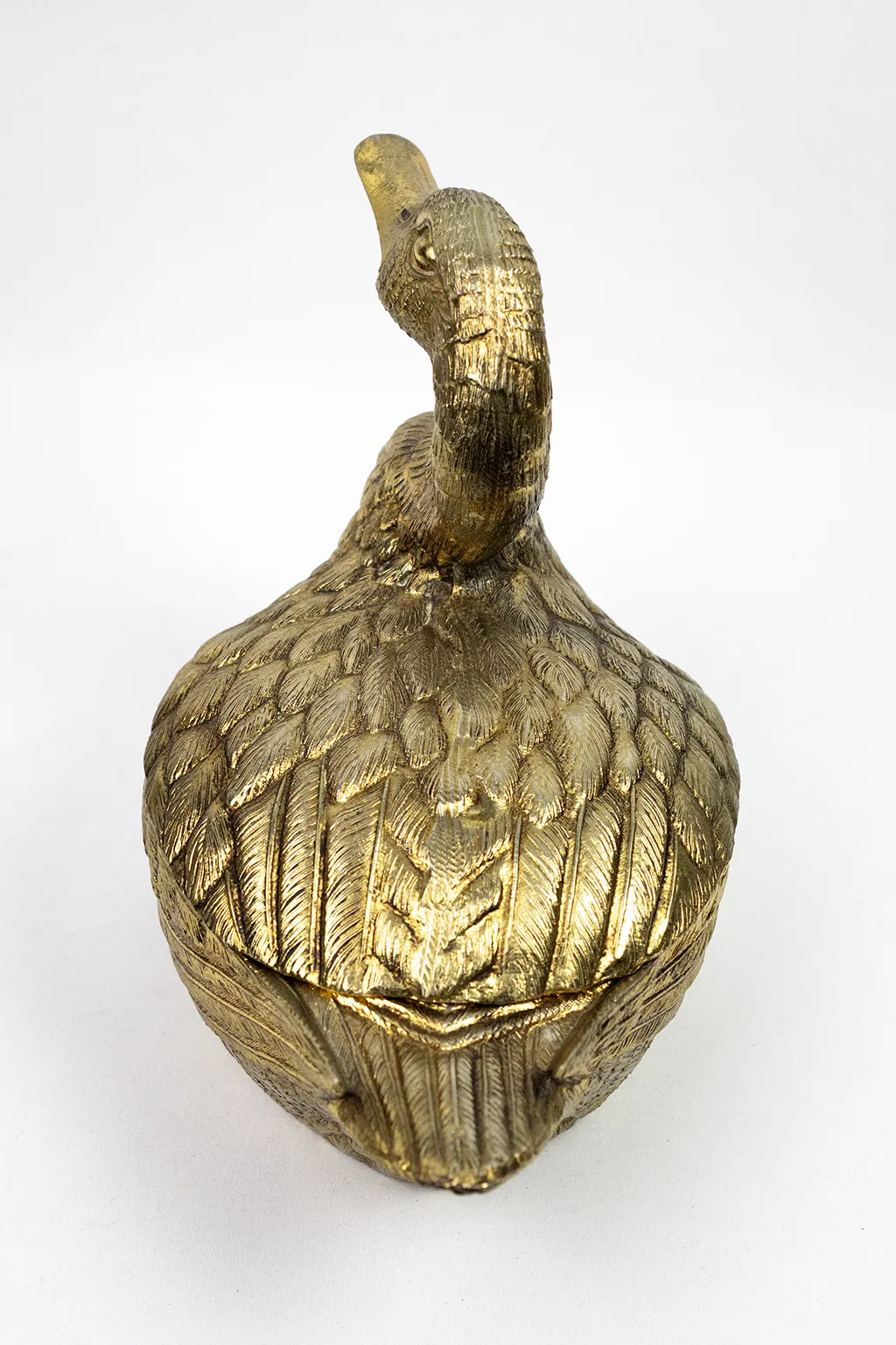 Ce seau à glaçons en forme de canard est une création de Mauro Manetti (né en 1946), designer florentin connu pour ses objets de table et accessoires de bar à la fois ludiques et raffinés. Réalisé en métal à patine dorée, il présente une remarquable texture ciselée, reproduisant avec précision les plumes et le modelé du plumage.