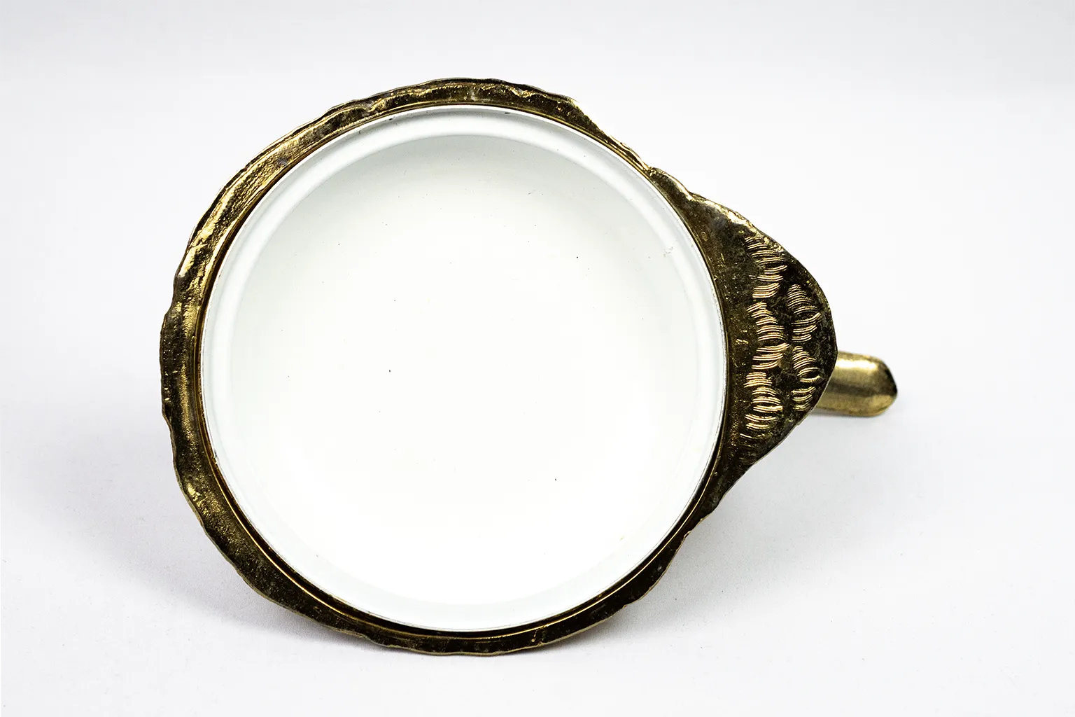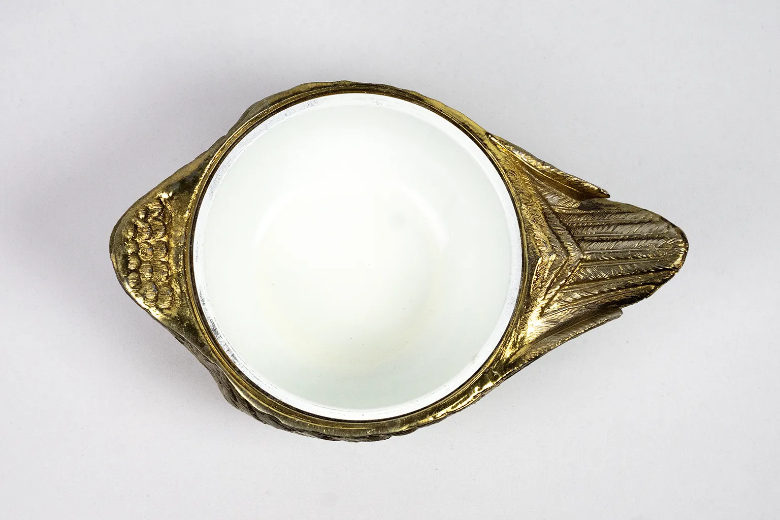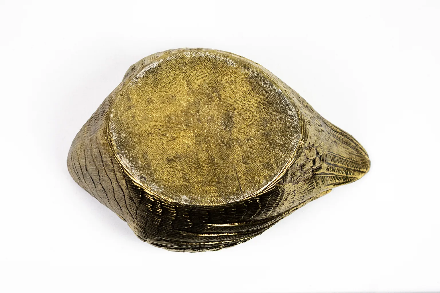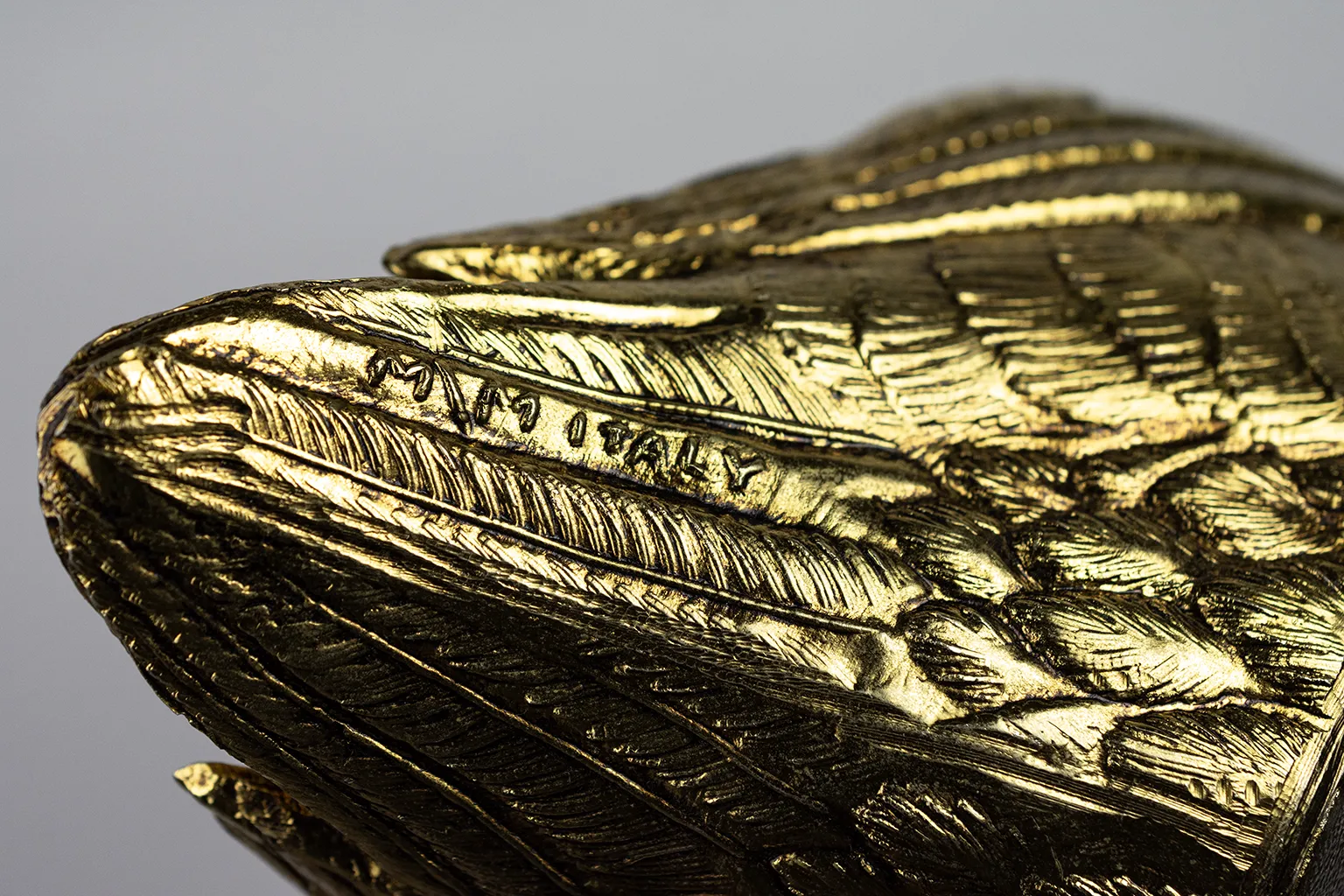 Ce modèle, signé sous la queue “M. M. – Made in Italy”, séduit par son équilibre entre réalisme naturaliste et stylisation décorative. Son éclat doré reflète la lumière avec douceur, soulignant la minutie du travail de ciselure. Objet de collection, il trouve sa place autant sur une table contemporaine que dans un intérieur vintage.