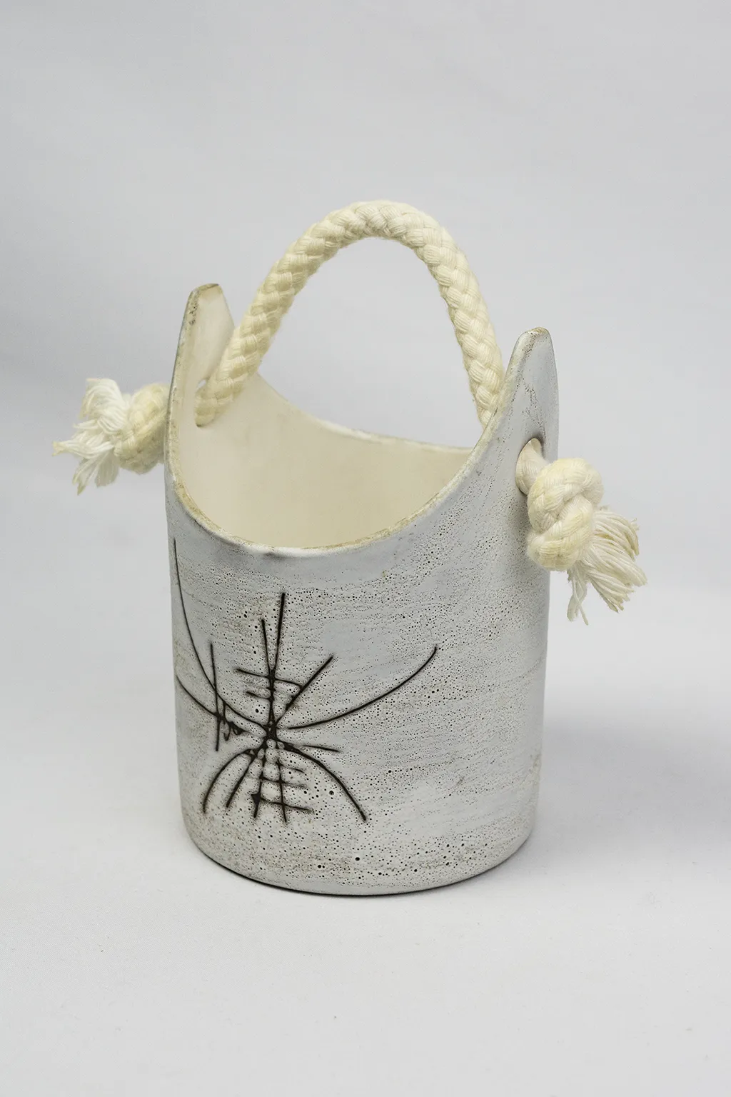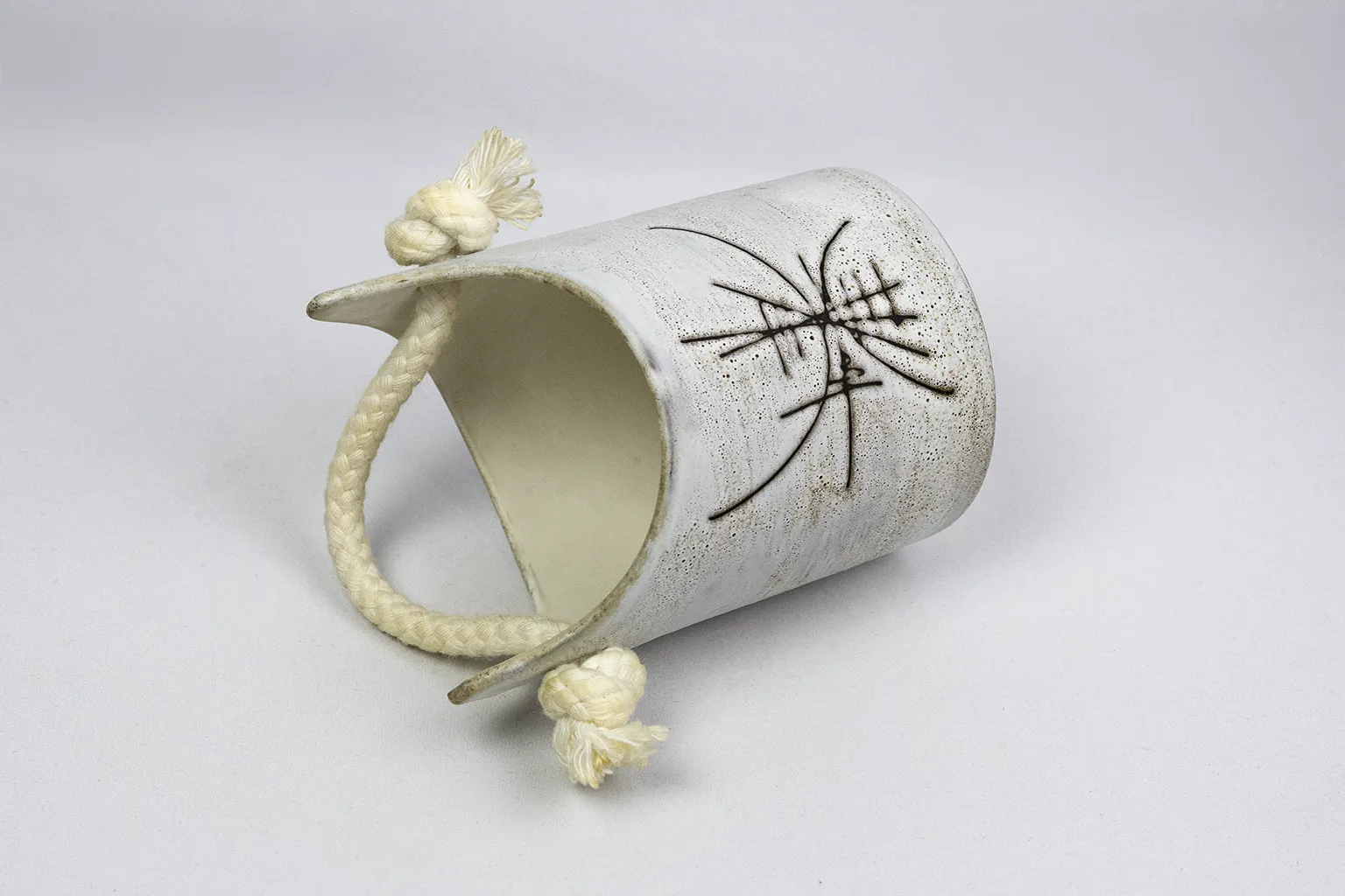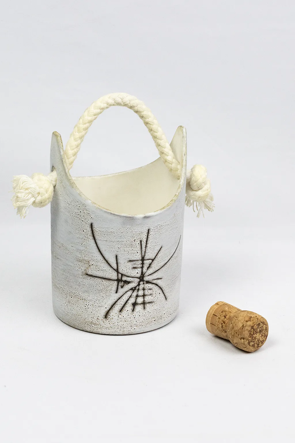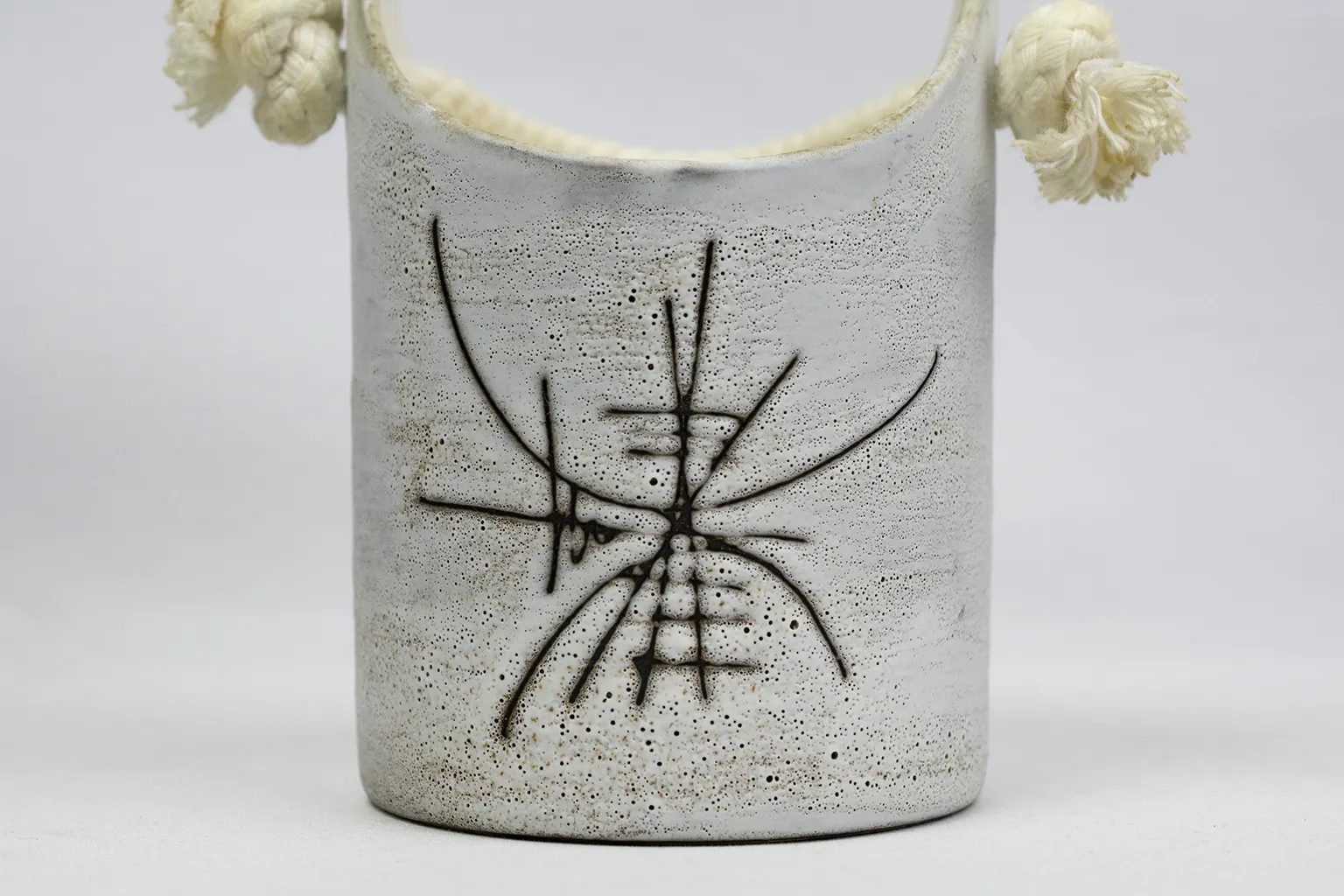 Ce seau à glaçons en offre une illustration directe. Le corps cylindrique, légèrement évasé vers le haut, est revêtu d’une glaçure blanche à surface bullée et poreuse — ce que les descriptions de marché qualifient d’aspect « écorce de bouleau ». La texture, loin d’être un défaut, est constitutive du registre plastique de Cimal : elle confère à la surface une densité sourde, presque minérale, qui contraste avec la fluidité des incisions. Le décor, tracé à cru dans la pâte avant cuisson, déploie un réseau de lignes sèches — croisillons, rayons, arcs tendus — dont la composition évoque les signes graphiques de l’abstraction gestuelle contemporaine, au voisinage de l’écriture automatique et du tracé calligraphique. Deux protubérances latérales, percées d’un œillet, accueillent une anse de corde tressée d’origine, en coton ivoire, terminée par des nœuds frangés — un élément de préhension fonctionnel qui introduit simultanément une texture textile dans le dialogue avec la céramique.