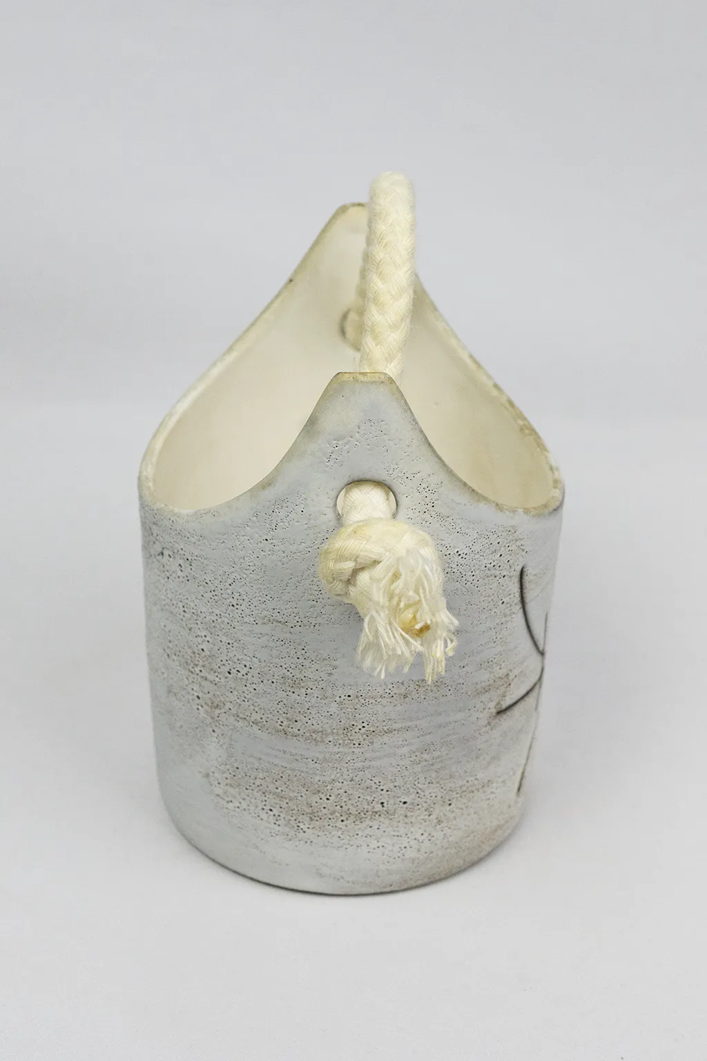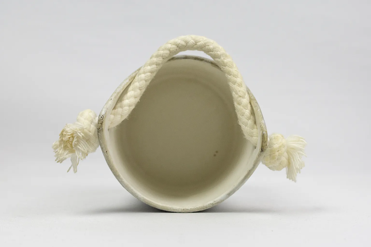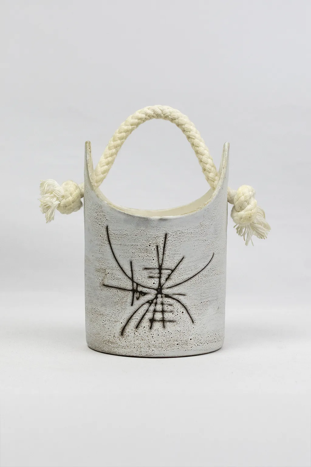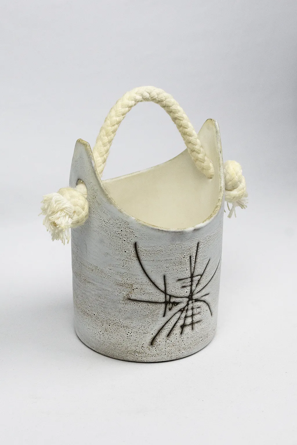 Ce seau à glaçons en offre une illustration directe. Le corps cylindrique, légèrement évasé vers le haut, est revêtu d’une glaçure blanche à surface bullée et poreuse — ce que les descriptions de marché qualifient d’aspect « écorce de bouleau ». La texture, loin d’être un défaut, est constitutive du registre plastique de Cimal : elle confère à la surface une densité sourde, presque minérale, qui contraste avec la fluidité des incisions. Le décor, tracé à cru dans la pâte avant cuisson, déploie un réseau de lignes sèches — croisillons, rayons, arcs tendus — dont la composition évoque les signes graphiques de l’abstraction gestuelle contemporaine, au voisinage de l’écriture automatique et du tracé calligraphique. Deux protubérances latérales, percées d’un œillet, accueillent une anse de corde tressée d’origine, en coton ivoire, terminée par des nœuds frangés — un élément de préhension fonctionnel qui introduit simultanément une texture textile dans le dialogue avec la céramique.