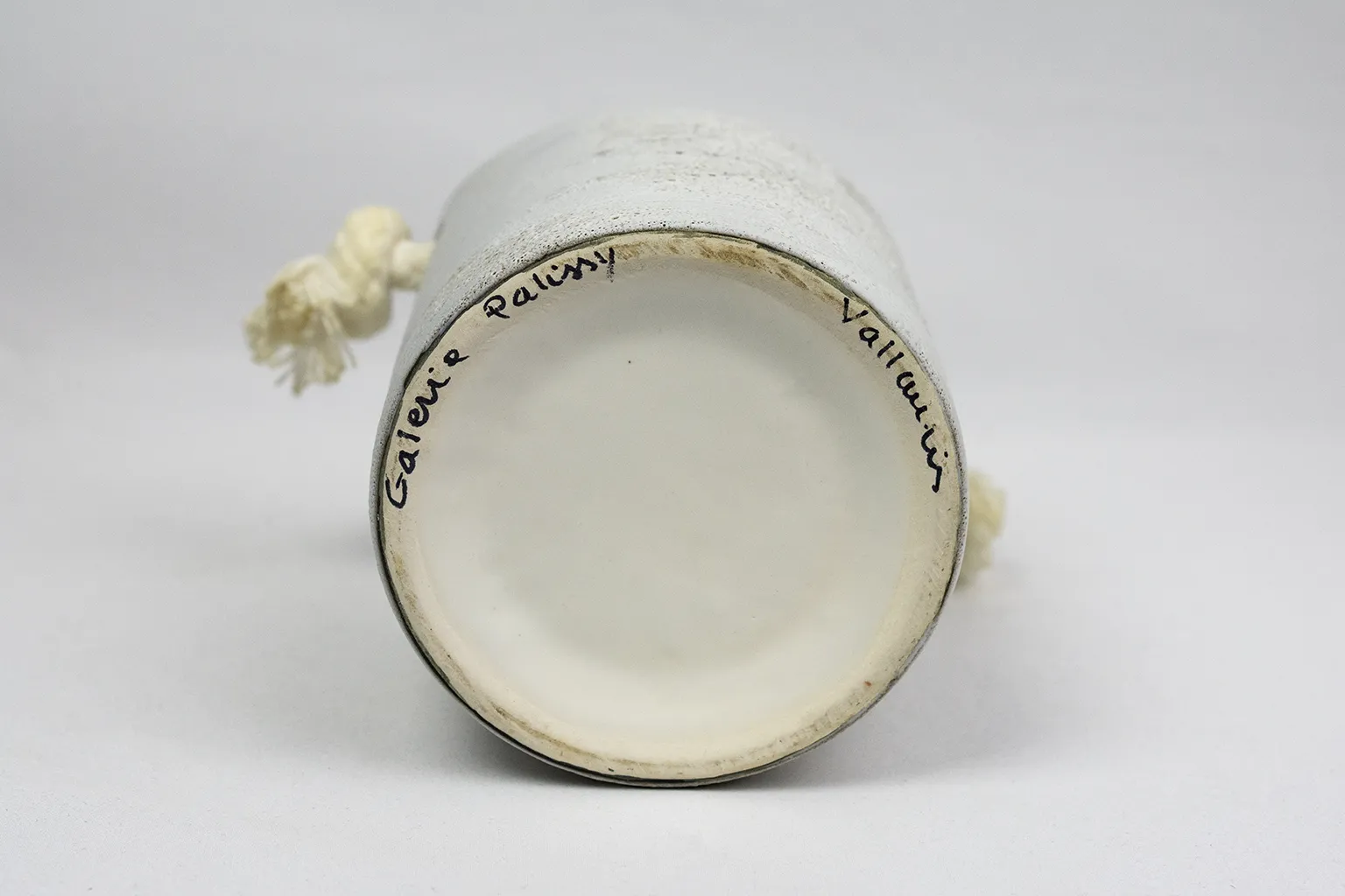 L’intérieur est couvert d’un émail crème mat uniforme. Au fond, une mention manuscrite à l’encre — « Galerie Palissy / Vallauris » — atteste du circuit commercial d’origine. L’objet est signé par la galerie plutôt que par le céramiste lui-même, usage courant dans les productions de série confiées à des ateliers partenaires.