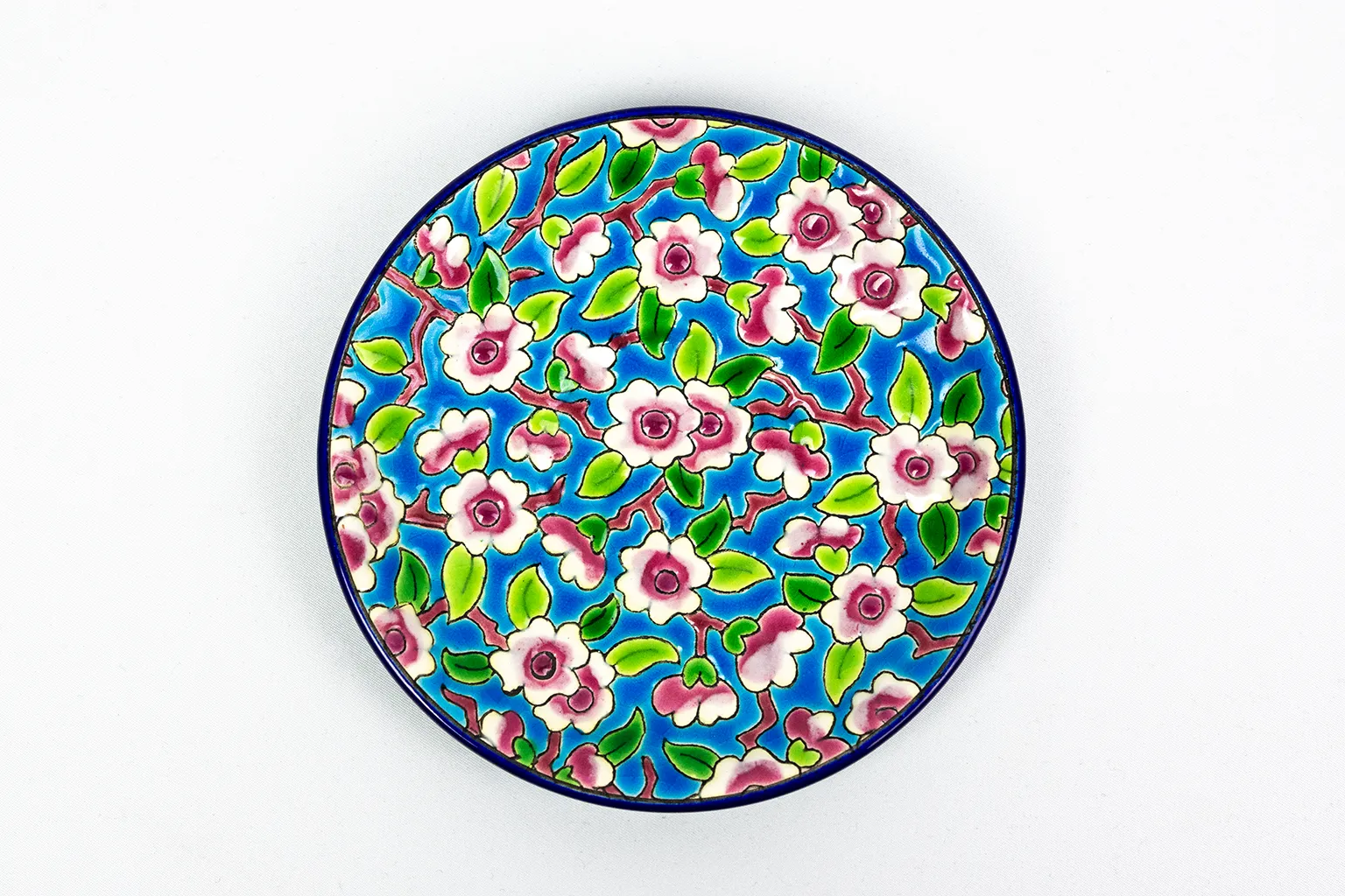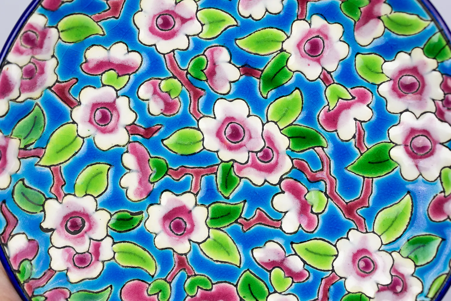 Le décor D188, intitulé « Fleurs de Pommiers » dans le catalogue de la manufacture — toujours en production aujourd’hui —, couvre l’intégralité des surfaces extérieures. Sur un fond d’émail bleu turquoise intense, des branches sinueuses brun-carmin portent des fleurs à cinq pétales blancs à cœur rosé-carmin, accompagnées de feuilles vert frais aux nervures finement cernées de noir. Le décor couvrant ne ménage aucune réserve, aucune hiérarchie spatiale : il sature le support d’une floraison continue qui évoque à la fois l’imagerie japonisante héritée du XIXe siècle et l’exubérance chromatique propre aux arts décoratifs des années 1920-1930.