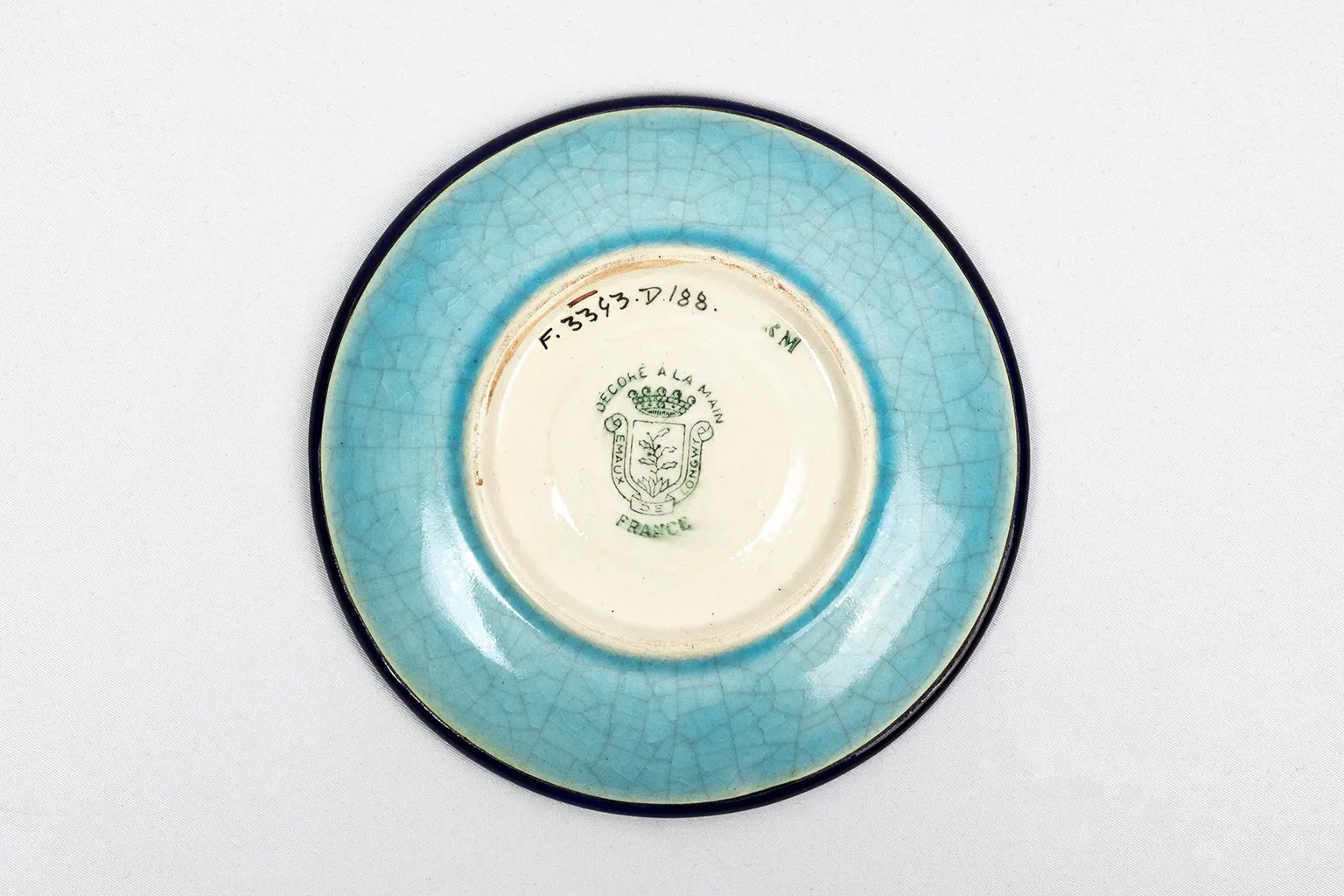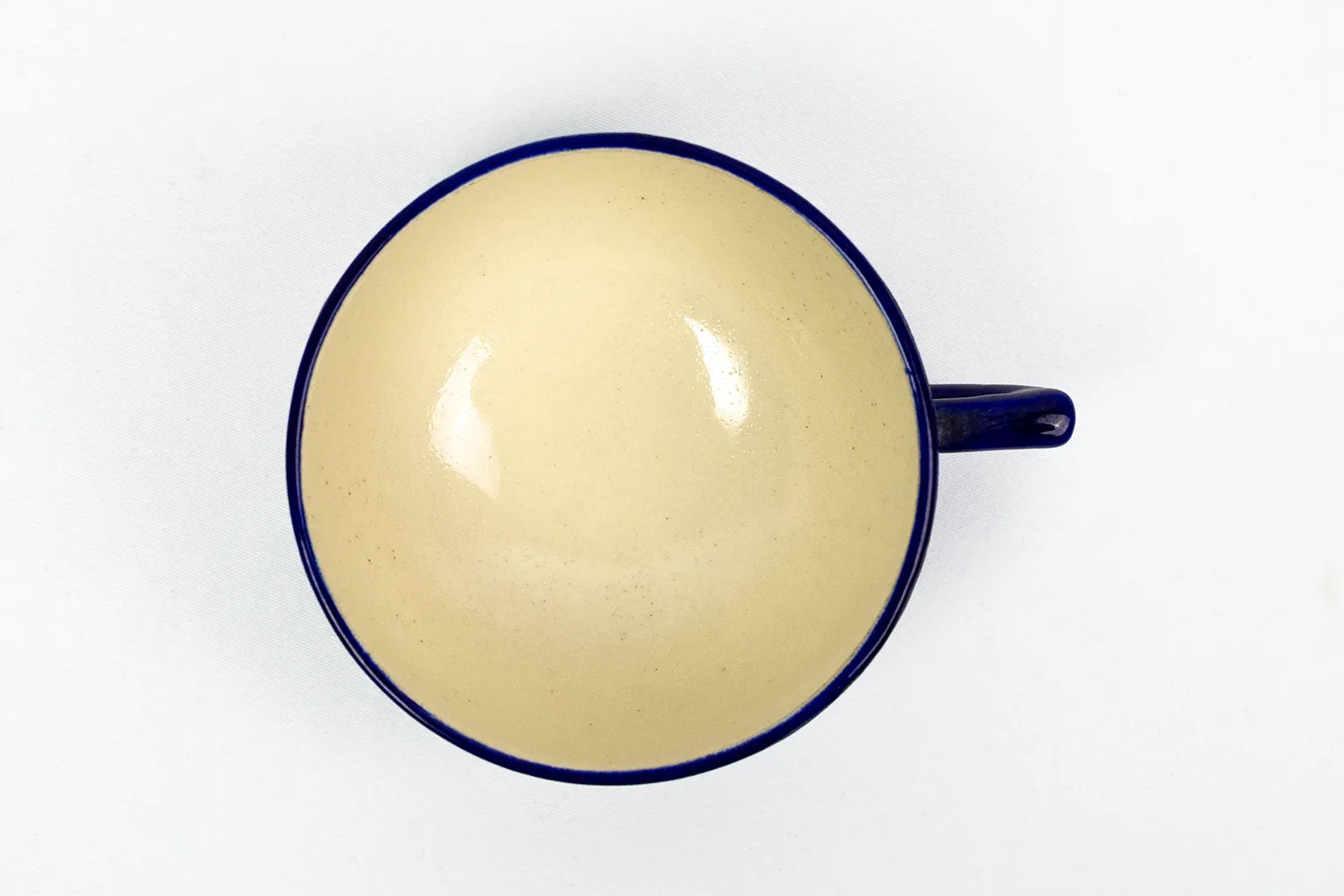 La tasse, de forme hémisphérique à paroi légèrement évasée, est dotée d’une anse pleine émaillée bleu cobalt uni — même traitement pour le bord supérieur, qui borde l’intérieur en émail crème ivoire non décoré. La soucoupe, à marli plat et rebord cobalt, présente au revers un fond en émail turquoise craquelé, caractéristique de la production Longwy de l’entre-deux-guerres.