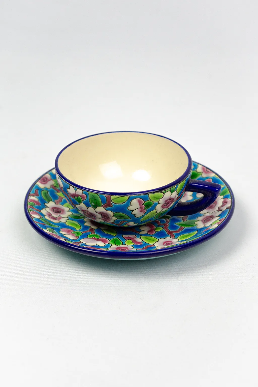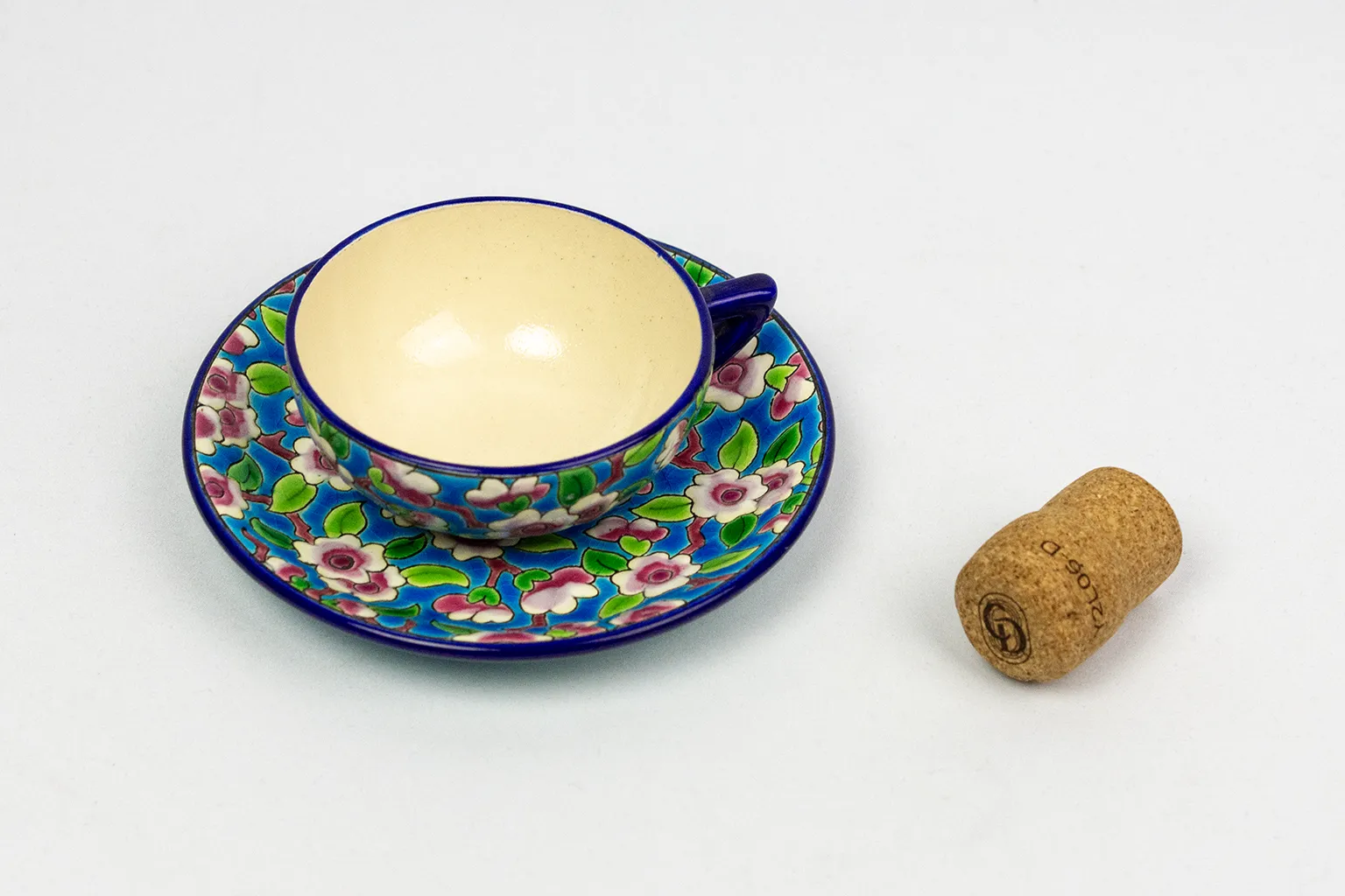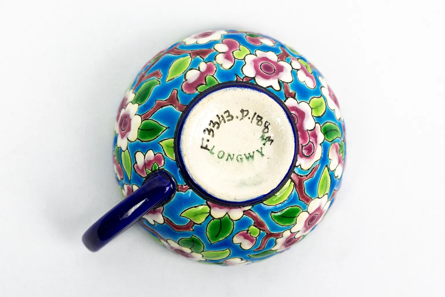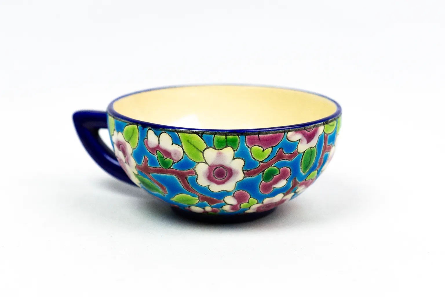 Tasse et soucoupe en faïence émaillée cloisonnée, décor D188 « Fleurs de Pommiers » sur fond bleu turquoise, marque imprimée et référence manuscrite. Émaux de Longwy, période Art Déco, décorée à la main.
