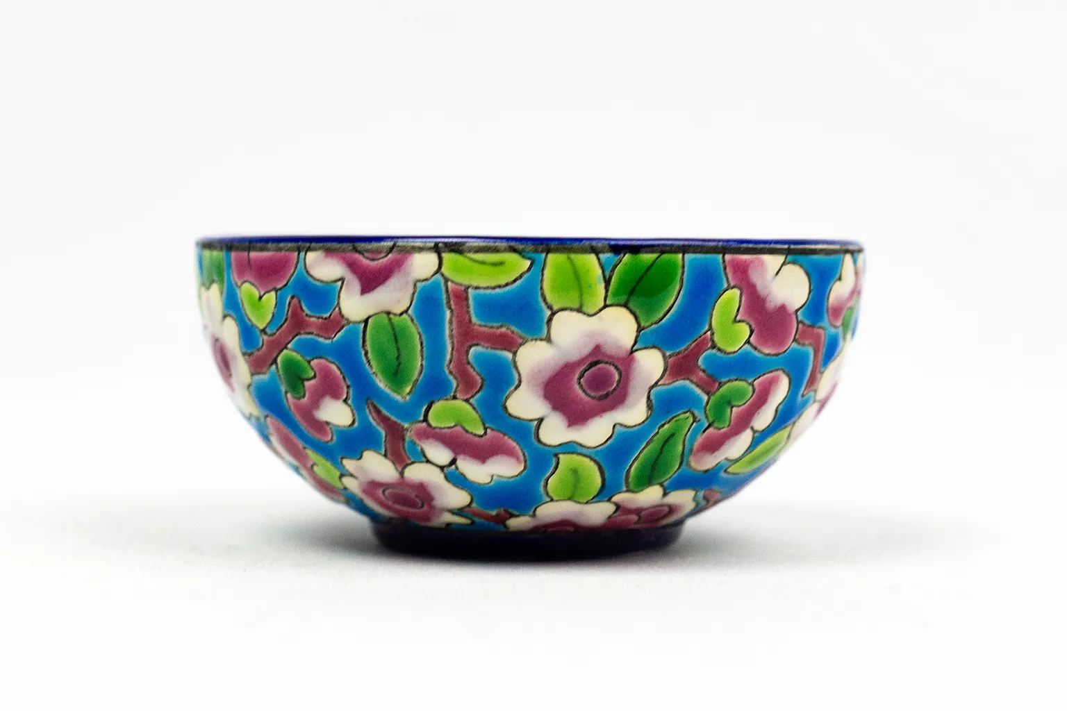 Fondée en 1798 à Longwy, en Lorraine, la manufacture qui deviendra les Émaux de Longwy développe à partir des années 1870 une technique décorative singulière : l’émail cloisonné sur faïence, directement inspiré des émaux métalliques d’Extrême-Orient. Les cloisons, tracées sur le corps céramique avant cuisson, retiennent les émaux colorés qui, après passage au four, présentent cette surface légèrement bombée et vitrifiée caractéristique. C’est dans ce procédé que s’inscrit la présente tasse et sa soucoupe.